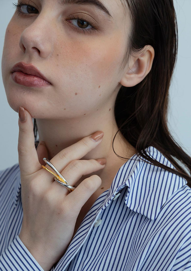 ニュアンスフォルムがかわいいPuretreのダブルリング。大振りのリングはシルバーで一点投入すると主張しすぎずつけやすいです。
