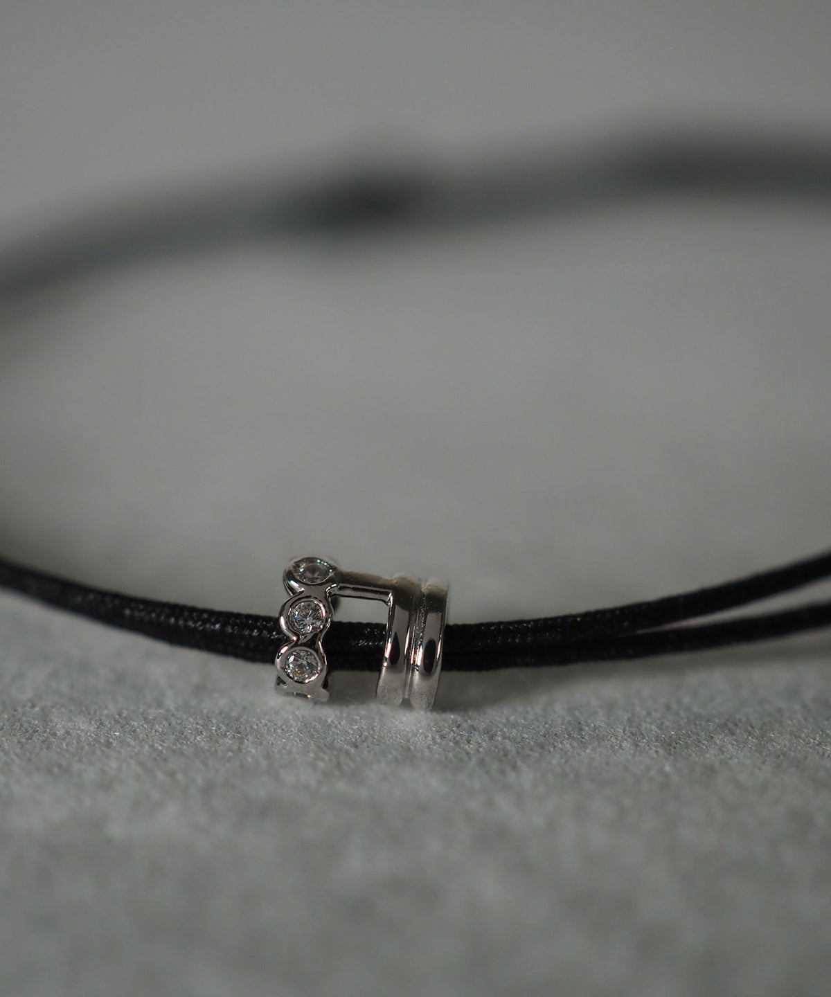 極小のモチーフと繊細なコードを組み合わせたコードブレスレット。 Tシャツなどのラフなスタイルから、クリーンなシャツスタイルまで、どんな装いにも「さりげない品」を添えてくれます。 軽やかな着け心地は、日常に寄り添うスキンアクセサリーに最適。お手持ちの時計やブレスレットとの重ね付けも、自由自在に楽しめます。