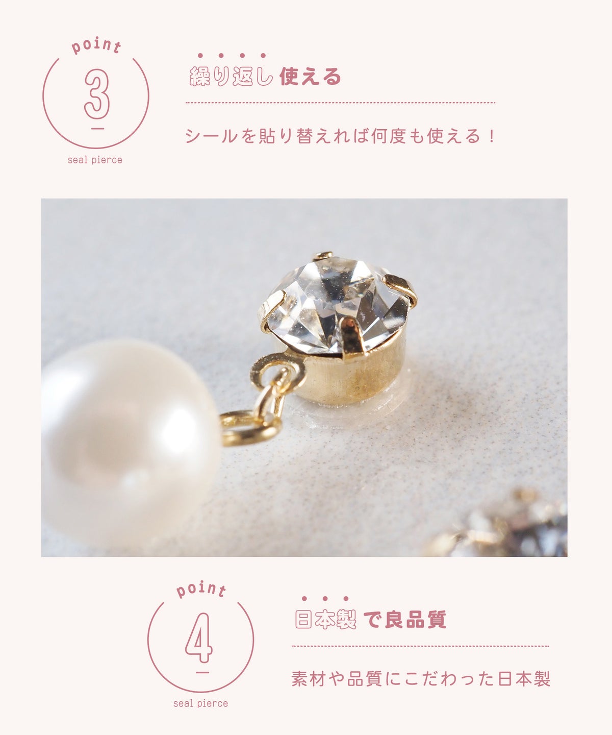 新感覚!「モチーフ」と「使い捨てシール」を組み合わせて使用するイヤリング。シールで好きな位置にペタッと貼るだけ。モチーフに合わせた貼り替えシール(2サイズあり)で、繰り返し楽しめます。シールの耳側は医療用で肌にやさしく、モチーフ側は工業用でしっかりくっつきはがれにくい仕様。耳を挟まないので長時間つけても耳が痛くならず、ピアスライクな見た目が叶います。軟骨やトラガスなどボディピアスとしての使用もオススメです。※着け心地には個人差があり、また全ての方に金属アレルギー反応が出ない(アレルギーフリー)を保証するものではございません。違和感を感じた場合はご使用を中止し、専門医にご相談ください。