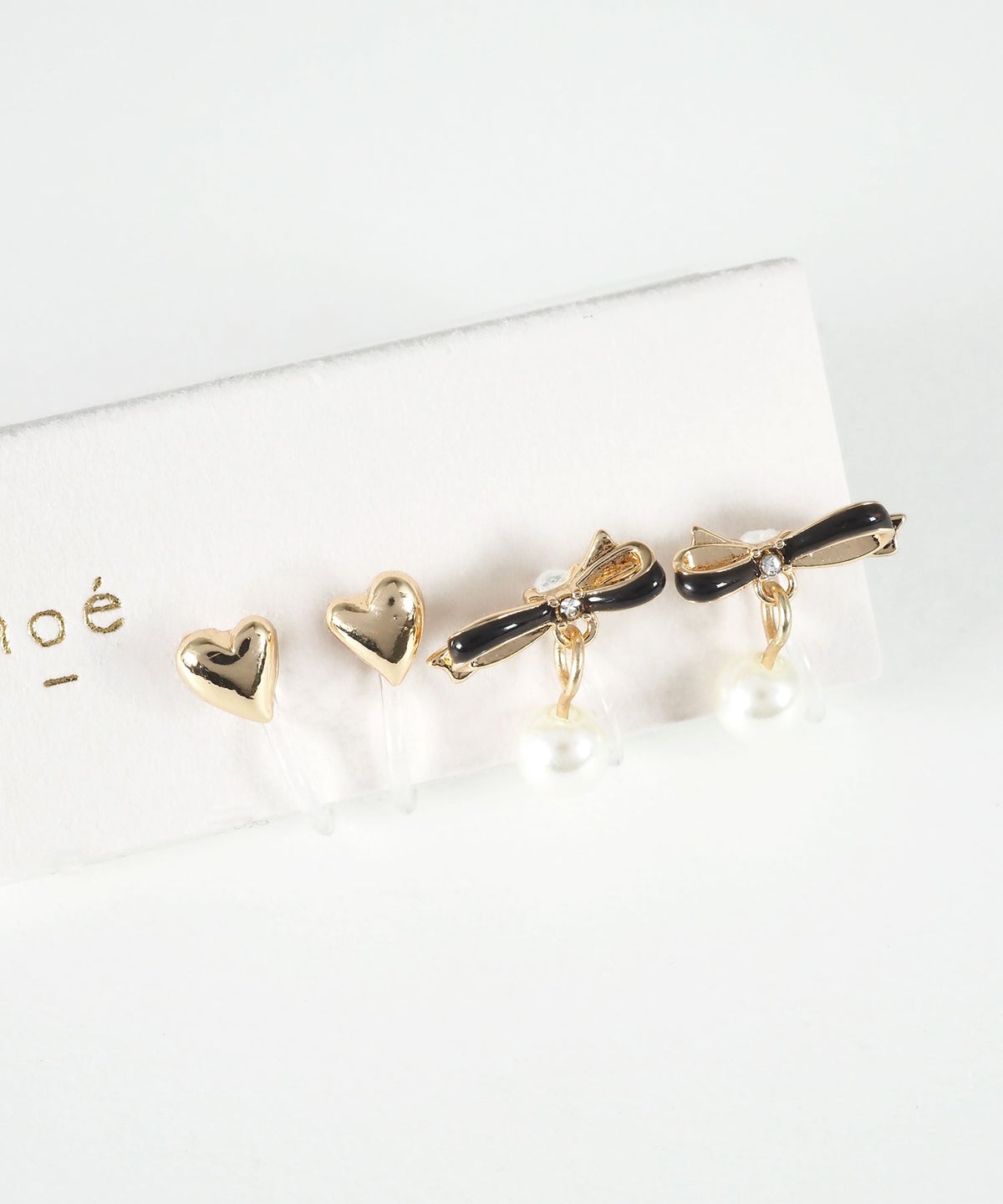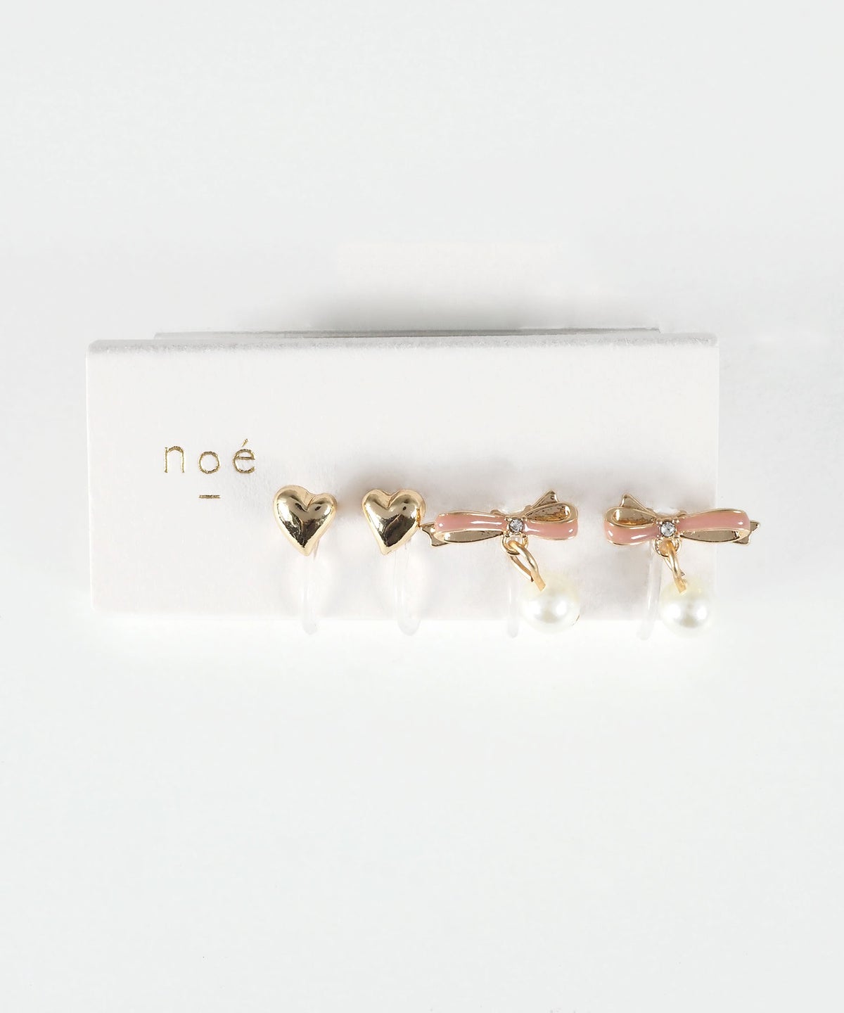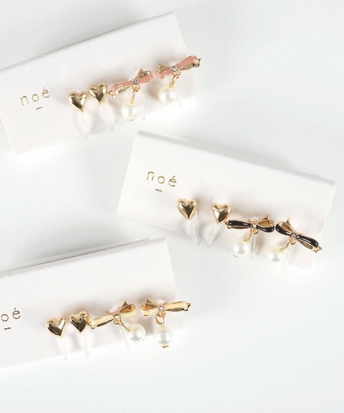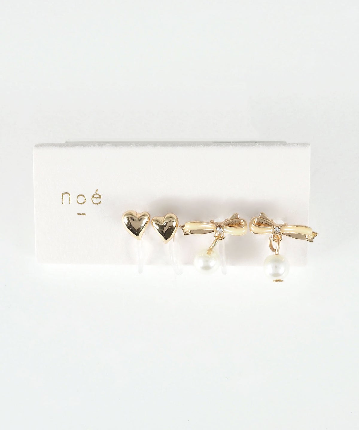 ハートとパールが揺れるリボンの2種類を楽しめるセット樹脂ノンホールイヤリング。自由な組み合わせや重ね付けで、自分らしいアレンジが可能です。樹脂製のイヤリングパーツが素肌に溶け込み、まるでピアスみたいな華奢な見た目を叶えます。