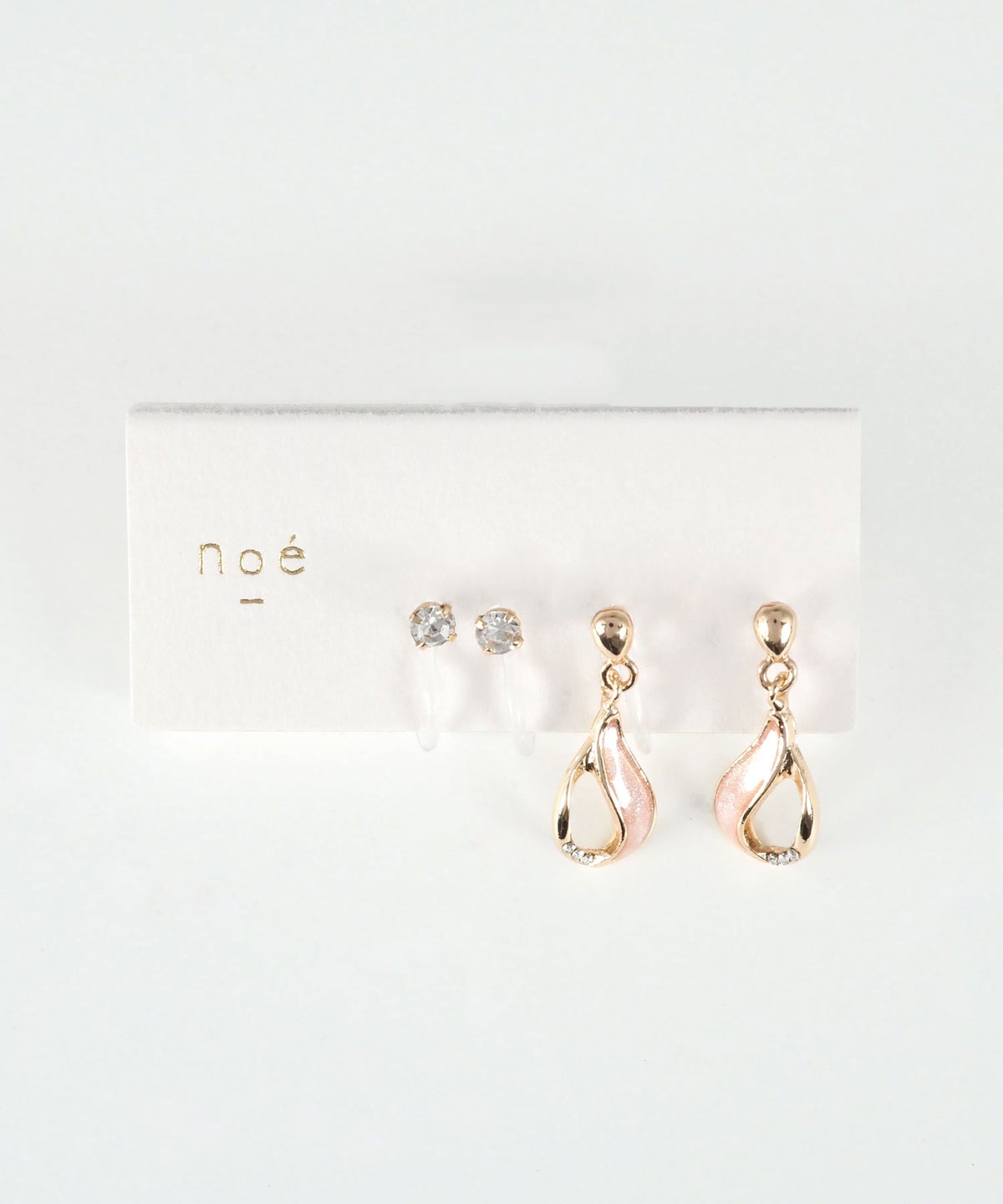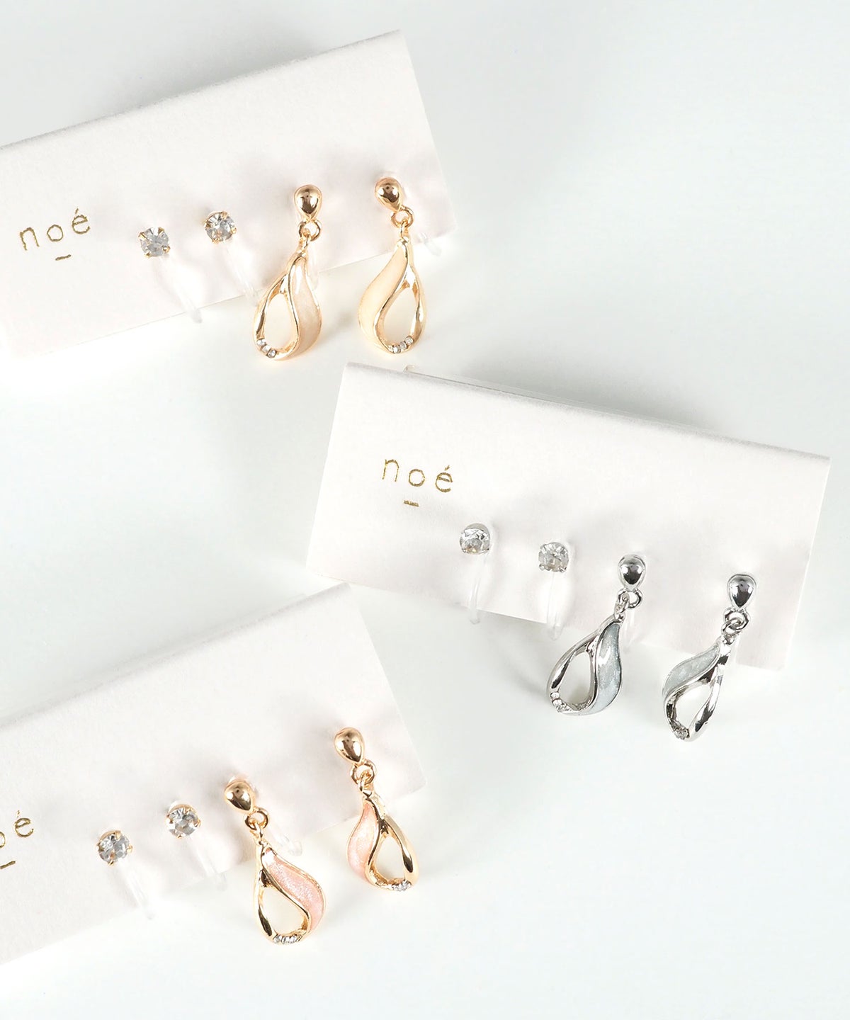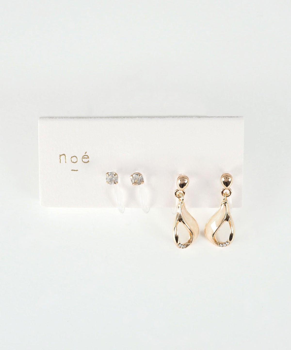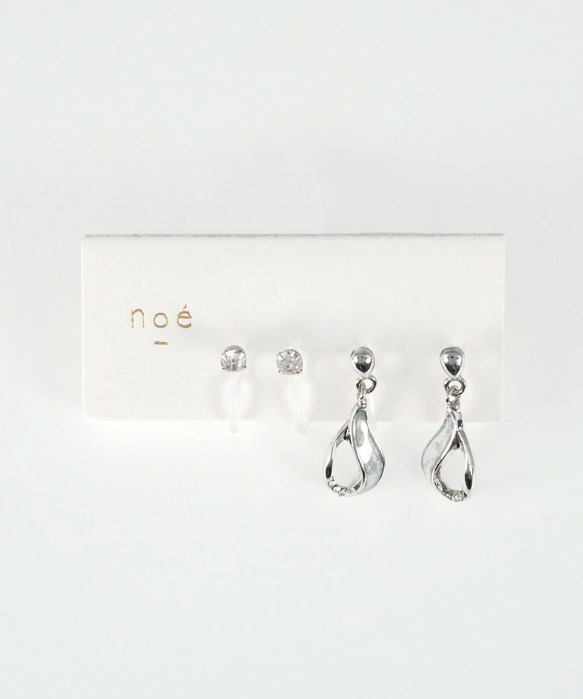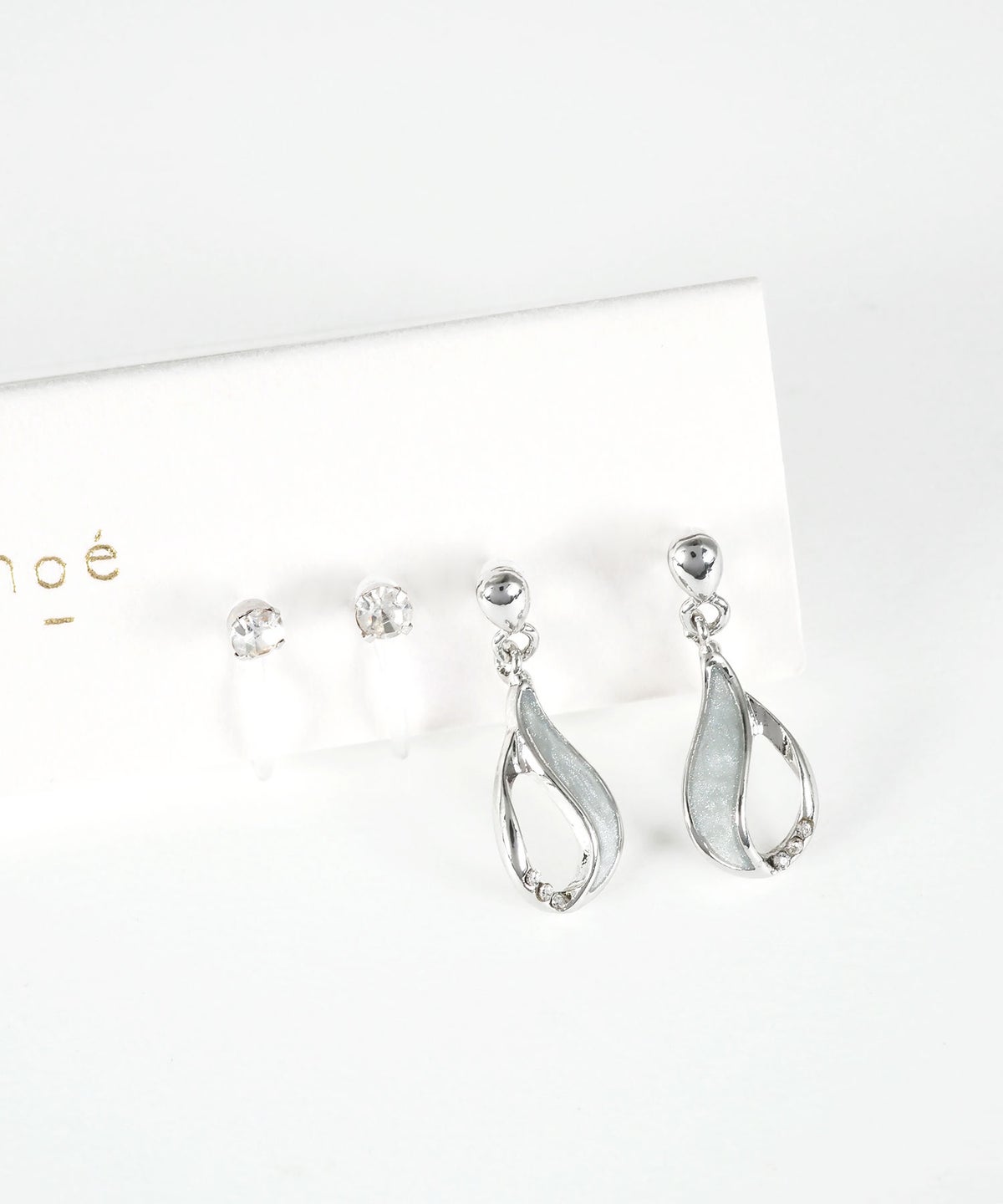 一粒ビジューと、洗練された印象の変形ドロップデザインの2種類を楽しめるセット樹脂ノンホールイヤリング。自由な組み合わせや重ね付けで、自分らしいアレンジが可能です。樹脂製のイヤリングパーツが素肌に溶け込み、まるでピアスみたいな華奢な見た目を叶えます。