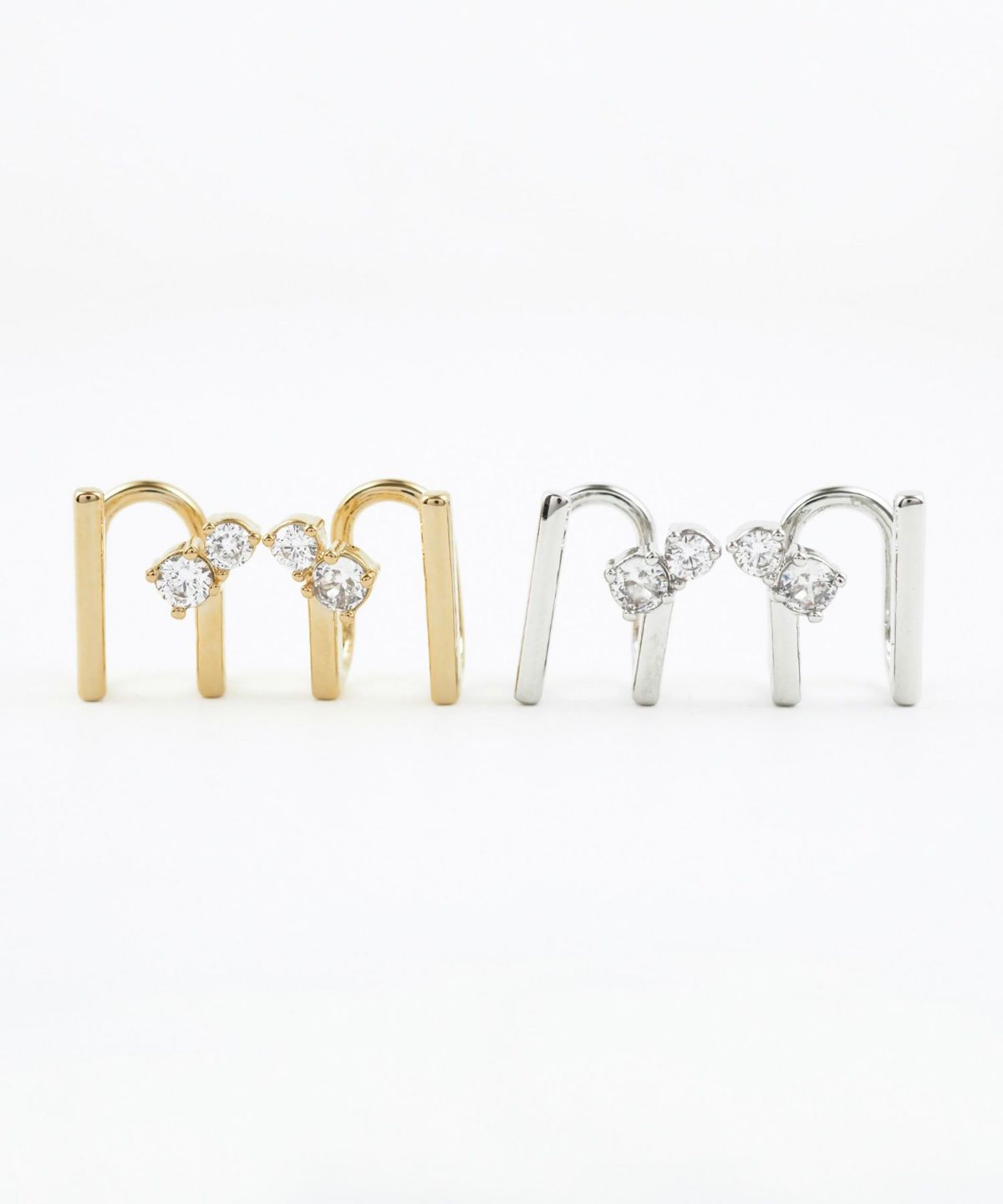 重ね付け風のデザインが魅力のラウンドメタルイヤリング。計算された2本のラインが、繊細なキュービックジルコニアの輝きを一層引き立てます。立体的なデザインが、いつものカジュアルコーデに「こなれ感」をプラスしてくれます。