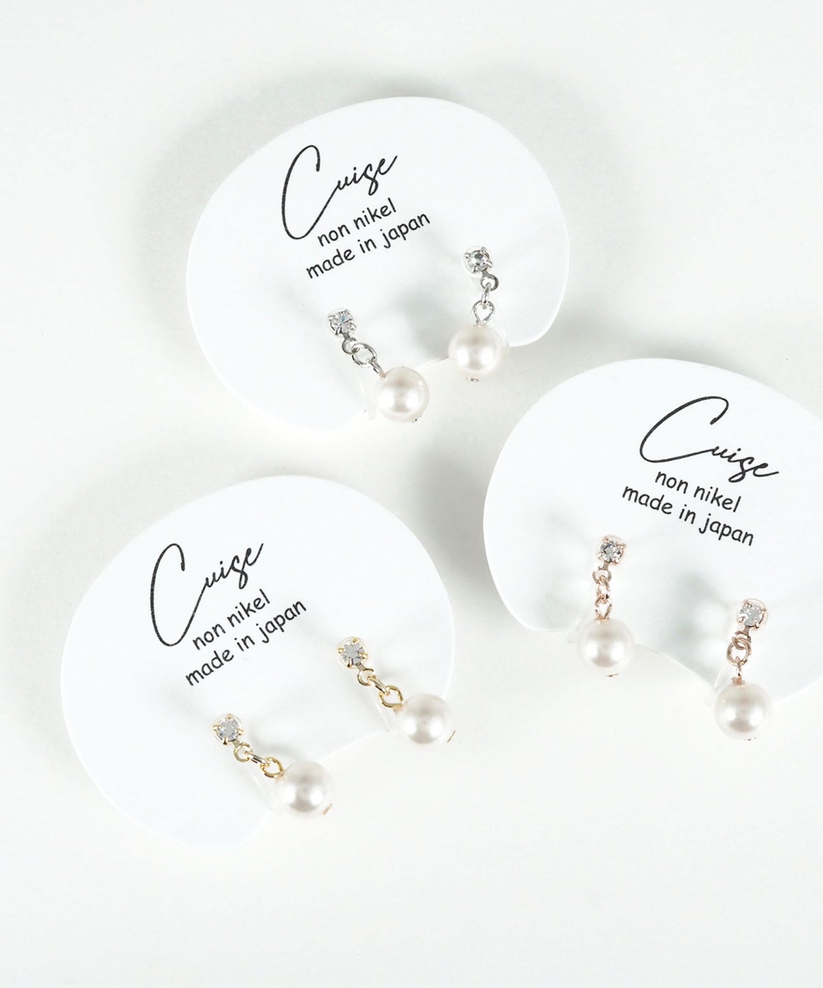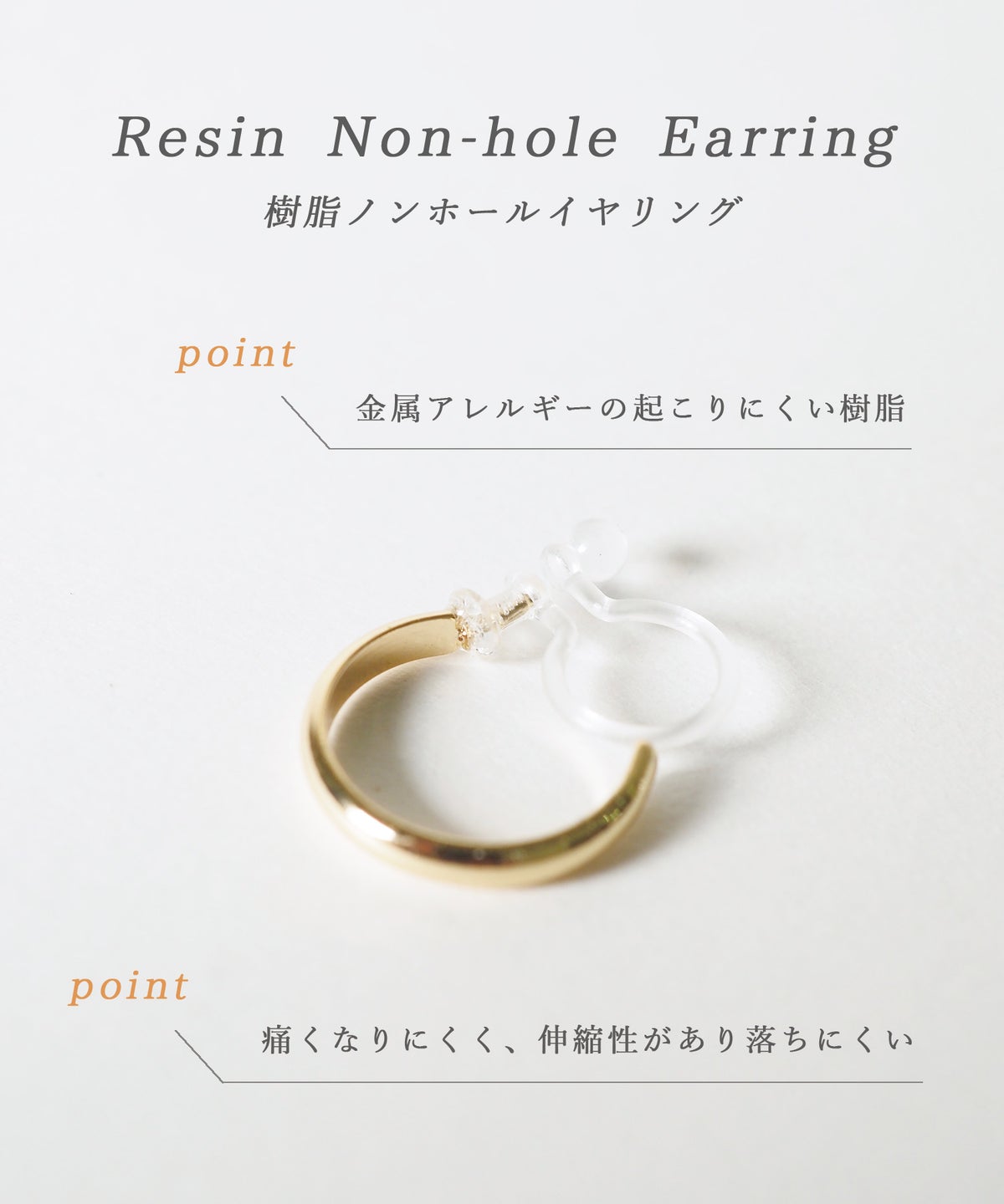 ピアスの穴を開けずにおしゃれを楽しめることから「ノンホールピアス」と呼ばれるイヤリング。留め具部分に、金属アレルギーの起こりにくい樹脂を使用しています。とても軽量で長時間つけても耳が痛くなりにくく、伸縮性があるため落ちにくいイヤリングです。またクリアパーツは目立ちにくく、ピアスのようにすっきり見えるのも嬉しいポイントです。全ての方に金属アレルギー反応が出ない(アレルギーフリー)を保証するものではございません。予めご了承ください。