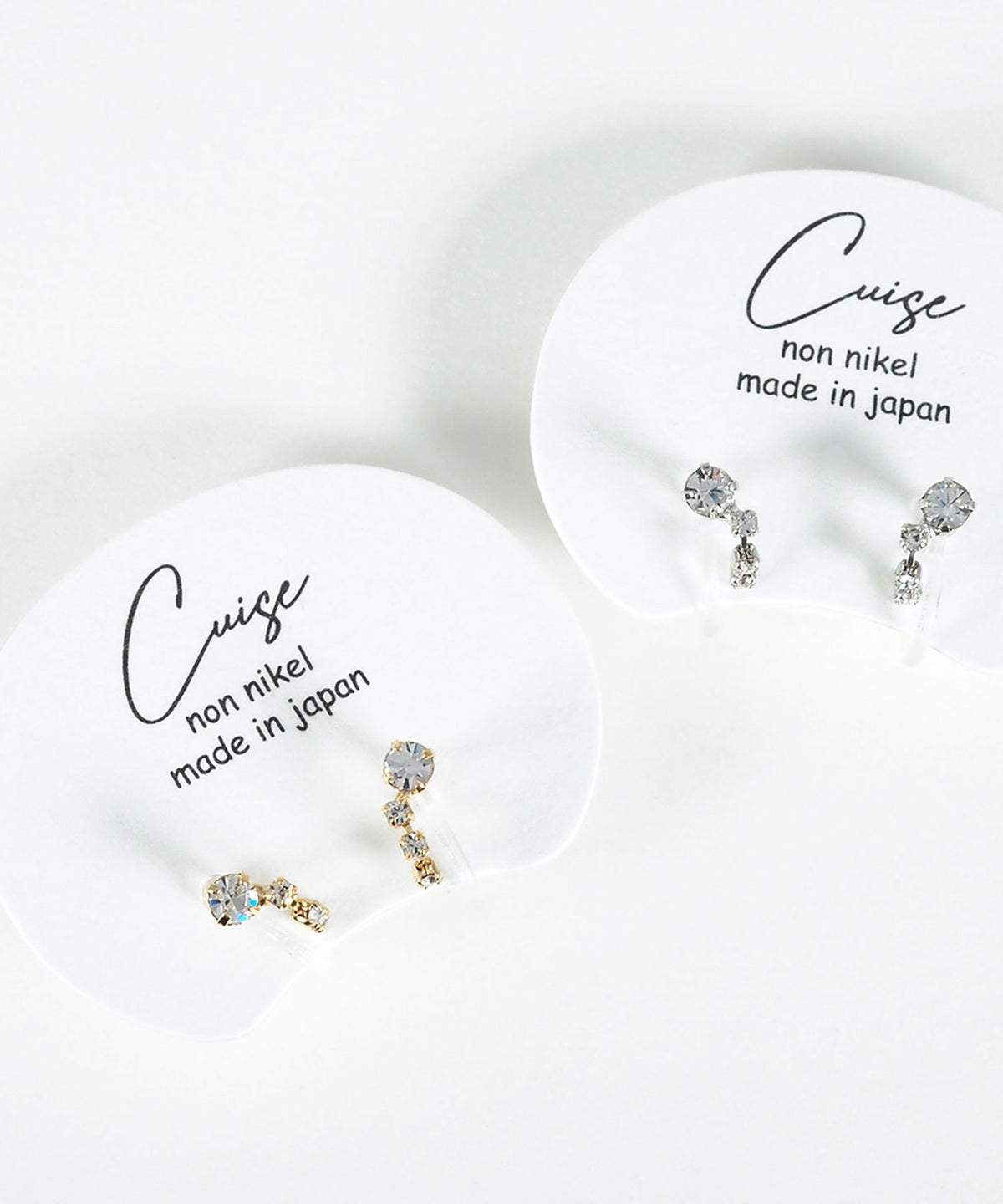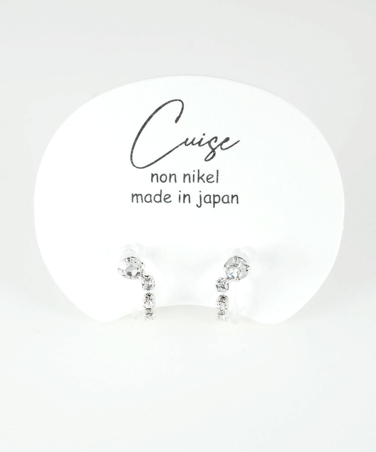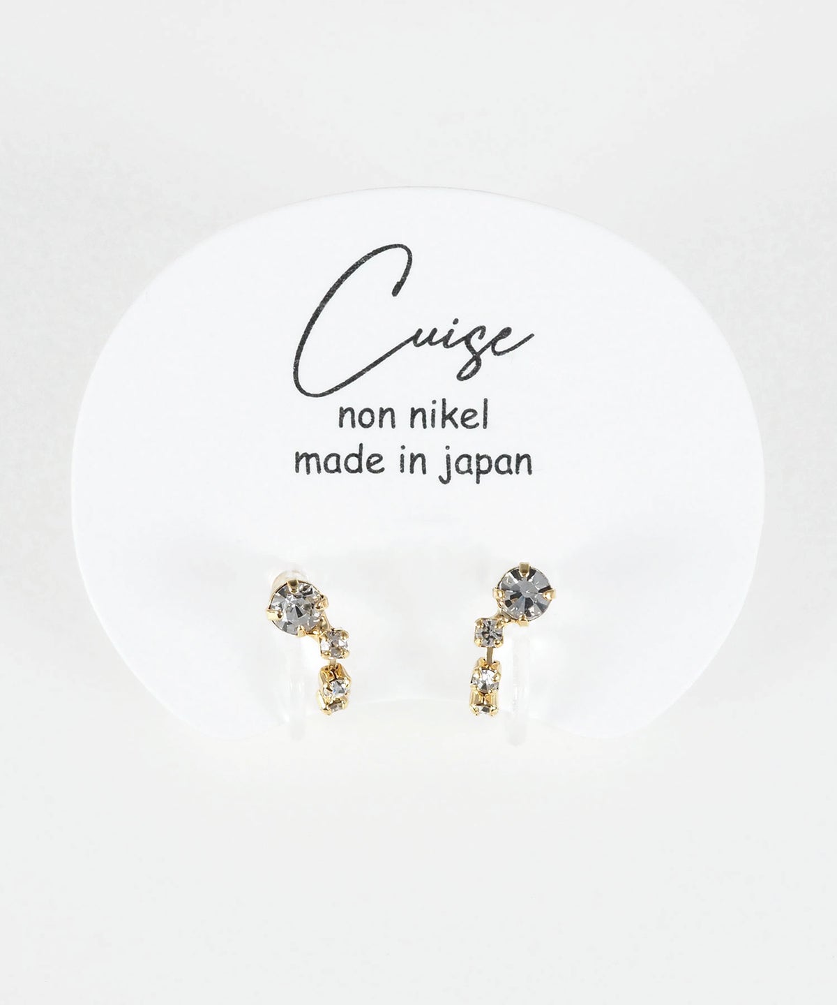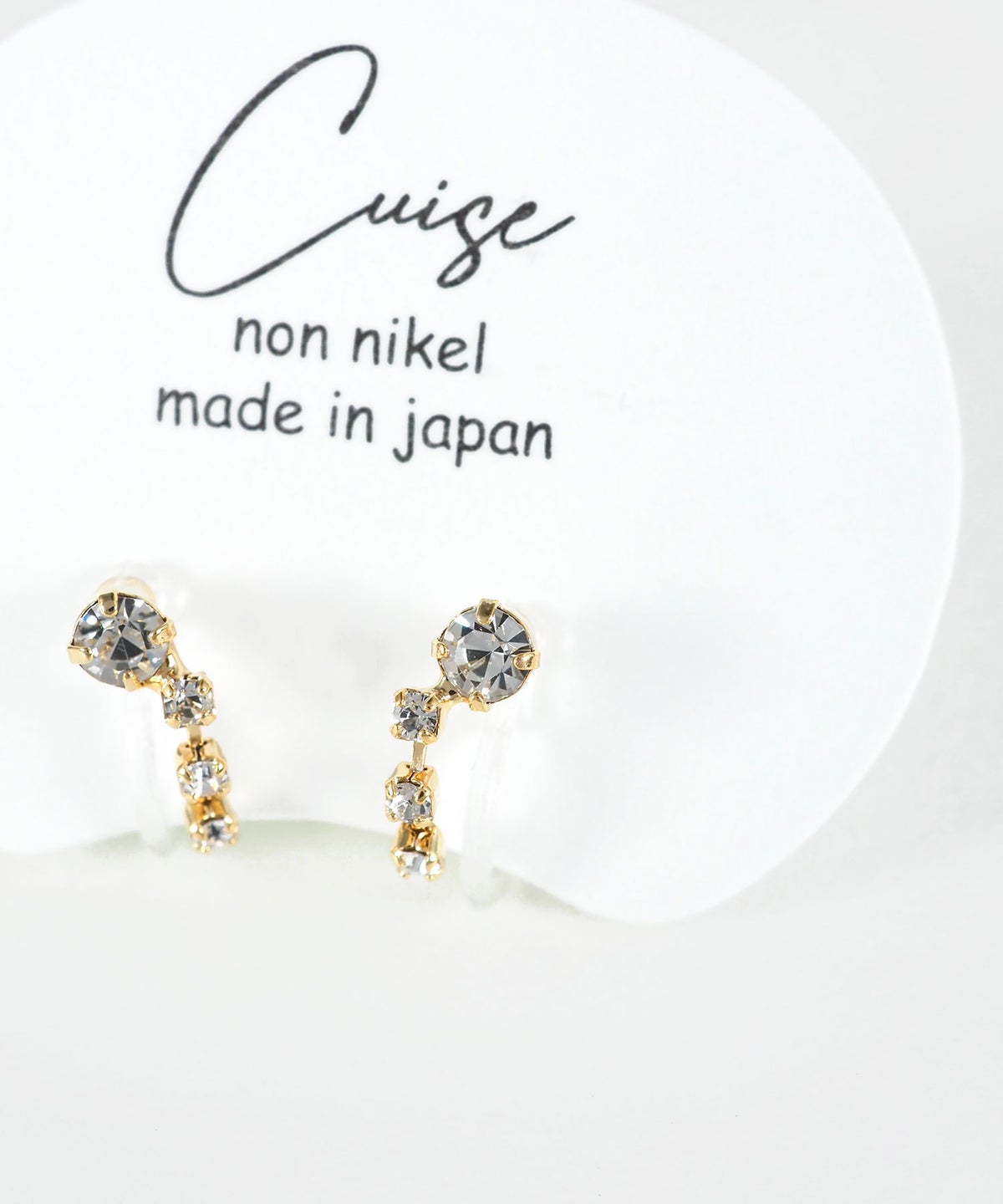耳のラインに沿ってビジューが流れるように輝く洗練された樹脂ノンホールイヤリング。控えめながらも顔周りを明るく見せるので、オフィスやお呼ばれなど上品にまとめたい日に最適です。