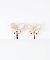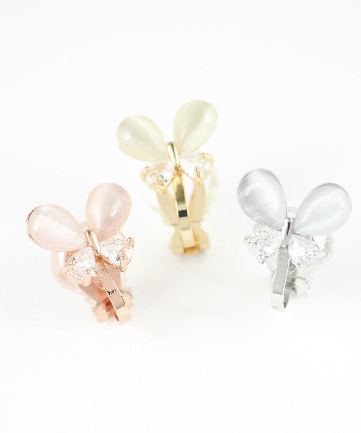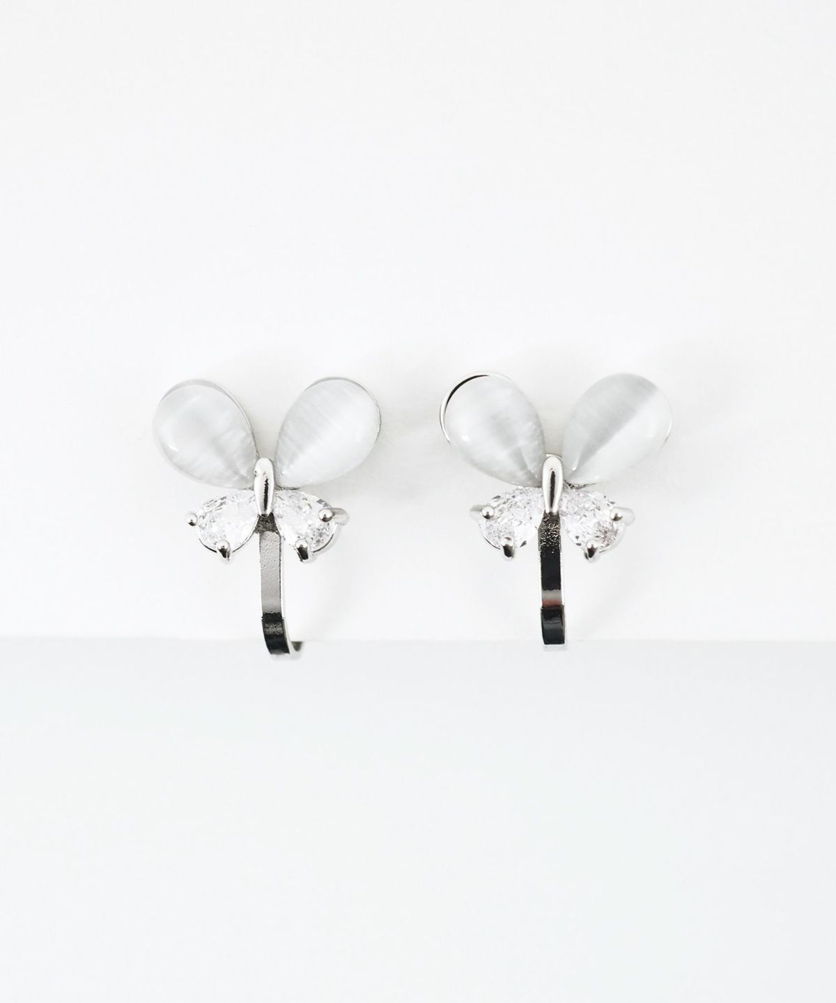 ふわりと羽を休める蝶をイメージした、大人可愛いクリップイヤリング。光を優しく閉じ込めたキャッツアイ調のストーンと、煌めくキュービックジルコニアを組み合わせ、抜け感のある上品な雰囲気に。異素材を掛け合わせたアシンメトリーな輝きが、横顔に立体感と華やぎを添えてくれます。