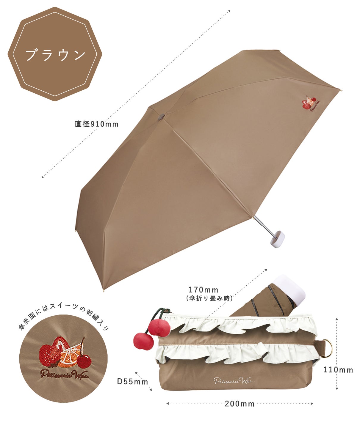 まるでケーキを贈るような特別感があり、スイーツモチーフがお好きな方へのギフトにもぴったりな、可愛らしさと機能性を兼ね備えた毎日のお出かけを楽しく彩る折りたたみ日傘です。