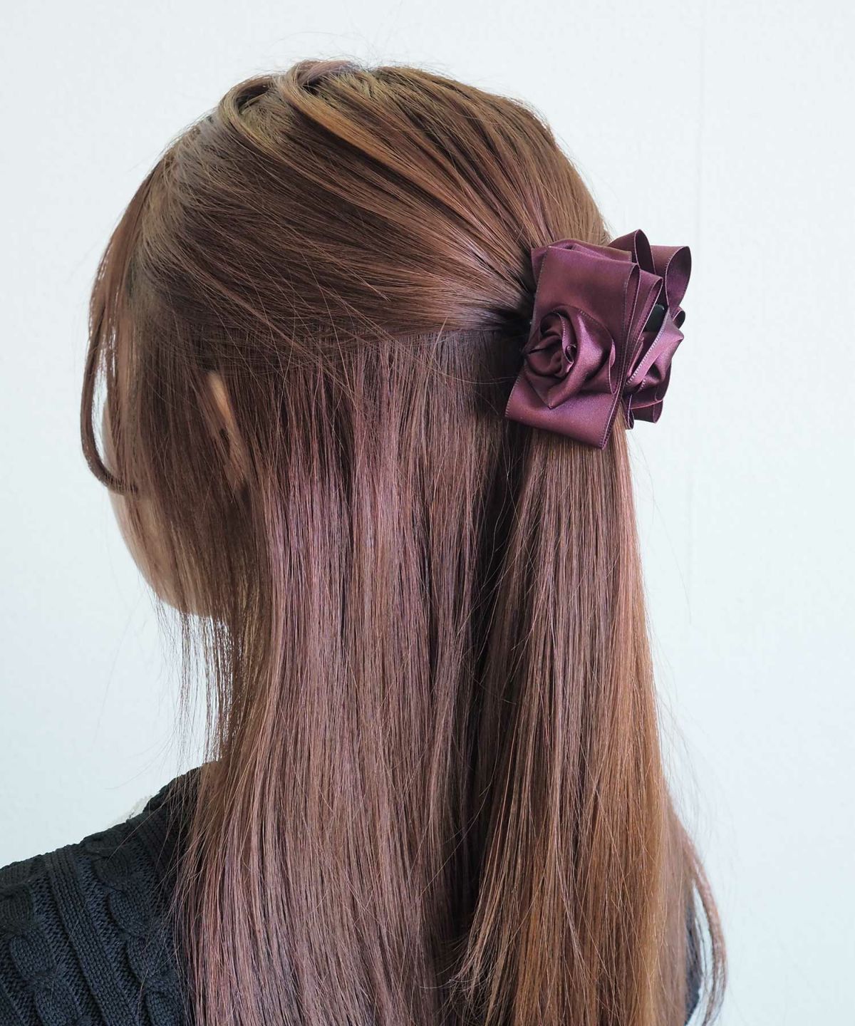 光沢のあるサテンリボンに、立体のローズモチーフをあしらったエレガントなバンスクリップ。ハーフアップにおすすめの小ぶりなサイズ。挟むだけで、上品で華やかなまとめ髪が完成します。普段使いはもちろん、パーティーなどの特別なシーンにも活躍する、大人の女性にふさわしい主役級のアイテムです。
