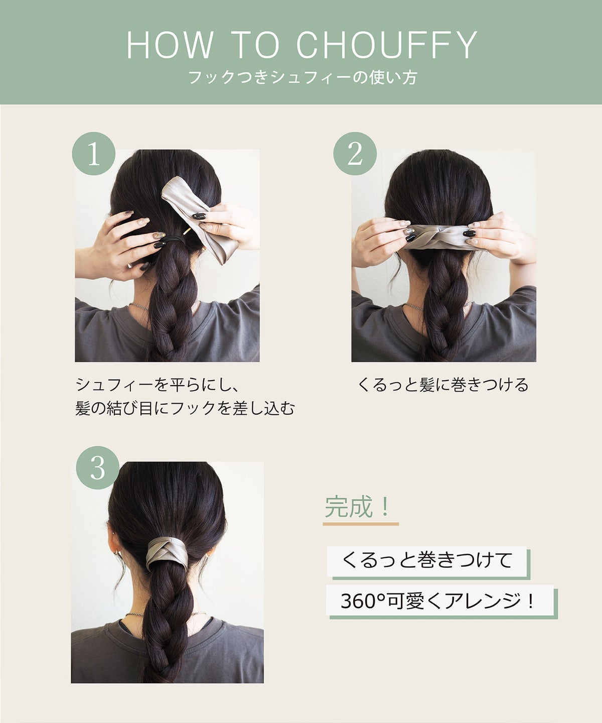 光沢と暖かみのあるベロアプリーツ生地のシュフィーポニーやお団子ヘアにくるっと巻きつけて使うアイテムです。フック付きなのでしっかり留まり、簡単におしゃれスタイルに仕上がります。