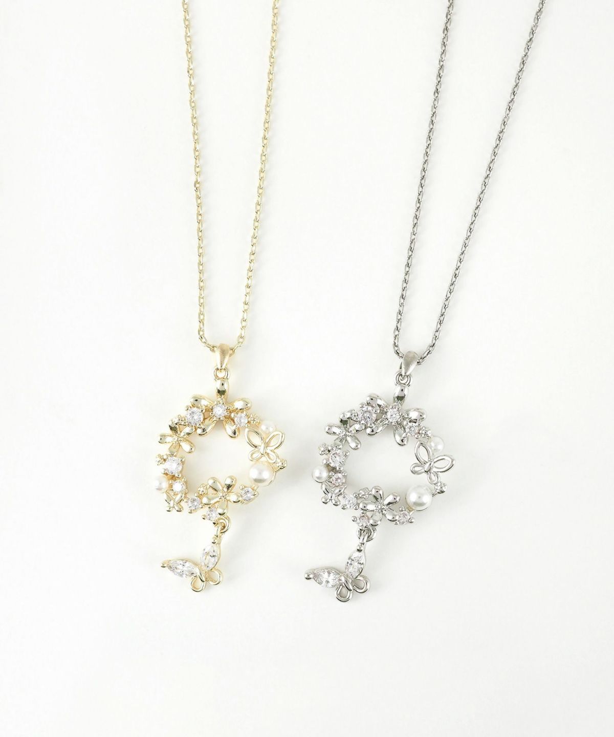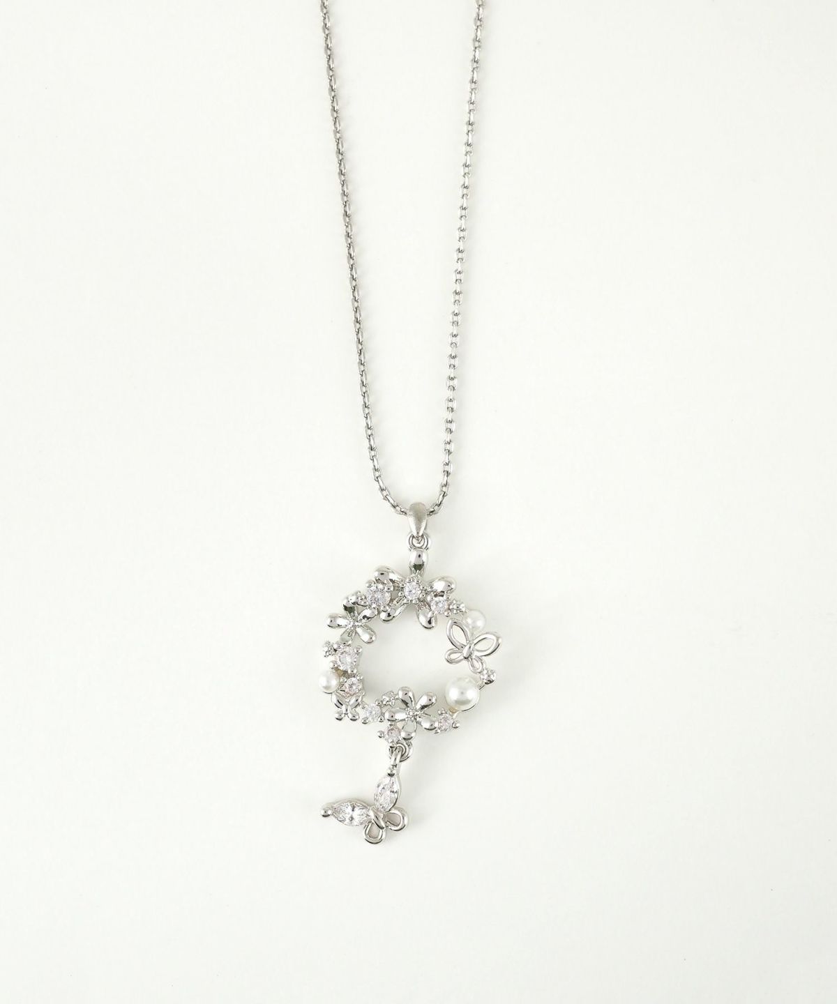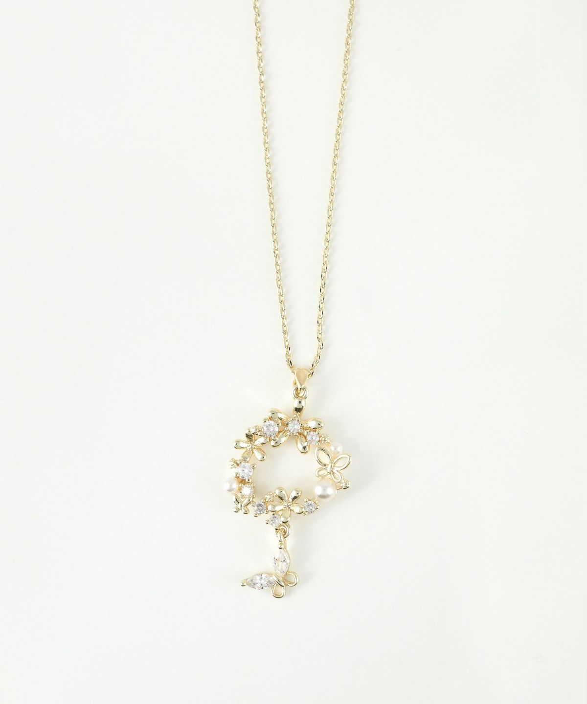 花々と蝶が優雅な円を描く、洗練されたデザインのネックレス。 艶やかなパールと煌めくビジューがデコルテを華やかに彩り、ふとした仕草で揺れる蝶のチャームが女性らしさを引き立てます。日常使いはもちろん、特別な日の装いにもぴったりのアイテムです。