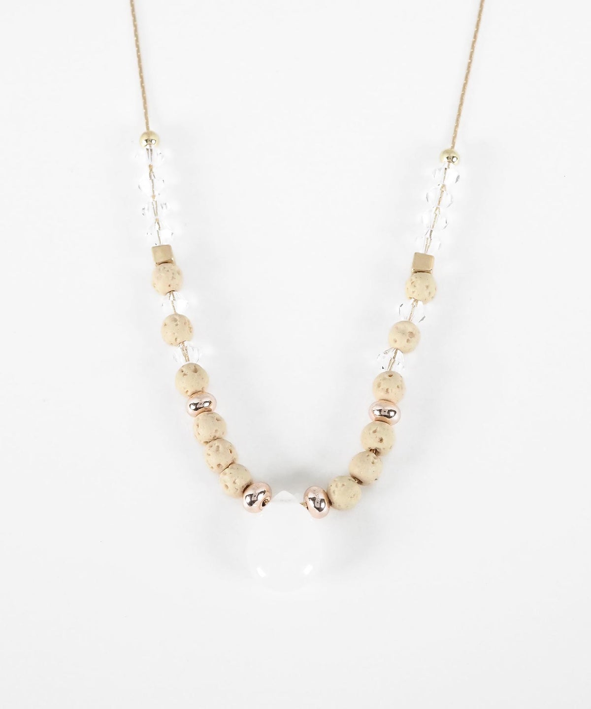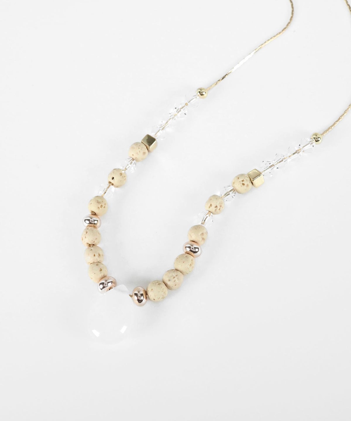 ナチュラルな風合いのウッドビーズと、透明感あふれるクリアパーツを組み合わせたネックレス。リゾートスタイルからデイリーのアクセントまで幅広く活躍します。これからの季節にぴったりなアイテムです。