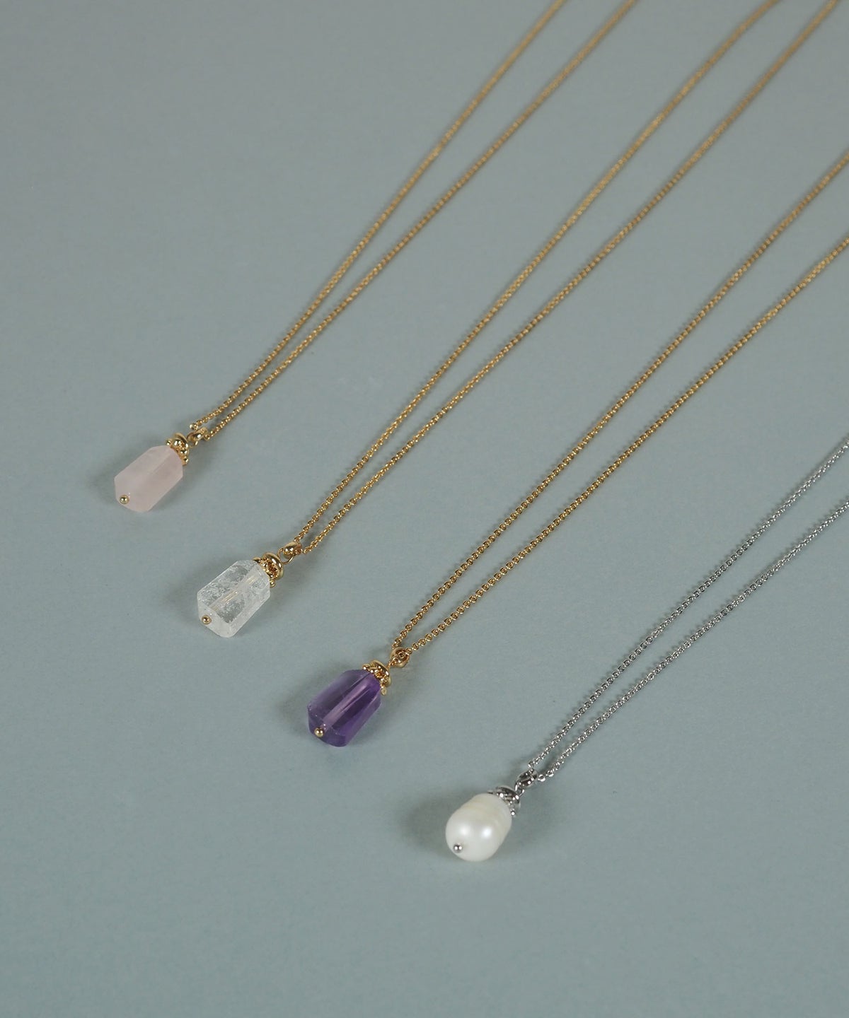 MATERIAL 水晶、ローズクォーツ、アメジスト、淡水パール、合金(ニッケルフリー)