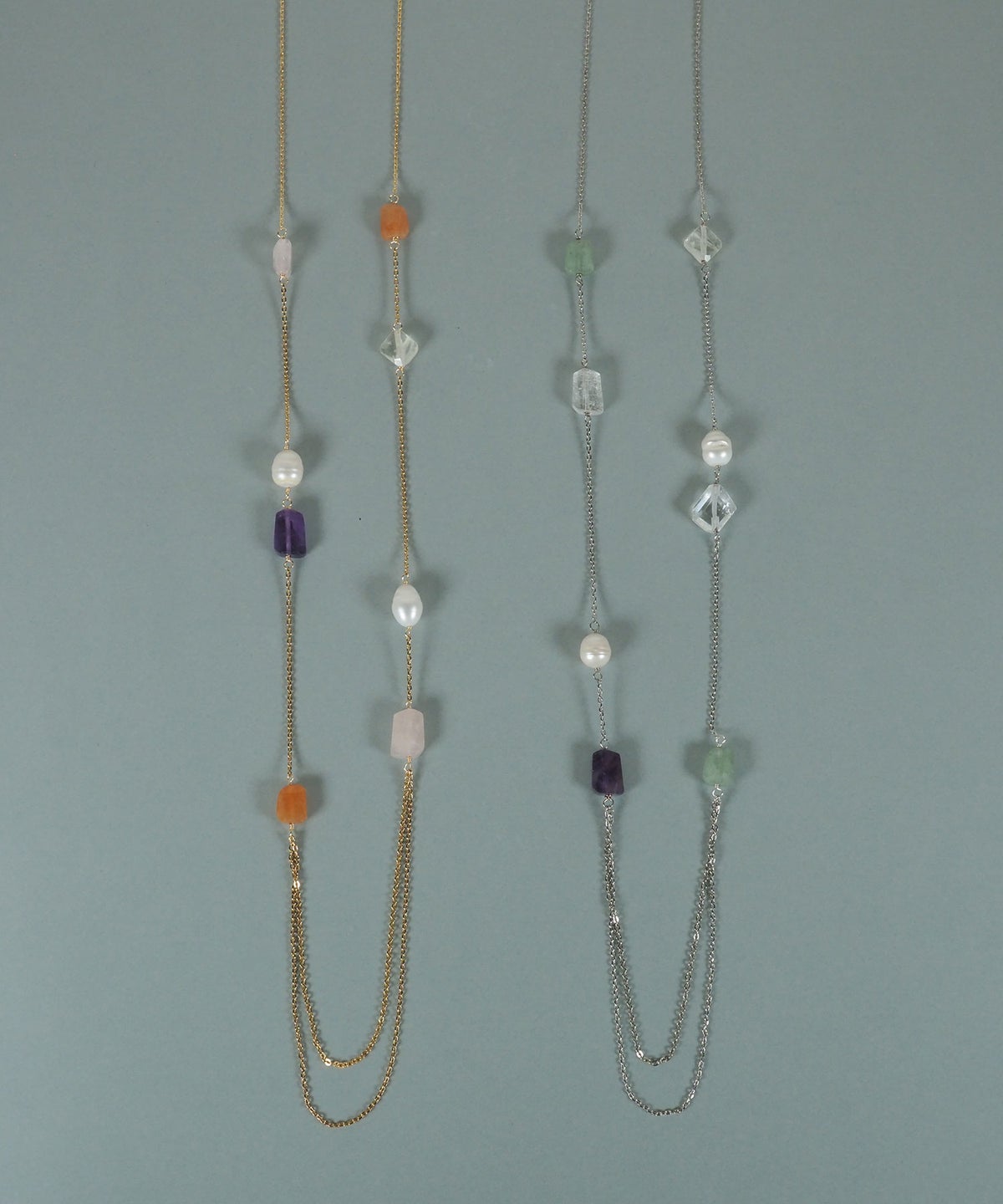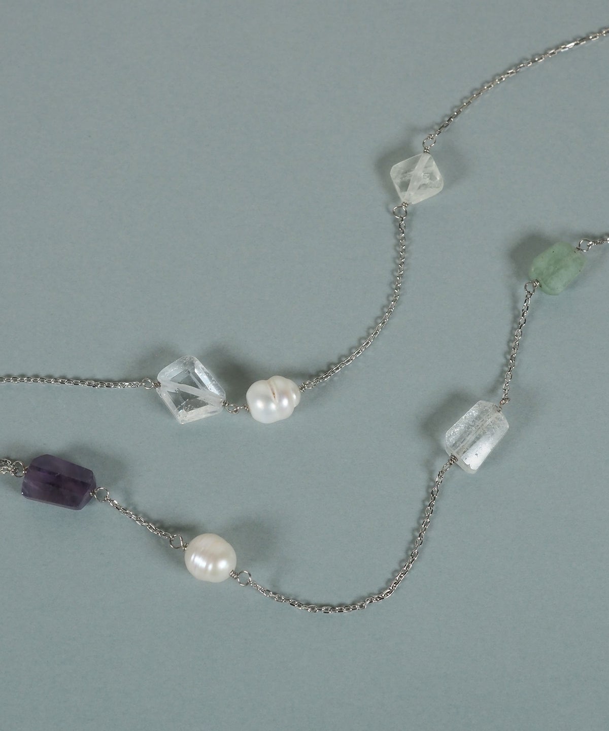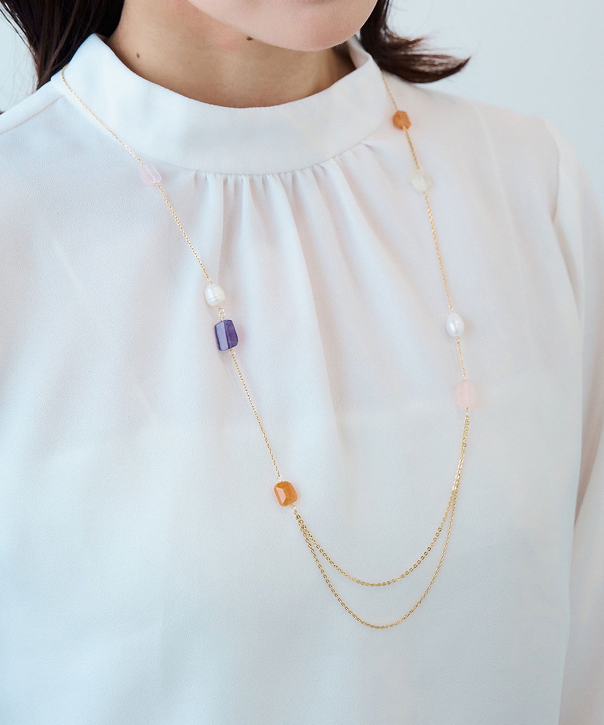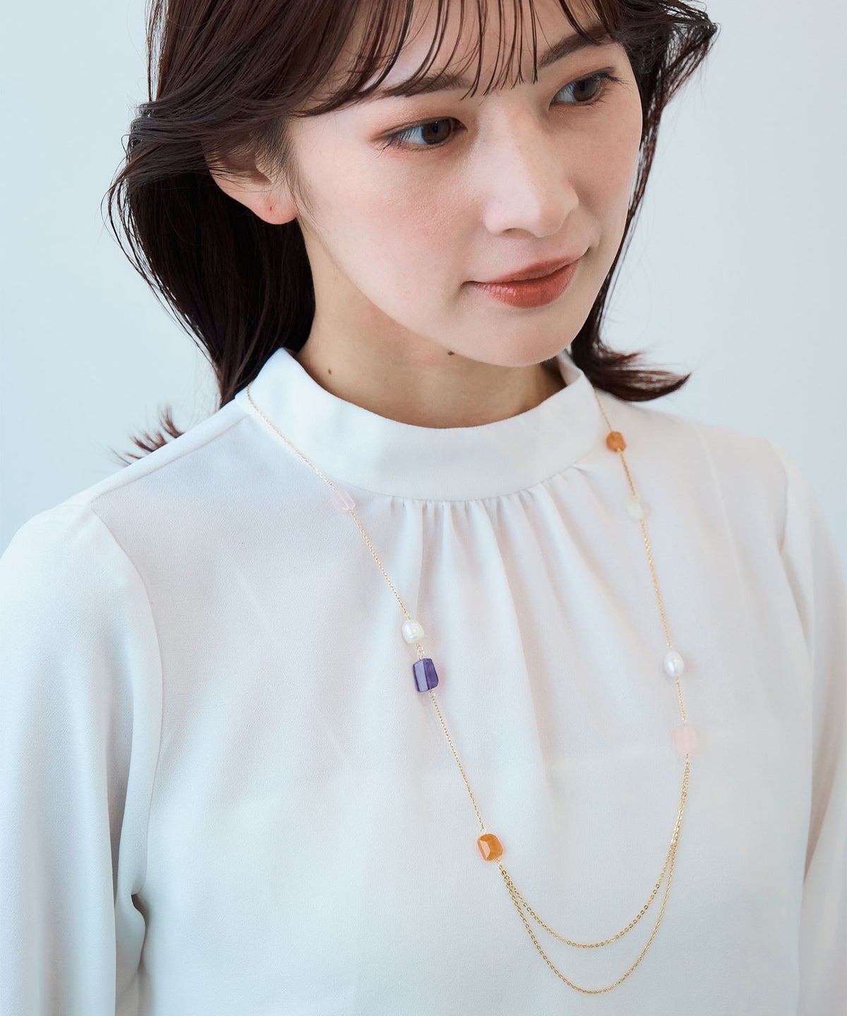 多彩な天然石とパールの輝きを連ねて ローズクォーツ、アメジスト、アベンチュリン、水晶など、個性豊かな天然石を厳選し、上品な光沢の淡水パールとともにチェーンに等間隔で配置しました。 様々なカットと形のストーンを組み合わせることで、動くたびに豊かな表情を魅せます。 首元に余裕をもって身に着けられるロングタイプです。さらに、デザインチェーンとシンプルなチェーンの2連風デザインを採用。 華やかさがありながらも、細身のチェーンで軽やかな印象に仕上げています。