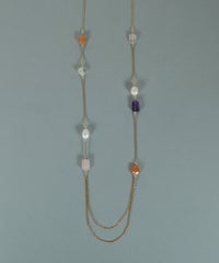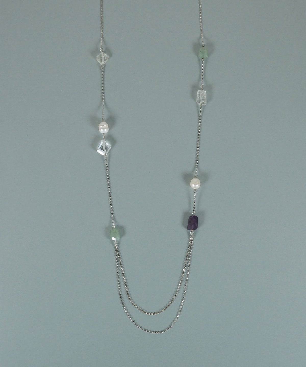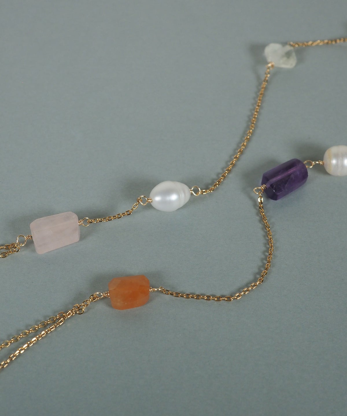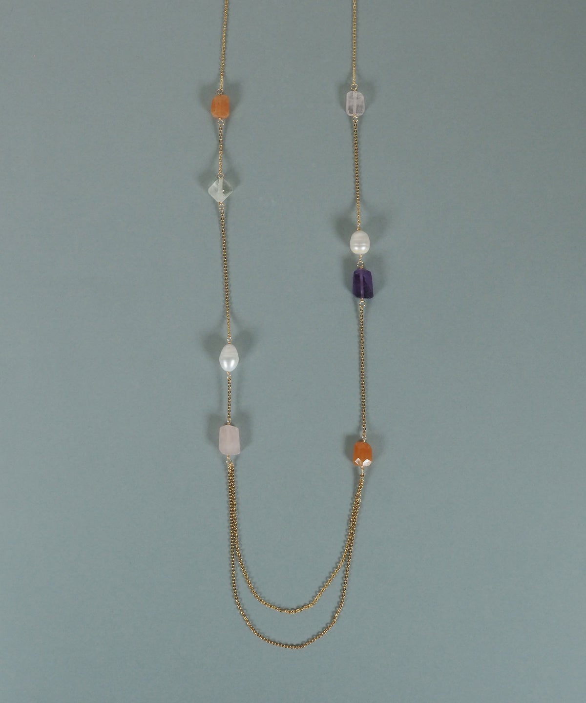 多彩な天然石とパールの輝きを連ねて ローズクォーツ、アメジスト、アベンチュリン、水晶など、個性豊かな天然石を厳選し、上品な光沢の淡水パールとともにチェーンに等間隔で配置しました。 様々なカットと形のストーンを組み合わせることで、動くたびに豊かな表情を魅せます。 首元に余裕をもって身に着けられるロングタイプです。さらに、デザインチェーンとシンプルなチェーンの2連風デザインを採用。 華やかさがありながらも、細身のチェーンで軽やかな印象に仕上げています。