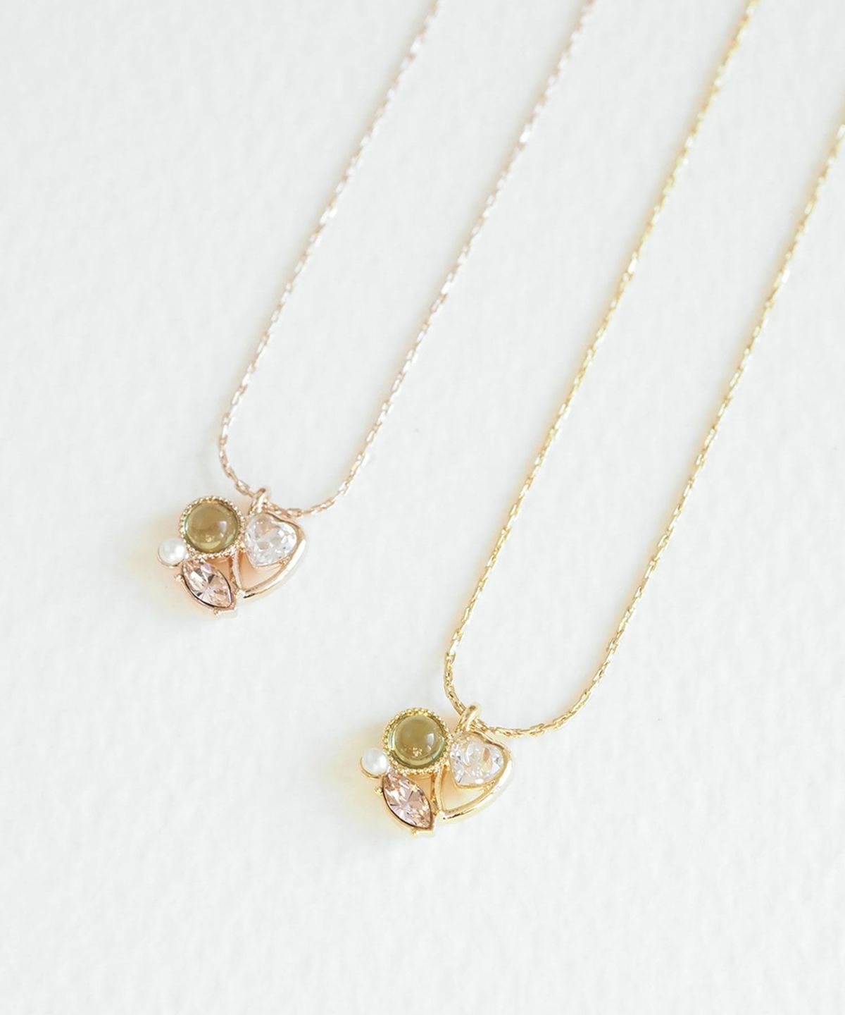 天然石の持つ運気を纏う、お守りアクセサリーシリーズ“MUK Dreamy stone”。桜の花びらが寄り添うような繊細なデザインに「太陽の石」とも呼ばれる天然石ペリドットをあしらったネックレス。ハートフレームをベースに爽やかなグリーンのペリドットやビジュー、小さなパールをバランスよく配置。春の訪れを感じさせる柔らかな配色がお顔周りを優しく明るく見せてくれます。控えめながらも華やかな存在感で、デイリーから特別な日のお出かけまでどんなシーンにも品よく馴染みます。