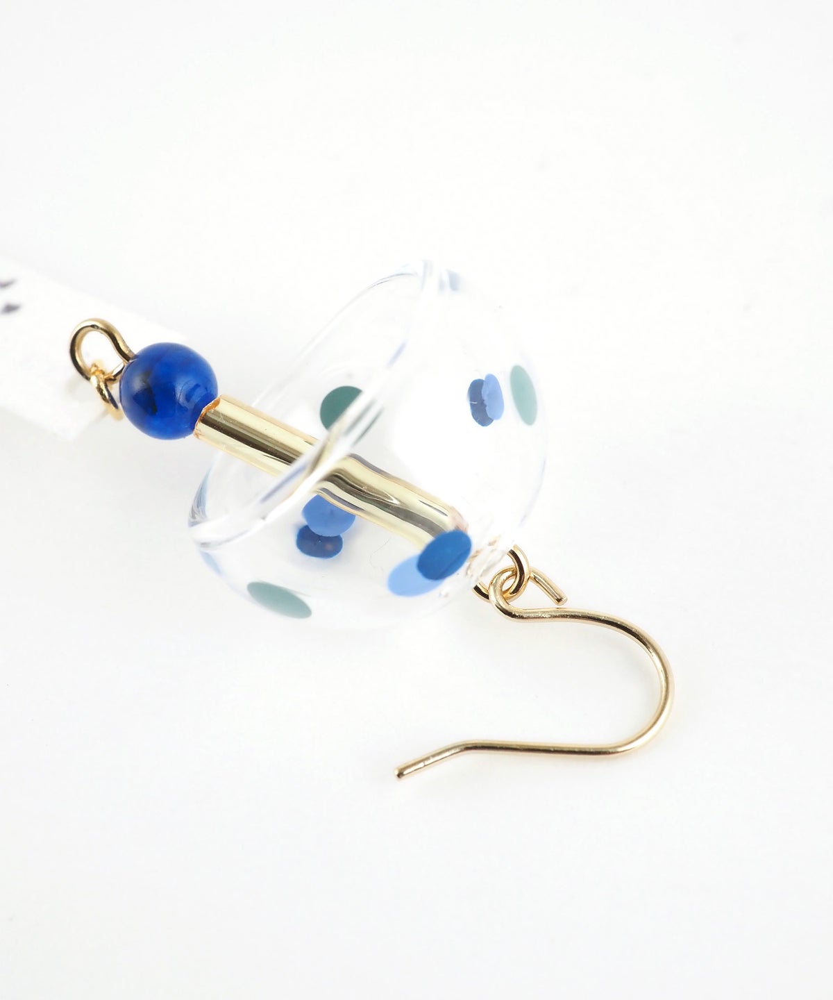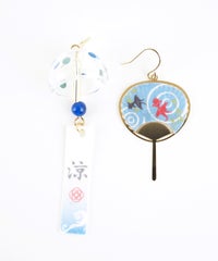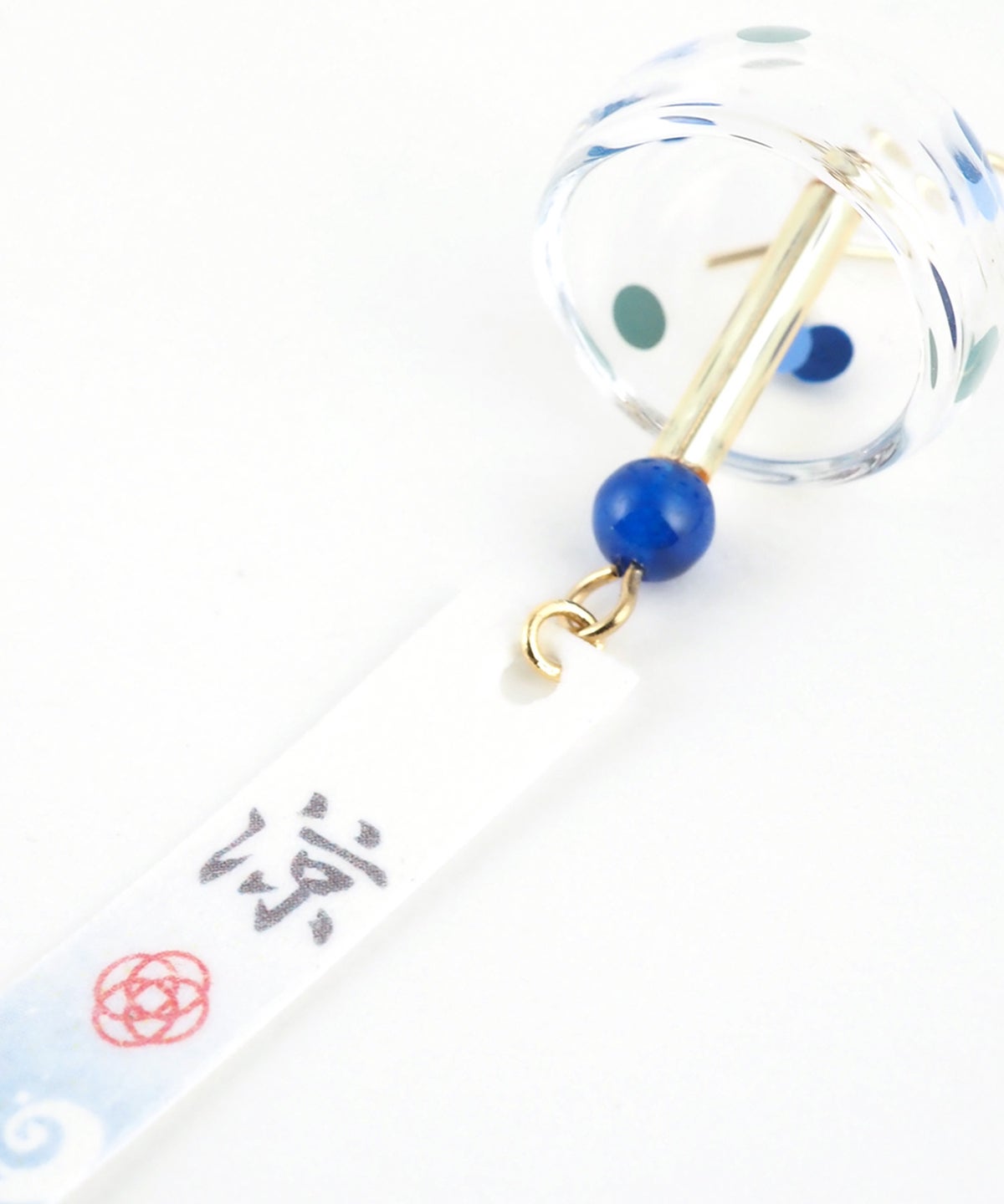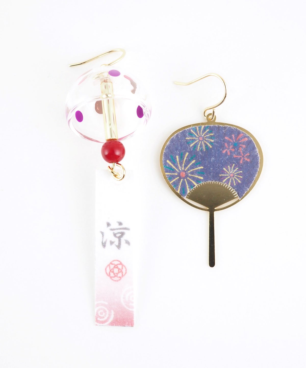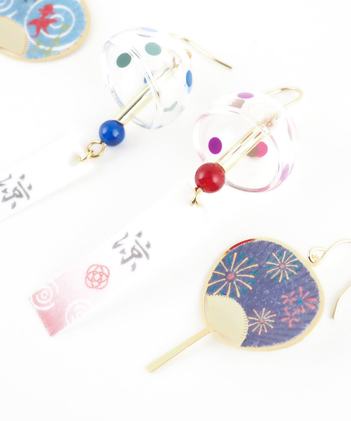 夏の記憶を呼び起こす、風鈴とうちわをモチーフにしたチタンポストピアス。左右でデザインが異なるアシンメトリーな仕上がりが、お顔周りに遊び心と抜け感を演出します。風鈴の下で揺れる短冊とうちわの裏側には、凛とした「涼」の文字を。耳元から涼しげな風が吹き抜けるような、爽やかな雰囲気を漂わせます。浴衣に合わせるのはもちろん、日常の装いにさりげなく「和」のアクセントを取り入れるのもおすすめです。