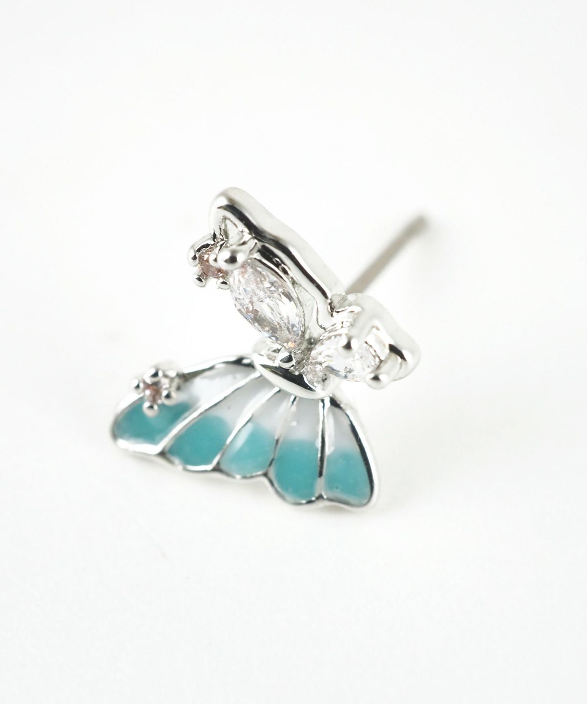 繊細なビジューと柔らかなパステルカラーを組み合わせた、可憐な蝶モチーフのステンレスポストピアス。きらめくカットストーンと、優しい色彩のコントラストが耳元を上品に彩ります。動くたびに光を反射し、表情まで明るく魅せてくれるデザイン。ペアピアス(両耳用)です。