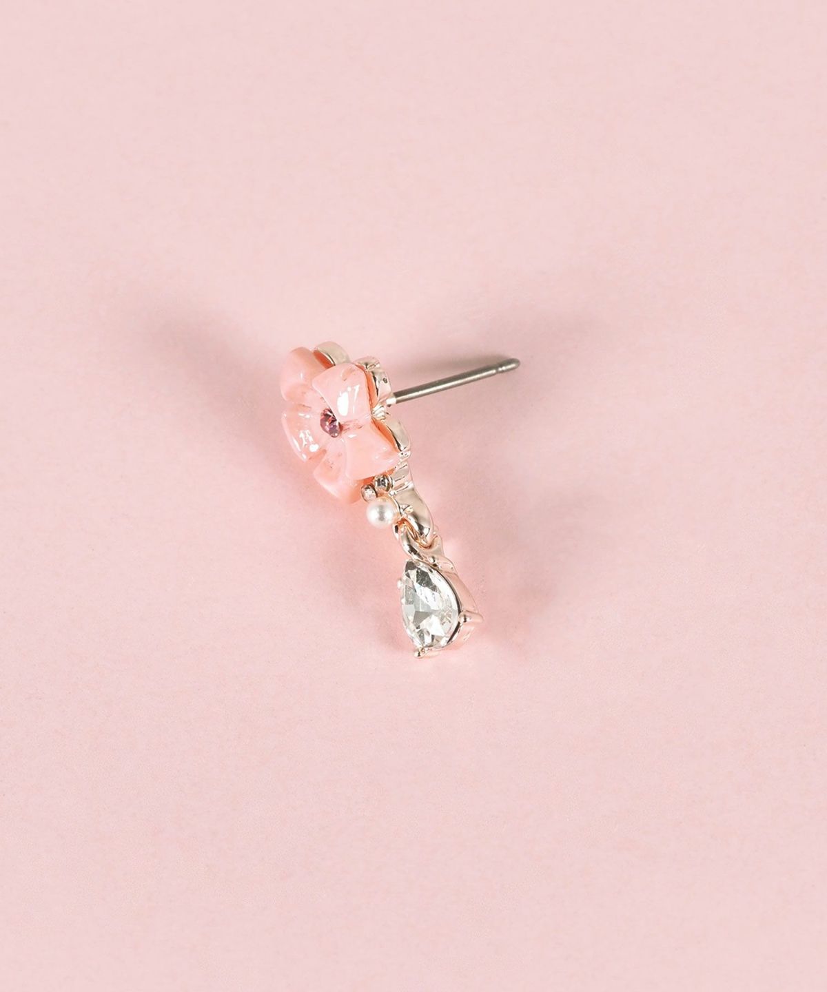 柔らかなピンクの桜(さくら)に、パールとドロップビジューを添えたピアスです。桜(さくら)からしずくが零れ落ちるように垂れ下がったデザインが耳元で揺れるたびに光を集め、お顔周りをパッと明るく見せてくれます。春の訪れと華やかさを添える、特別な日の装いにも日常使いにもぴったりのアイテムです。ペアピアス(両耳用)です。