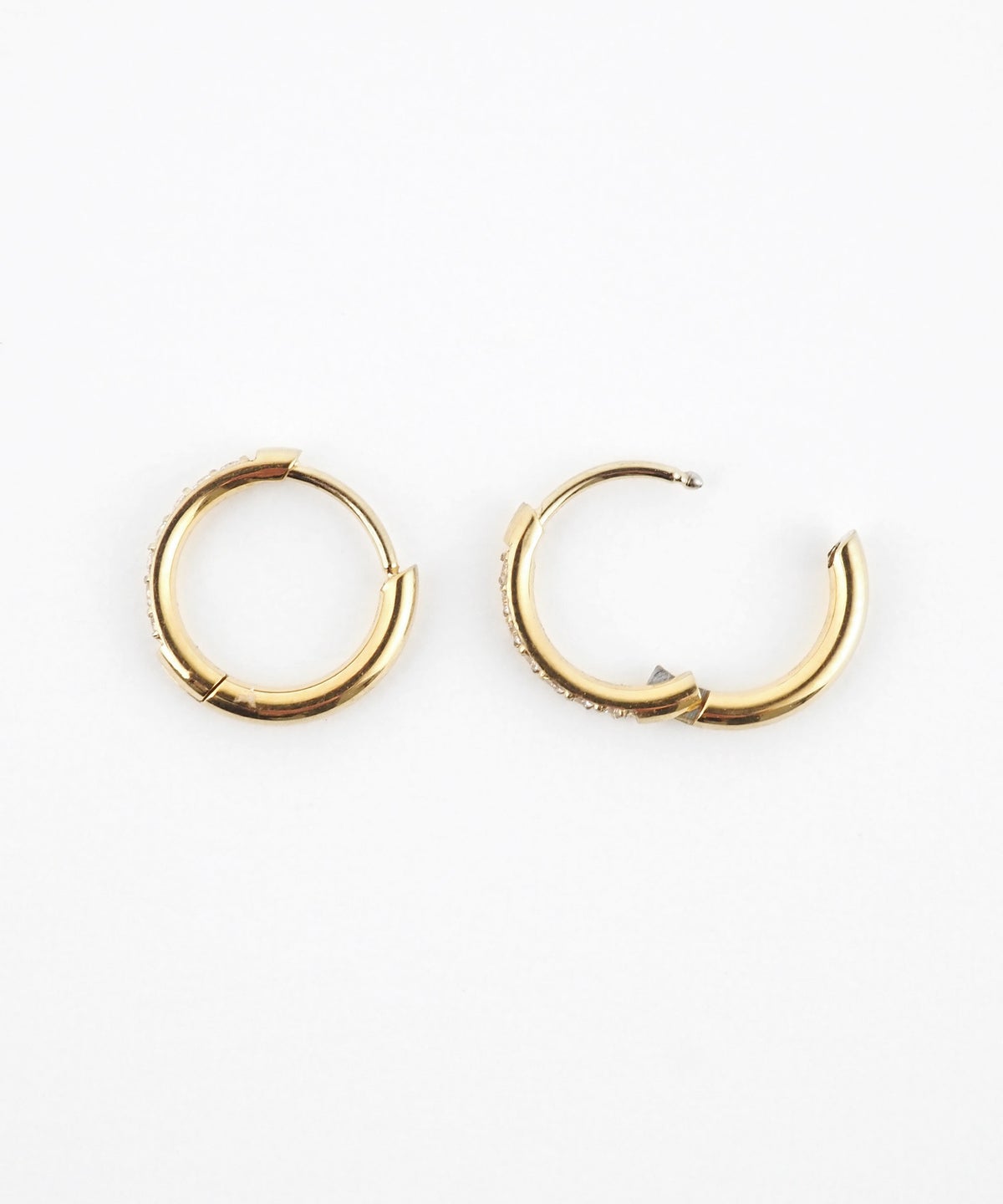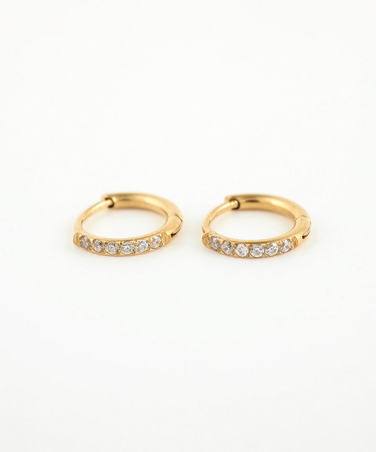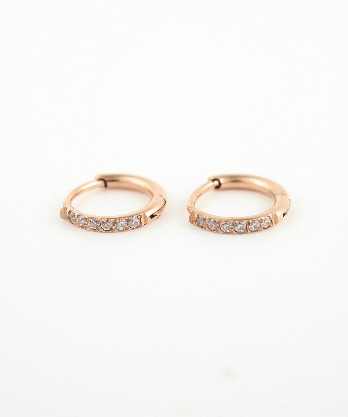 前面に並んだ繊細なキュービックジルコニアが、動きに合わせてキラリと輝くステンレスフープピアス。無駄のないミニマルなフォルムは、カジュアルなデニムスタイルからオフィススタイルまで、どんなコーデにも馴染む万能アイテム。ステンレス製なので、お肌に優しく、毎日気兼ねなくお使いいただけます。ペアピアス(両耳用)です。