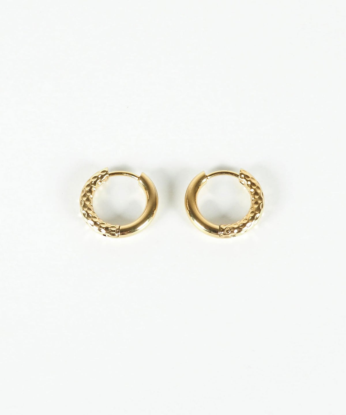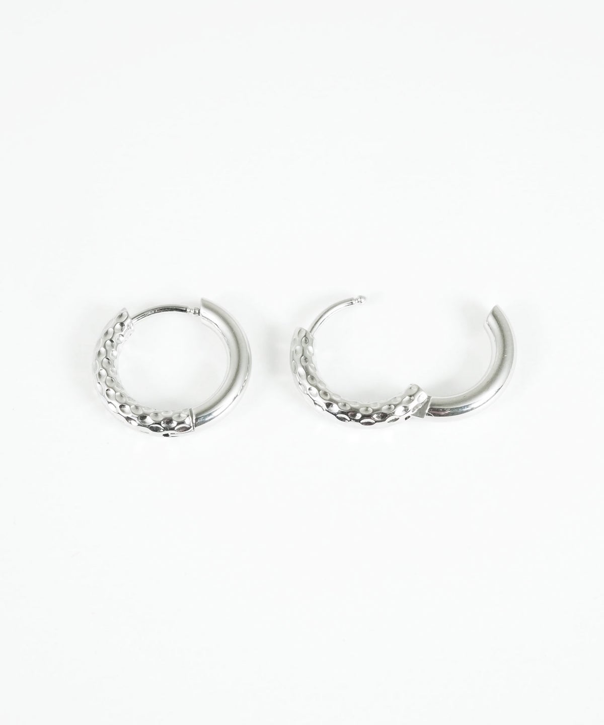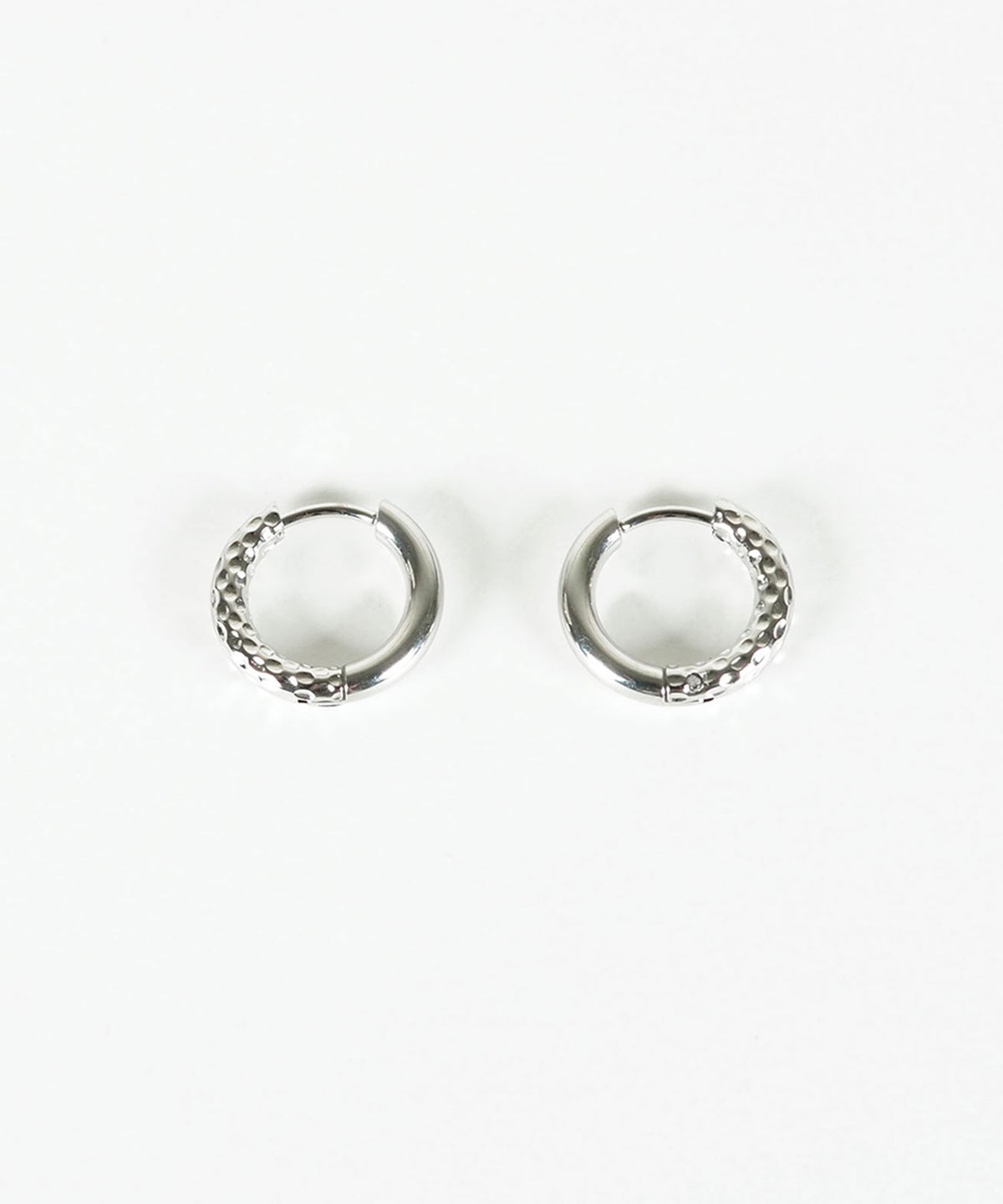 キャッチが本体と一体化した、カチッと留めるだけで簡単装着できるワンタッチピアス。リングの表面半分に繊細な凹凸を刻んだ、ハーフテクスチャデザインが特徴です。ソリッドな質感が光を美しく反射し、耳元に洗練された存在感を与えます。オフィスからデイリースタイルまでどんなシーンでも活躍する万能アイテムです。錆びにくく変色しにくいステンレス製なので、お手入れが簡単なのも嬉しいポイントです。ペアピアス(両耳用)です。