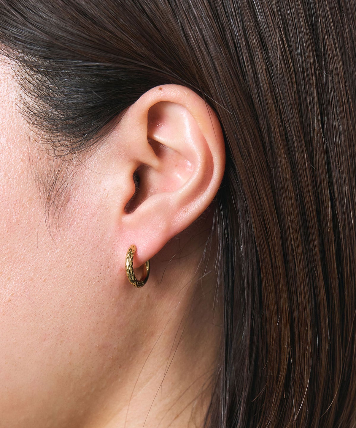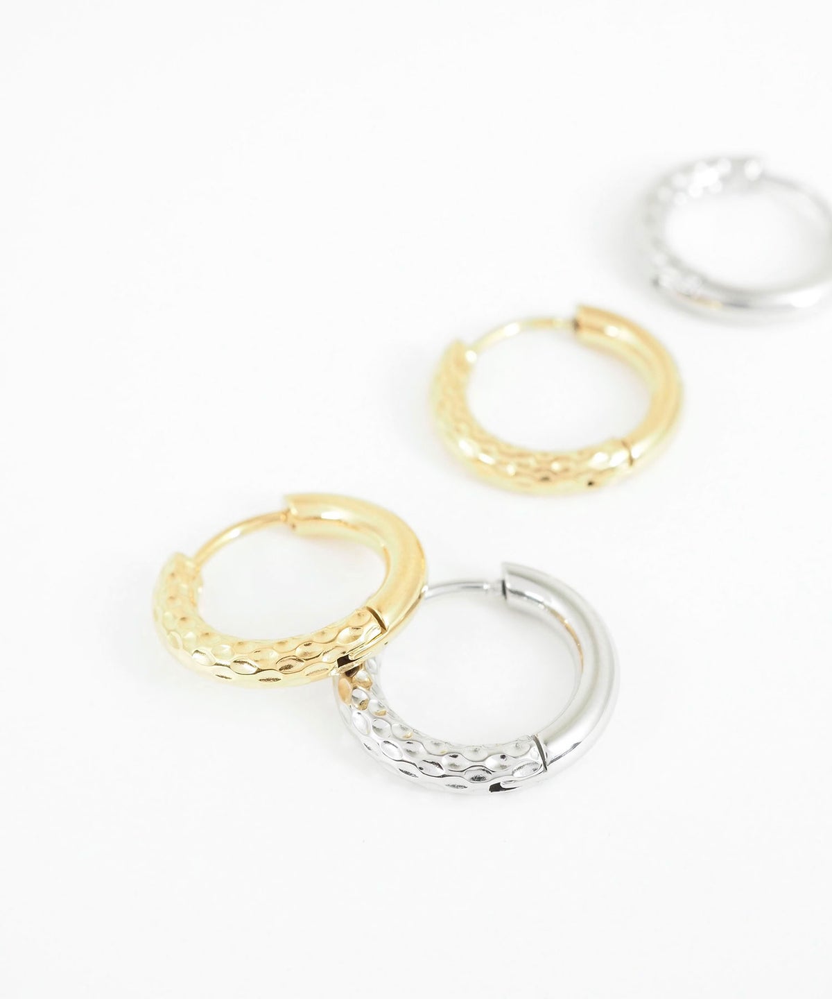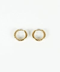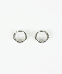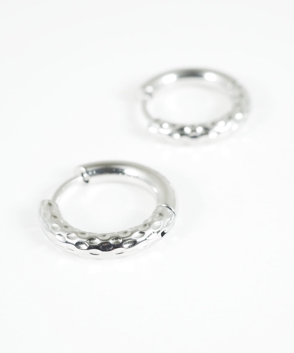 キャッチが本体と一体化した、カチッと留めるだけで簡単装着できるワンタッチピアス。リングの表面半分に繊細な凹凸を刻んだ、ハーフテクスチャデザインが特徴です。ソリッドな質感が光を美しく反射し、耳元に洗練された存在感を与えます。オフィスからデイリースタイルまでどんなシーンでも活躍する万能アイテムです。錆びにくく変色しにくいステンレス製なので、お手入れが簡単なのも嬉しいポイントです。ペアピアス(両耳用)です。