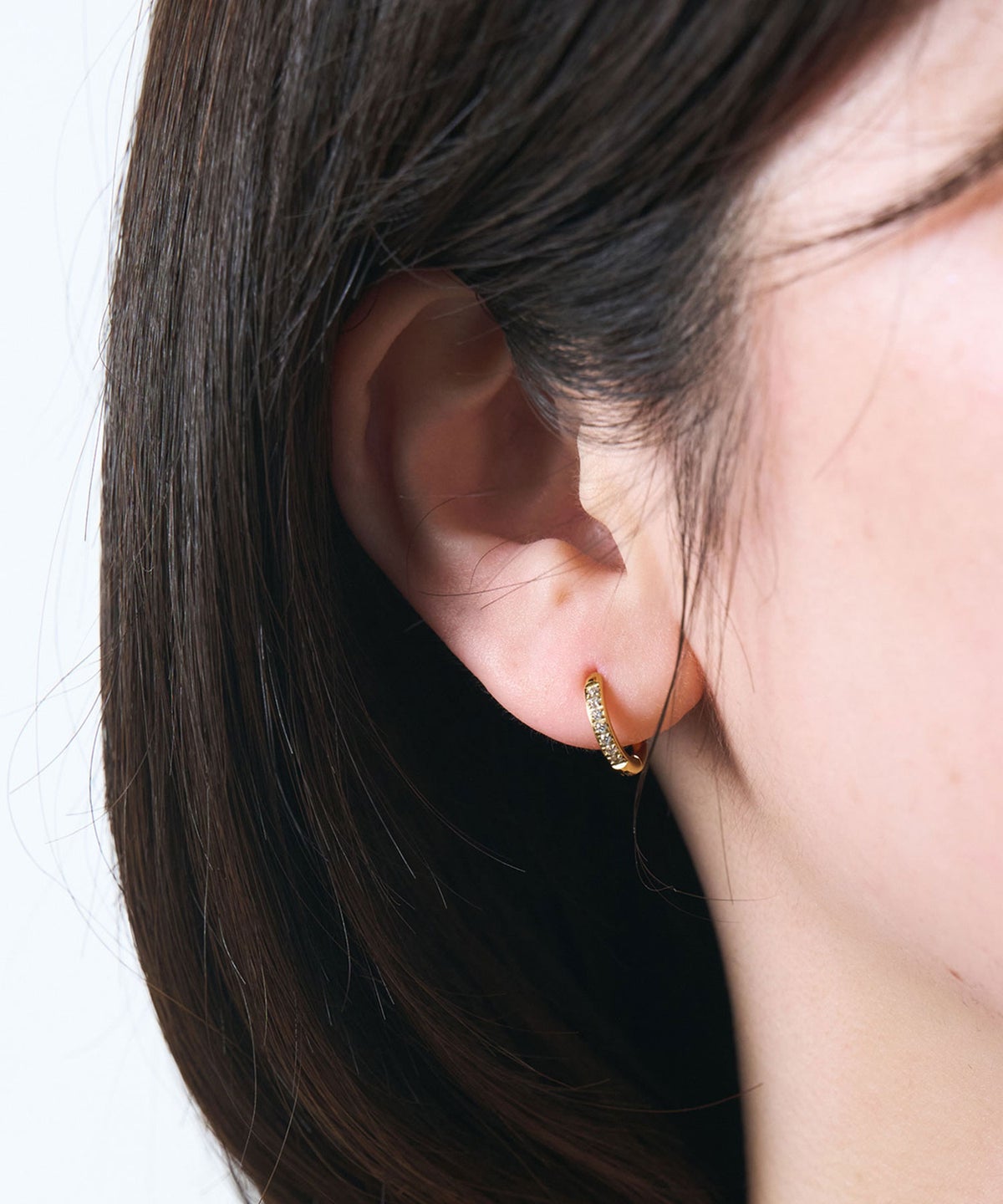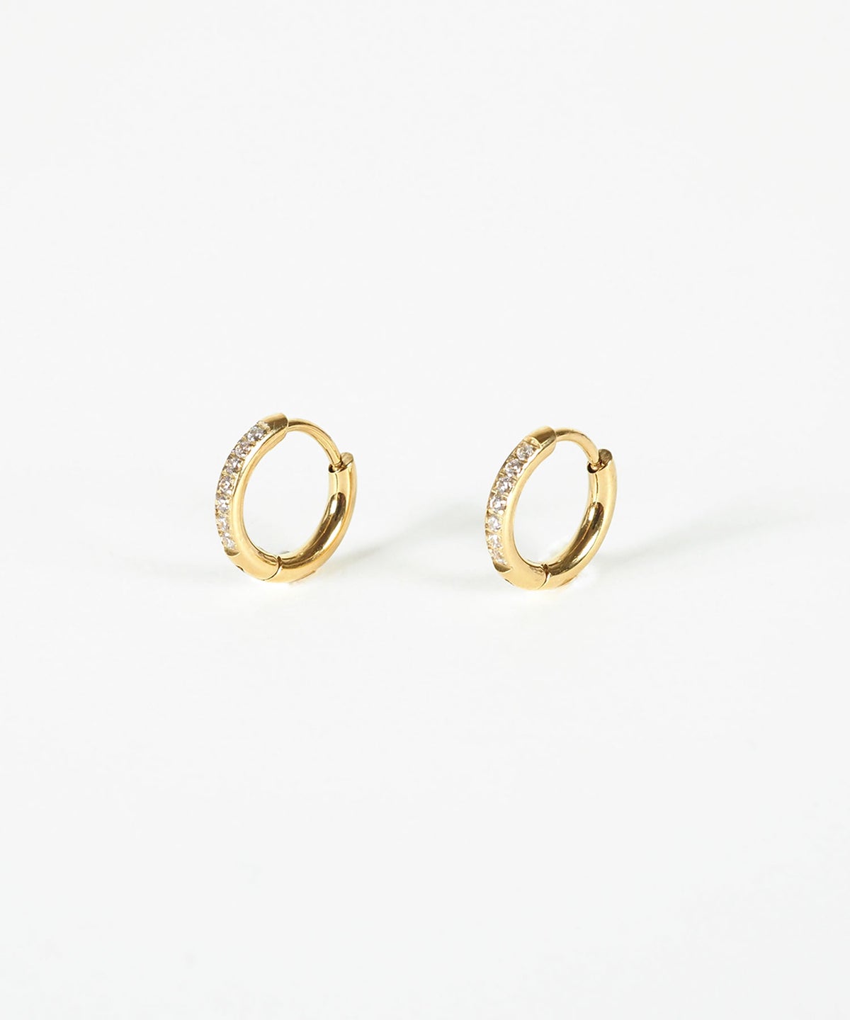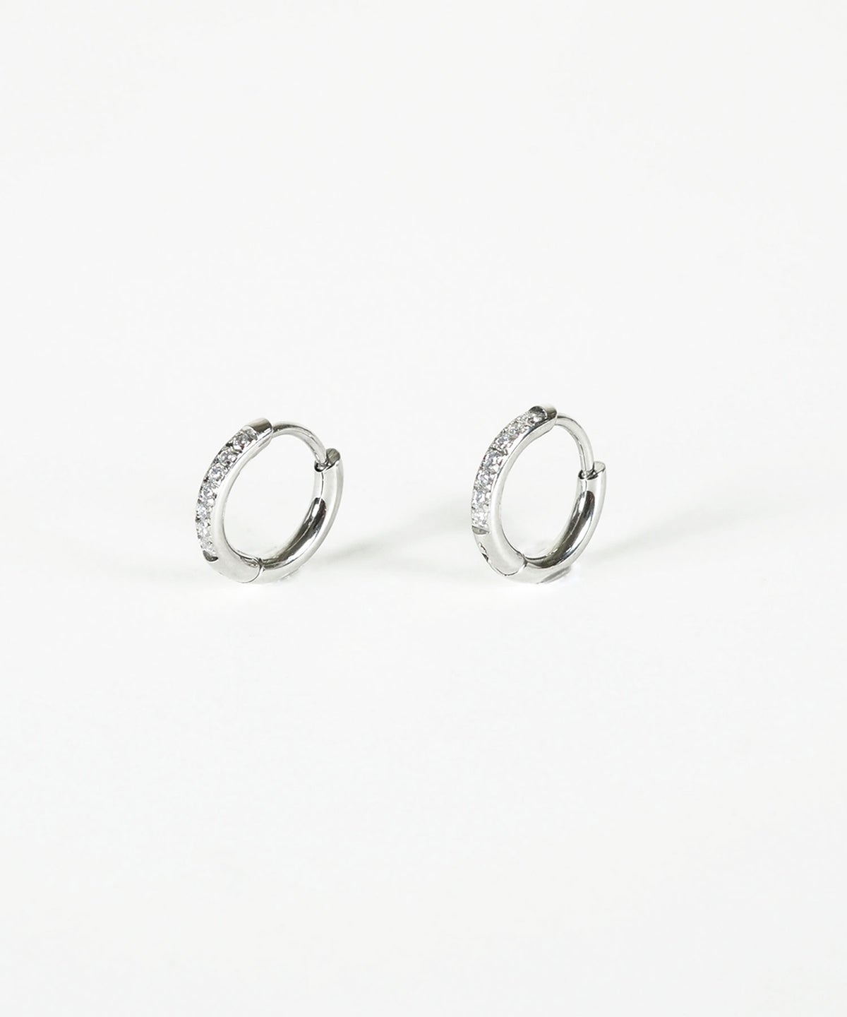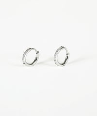 キャッチが本体と一体化した、カチッと留めるだけで簡単装着できるワンタッチピアス。リングの前面に沿って小粒のキュービックジルコニアを贅沢に敷き詰めた、華やかなデザイン。耳たぶに沿うようなミニサイズ感が上品で、洗練された耳元を演出します。オフィスからデイリースタイルまでどんなシーンでも活躍する万能アイテムです。錆びにくく変色しにくいステンレス製なので、お手入れが簡単なのも嬉しいポイントです。ペアピアス(両耳用)です。