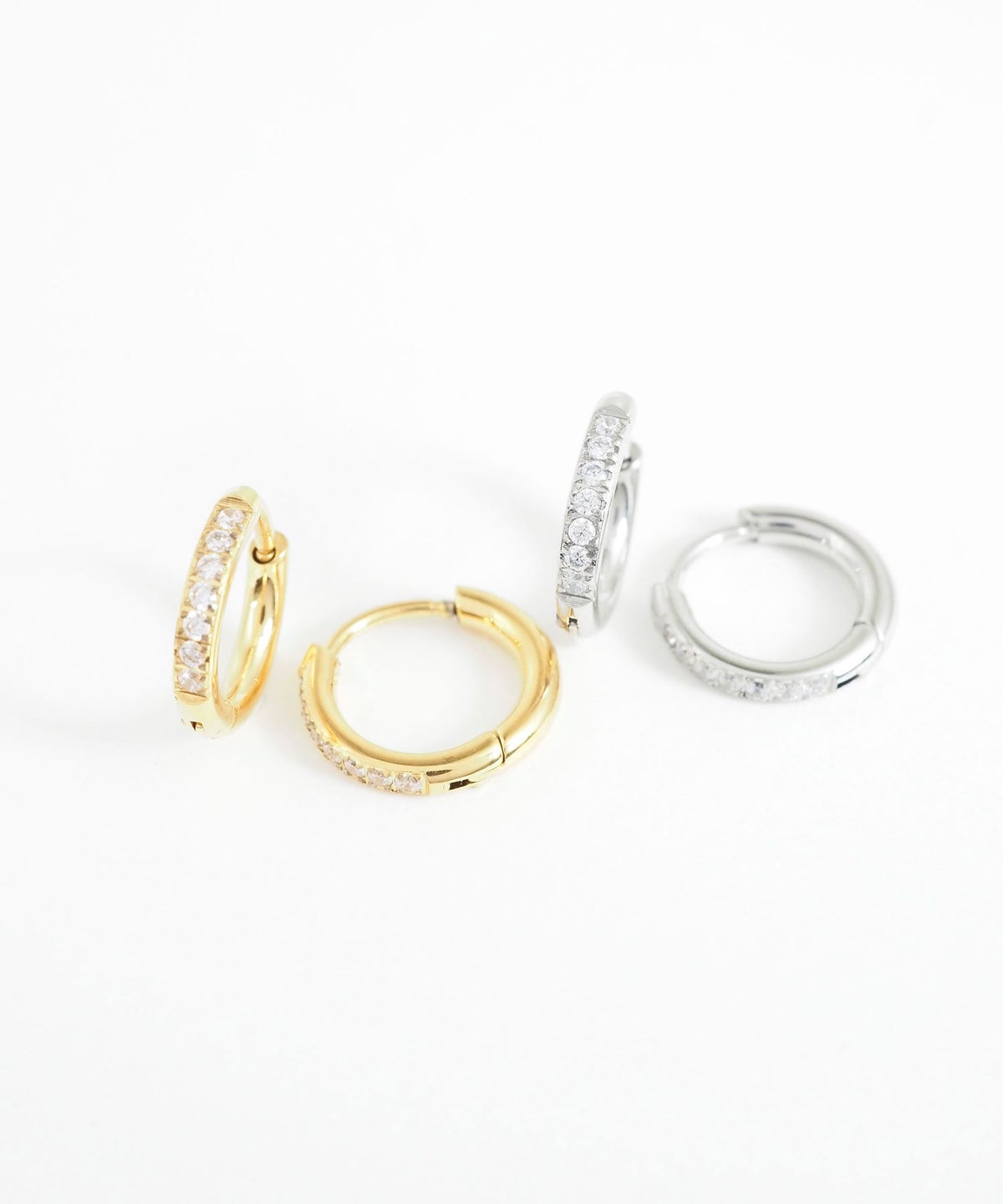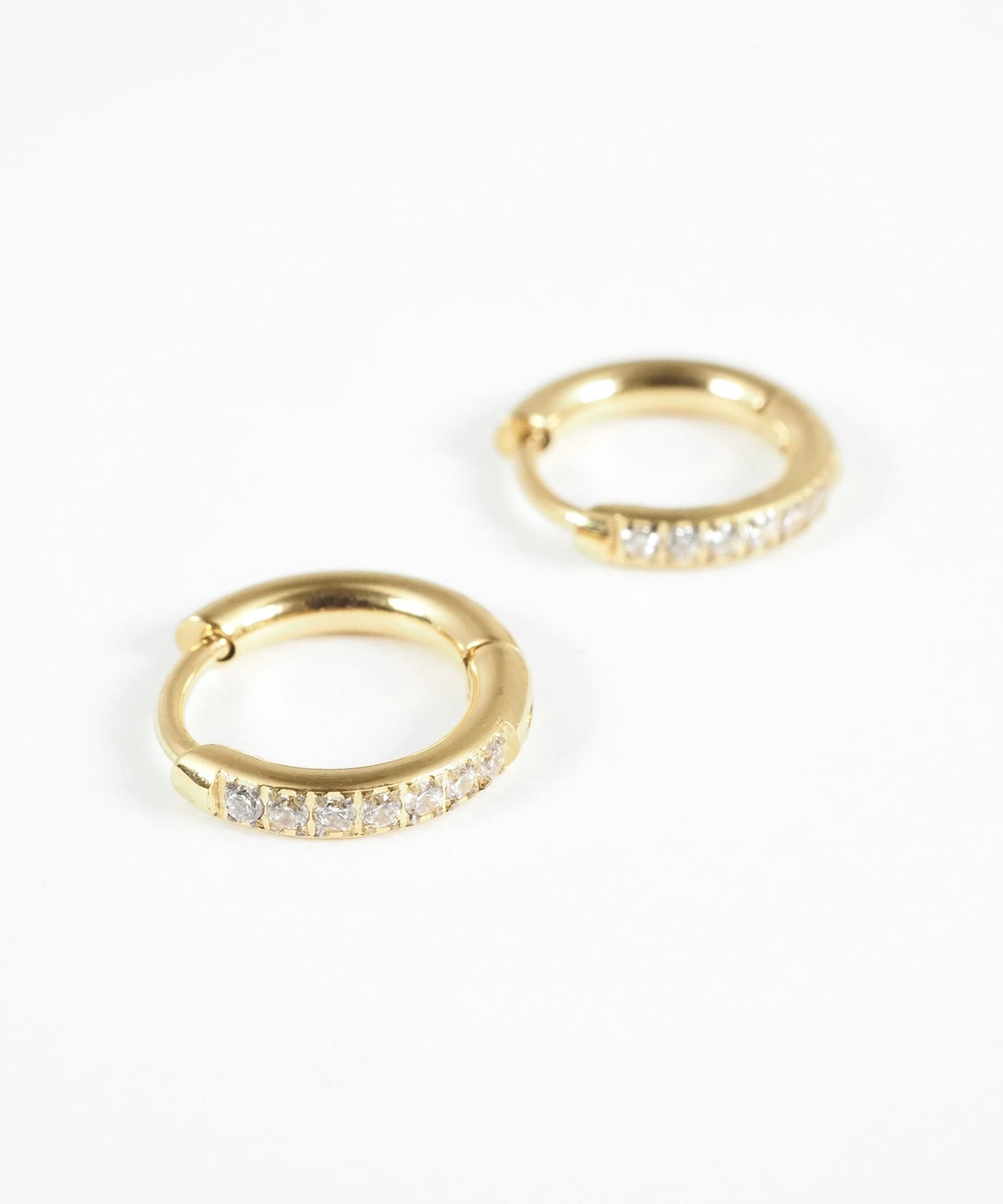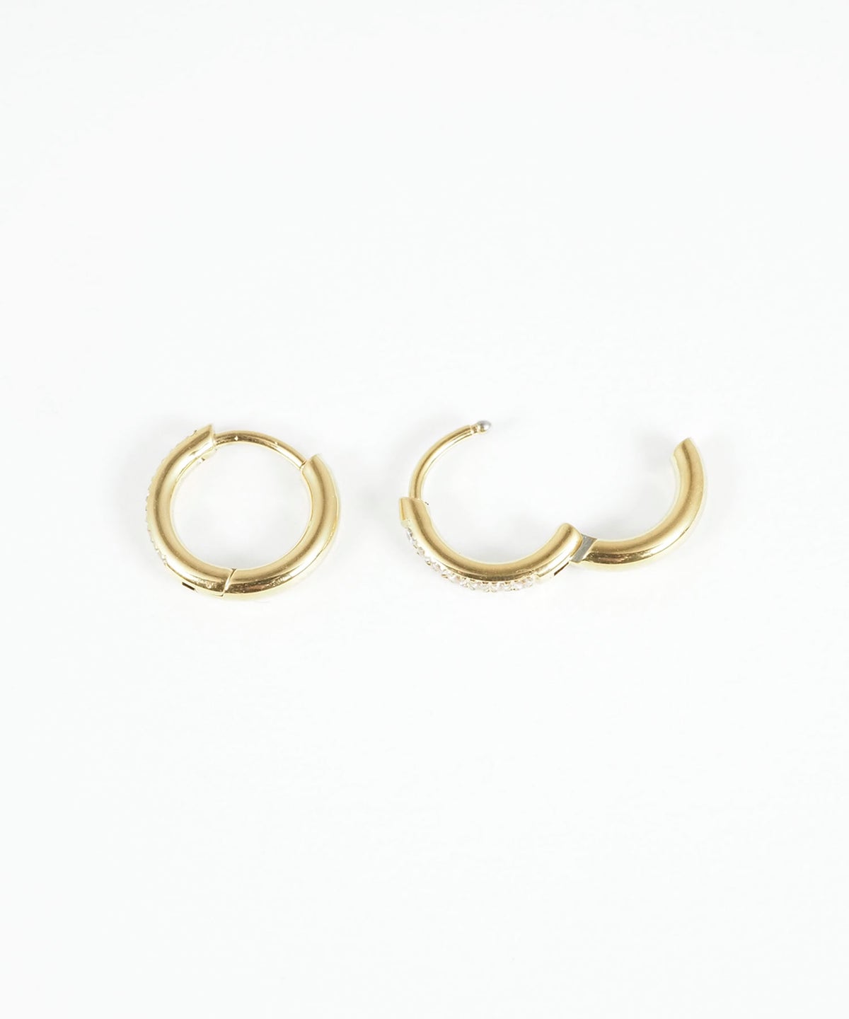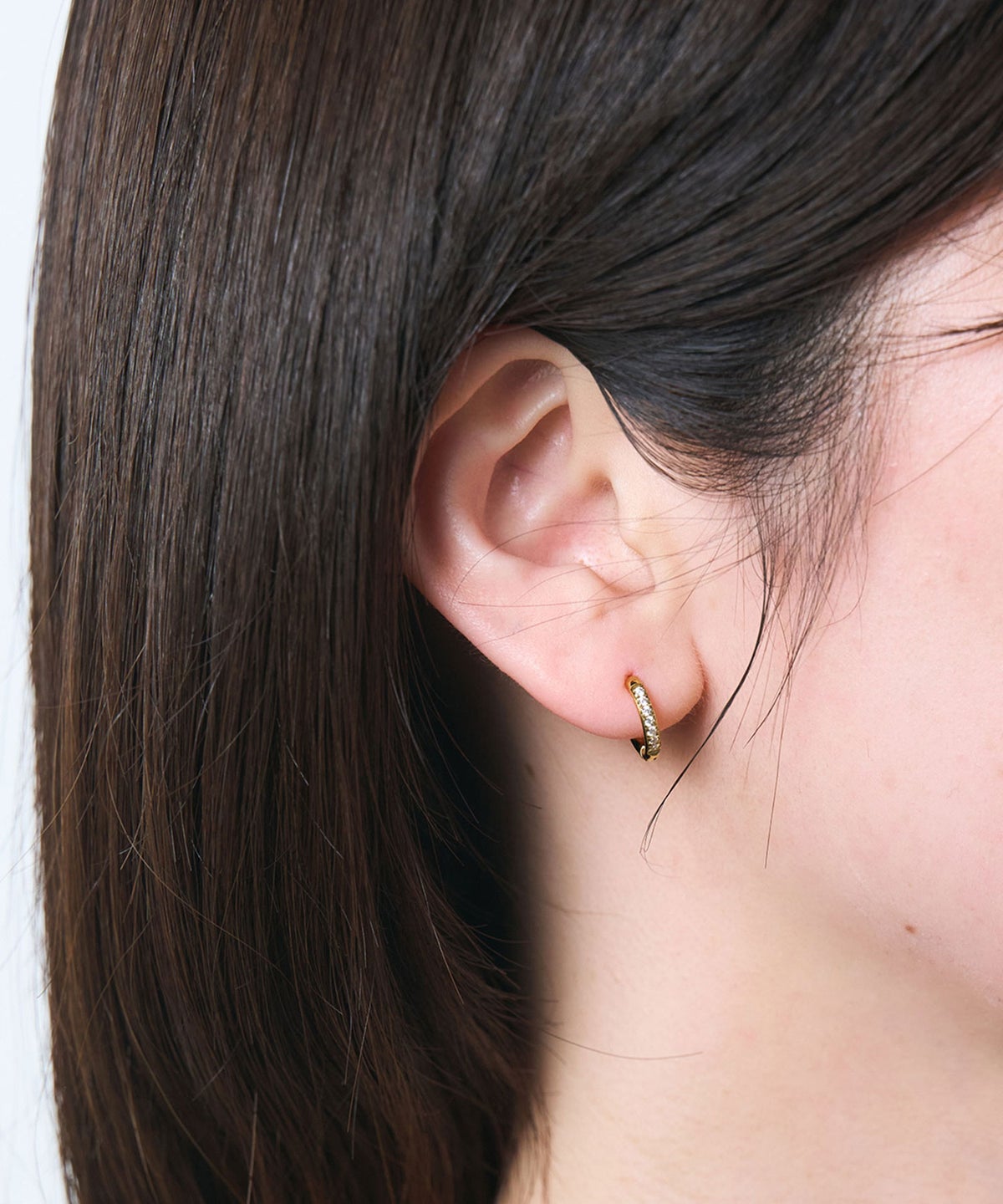 キャッチが本体と一体化した、カチッと留めるだけで簡単装着できるワンタッチピアス。リングの前面に沿って小粒のキュービックジルコニアを贅沢に敷き詰めた、華やかなデザイン。耳たぶに沿うようなミニサイズ感が上品で、洗練された耳元を演出します。オフィスからデイリースタイルまでどんなシーンでも活躍する万能アイテムです。錆びにくく変色しにくいステンレス製なので、お手入れが簡単なのも嬉しいポイントです。ペアピアス(両耳用)です。