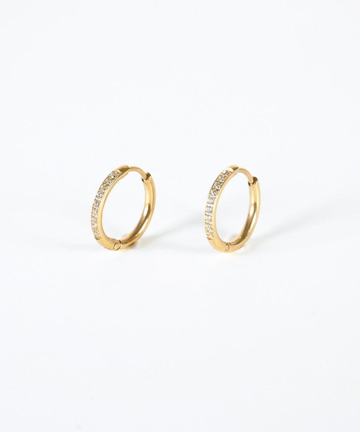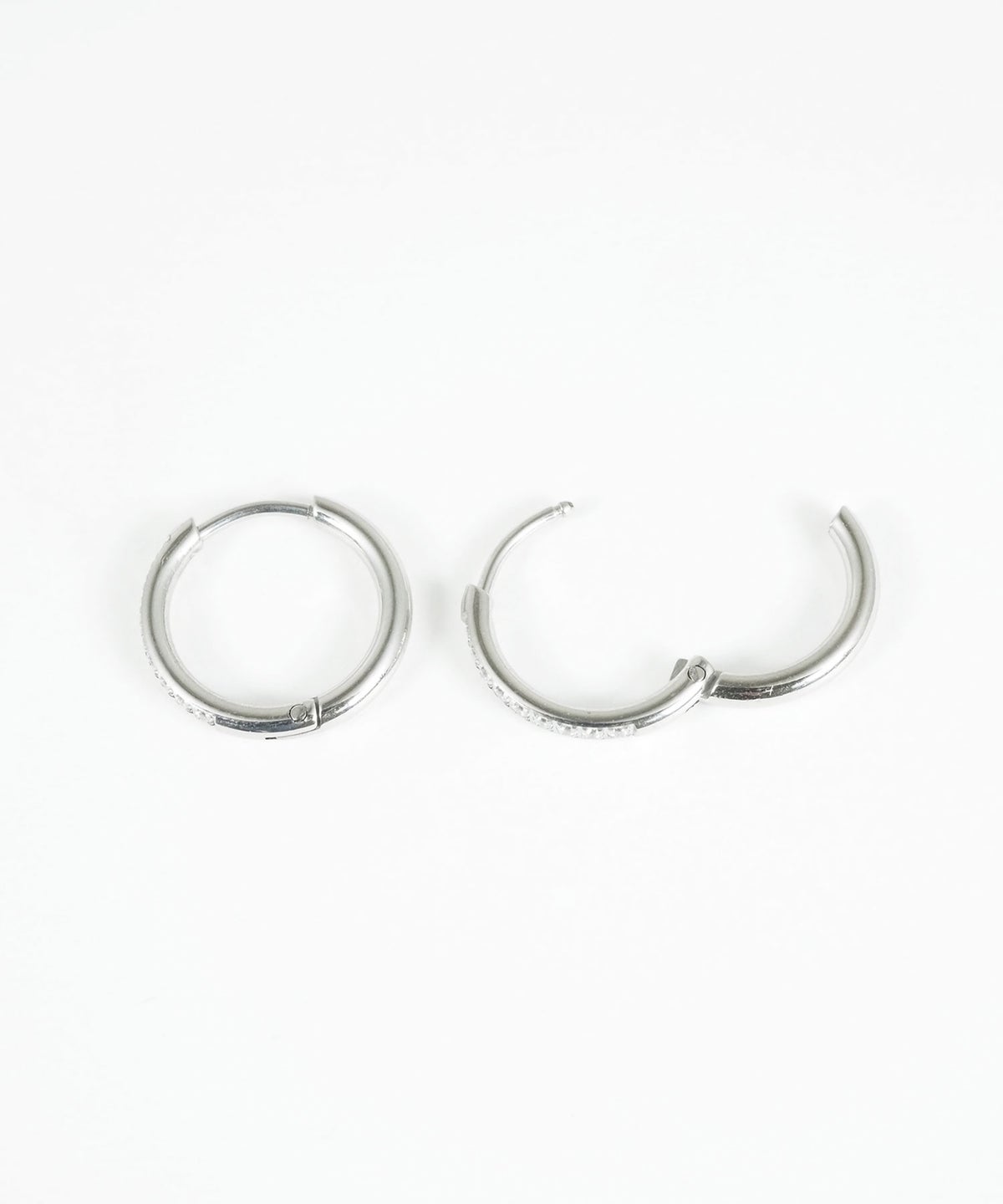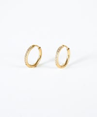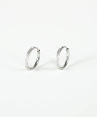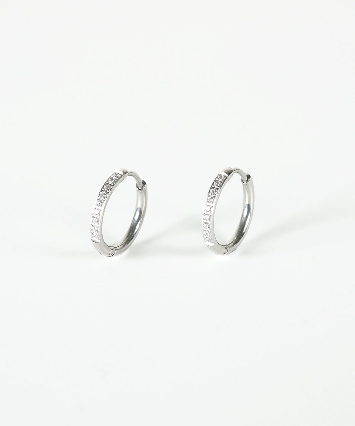 キャッチが本体と一体化した、カチッと留めるだけで簡単装着できるワンタッチピアス。リングの前面に沿って小粒のキュービックジルコニアを贅沢に敷き詰めた、華やかなデザイン。パッと目を引く存在感で洗練された耳元を演出します。オフィスからデイリースタイルまでどんなシーンでも活躍する万能アイテムです。錆びにくく変色しにくいステンレス製なので、お手入れが簡単なのも嬉しいポイントです。ペアピアス(両耳用)です。