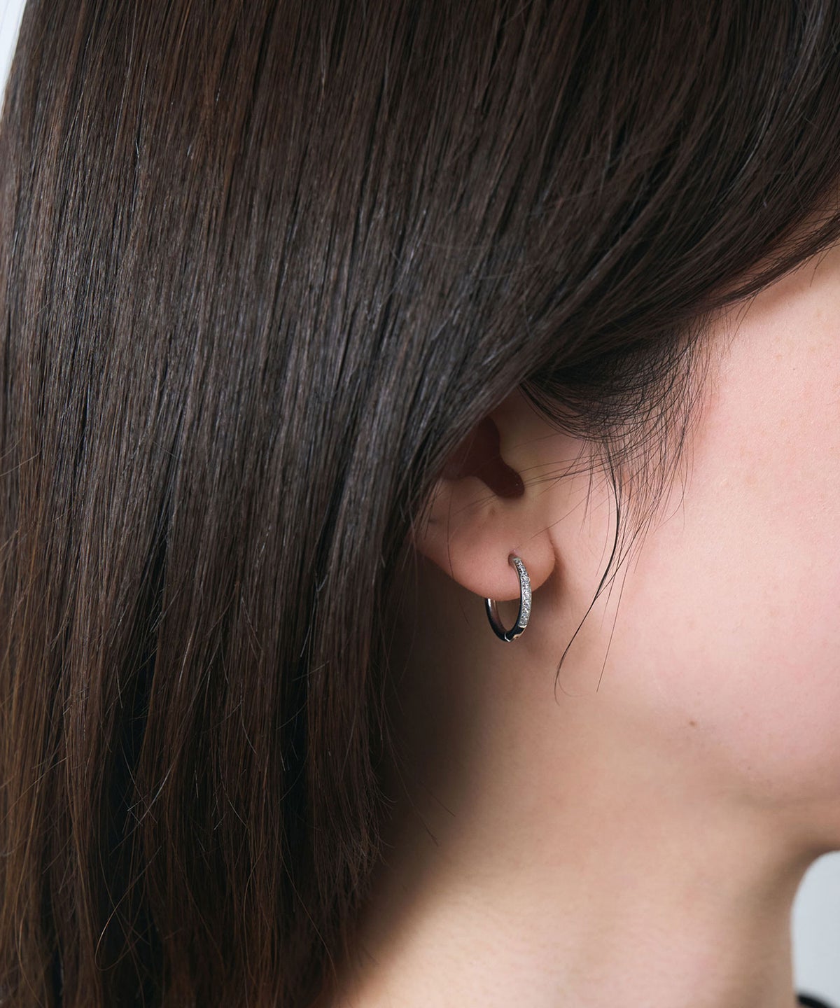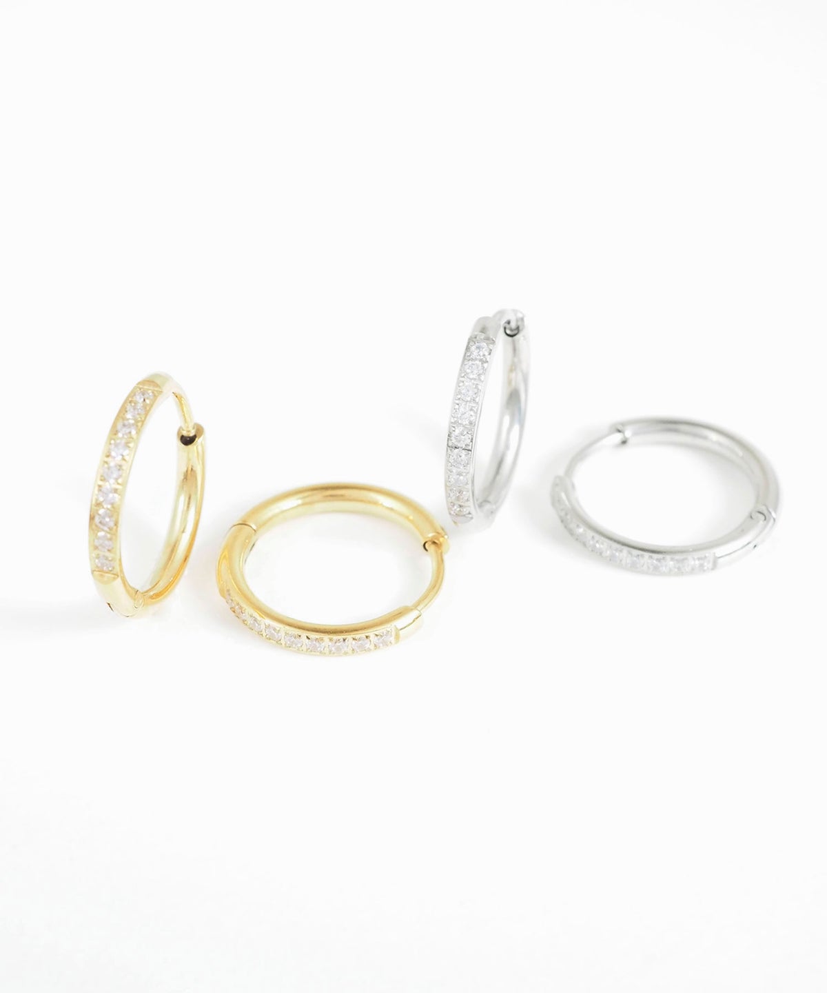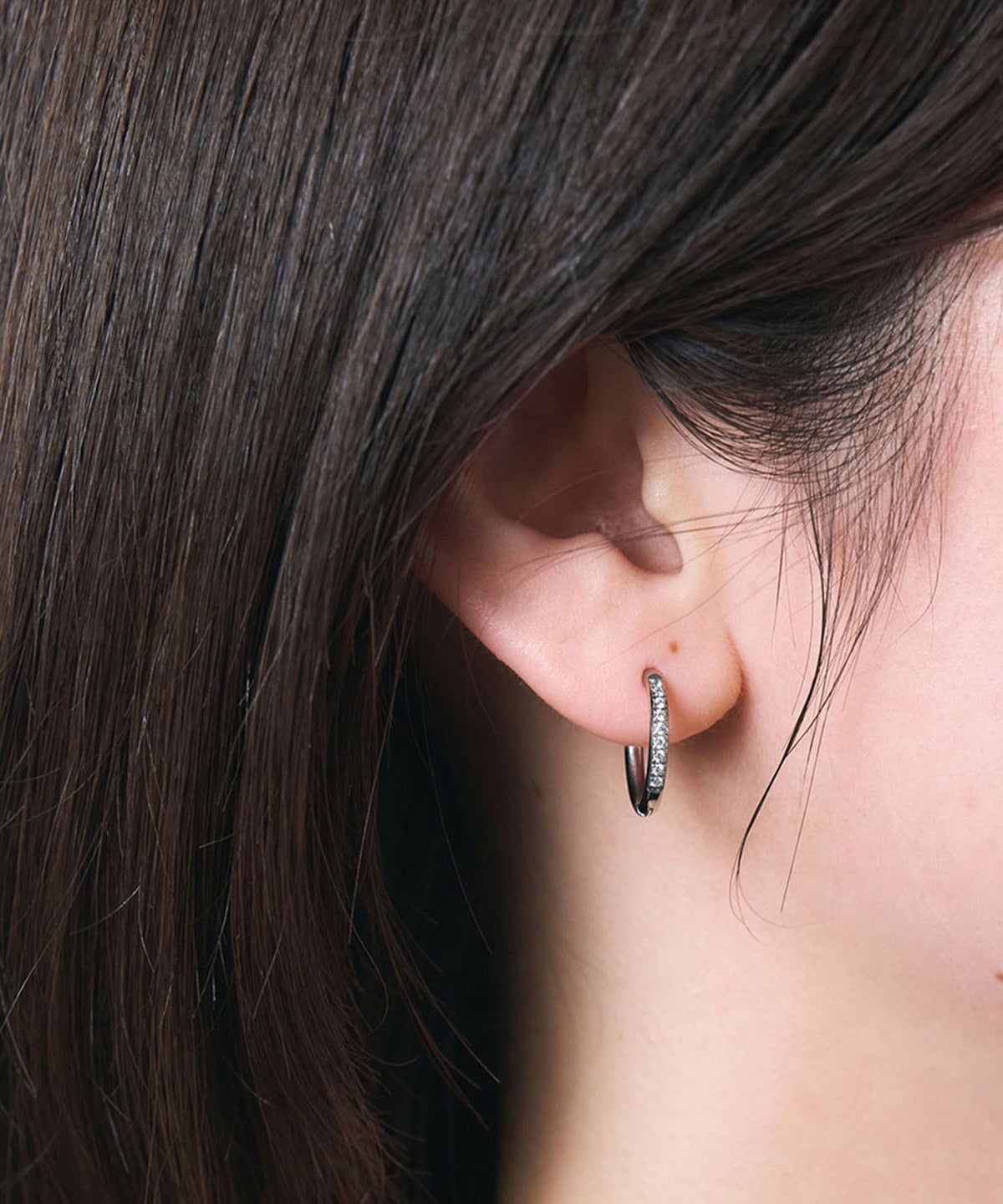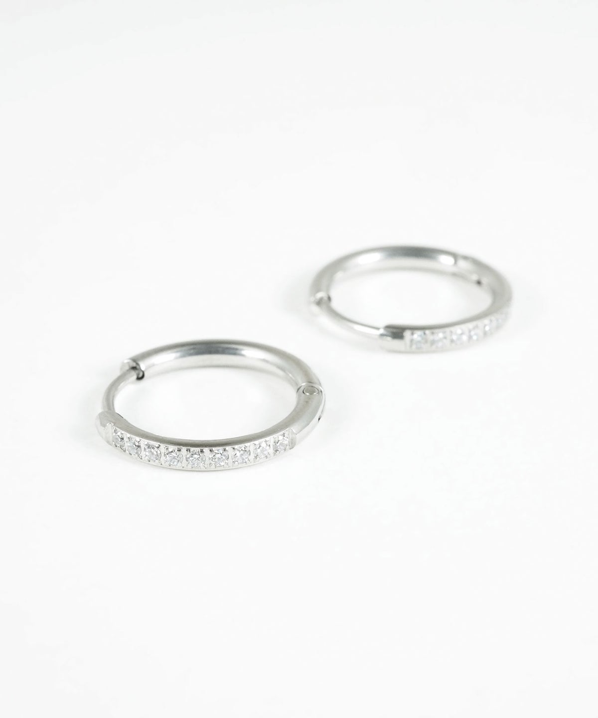キャッチが本体と一体化した、カチッと留めるだけで簡単装着できるワンタッチピアス。リングの前面に沿って小粒のキュービックジルコニアを贅沢に敷き詰めた、華やかなデザイン。パッと目を引く存在感で洗練された耳元を演出します。オフィスからデイリースタイルまでどんなシーンでも活躍する万能アイテムです。錆びにくく変色しにくいステンレス製なので、お手入れが簡単なのも嬉しいポイントです。ペアピアス(両耳用)です。