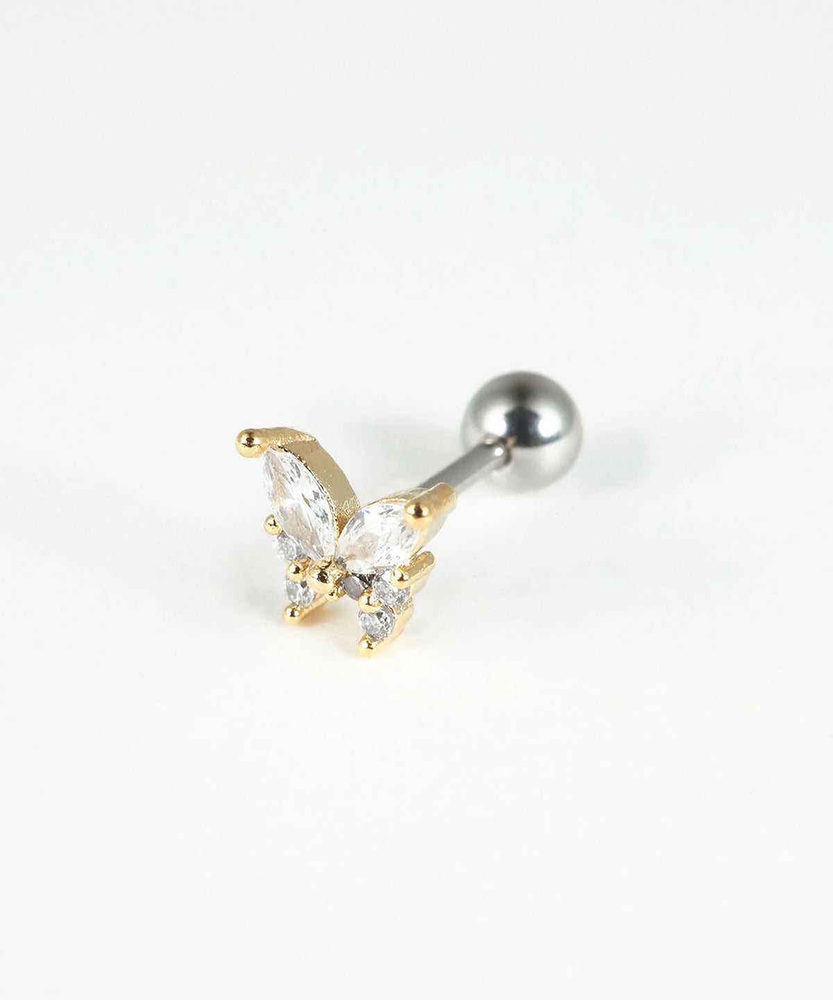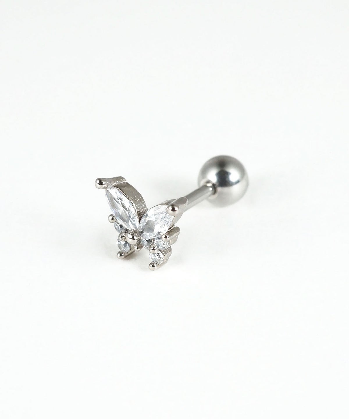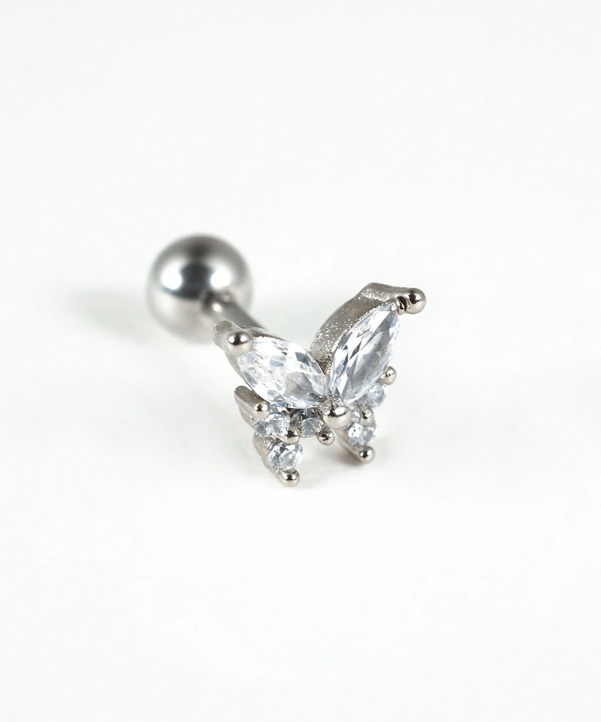 耳元はもちろん、軟骨や唇、眉など、お好みの部位にマルチに使える万能なボディピアス。ジルコニアを贅沢にあしらった可憐なバタフライ(蝶々)モチーフが上品な輝きを放ち、どんなスタイルにも自然に馴染みます。医療用サージカルステンレスを使用しているため、変色や錆びに強く、美しい輝きを長くお楽しみいただけます。