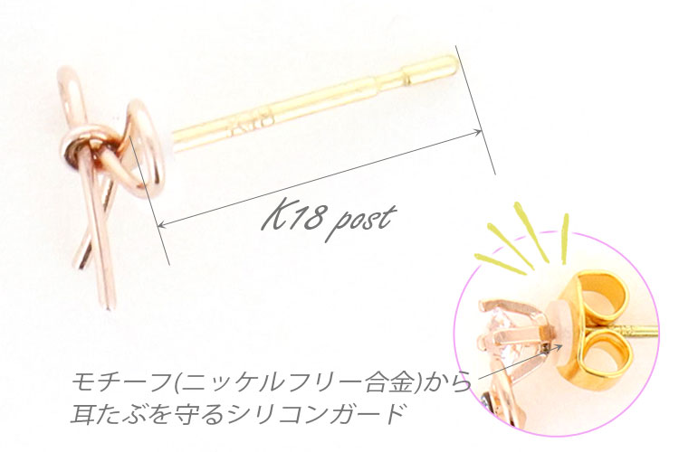貴重な金を75%含む素材「18金」をポスト部分に使用した、18金ポストピアス商品一覧です。 金は金属アレルギーが起こりにくい素材です。純金(24金)は柔らかくアクセサリーには不向きですが、18金は金の上質さはそのままに、硬く強度が高いため、傷や変形を防ぎやすくアクセサリーに適しています。モチーフと耳の間にシリコンガードを挟むことで、アレルギー反応を起こす可能性のある素材ができるだけ耳に触れないよう配慮しているため、金属アレルギーをお持ちの方にも安心してお使いいただけるシリーズです。