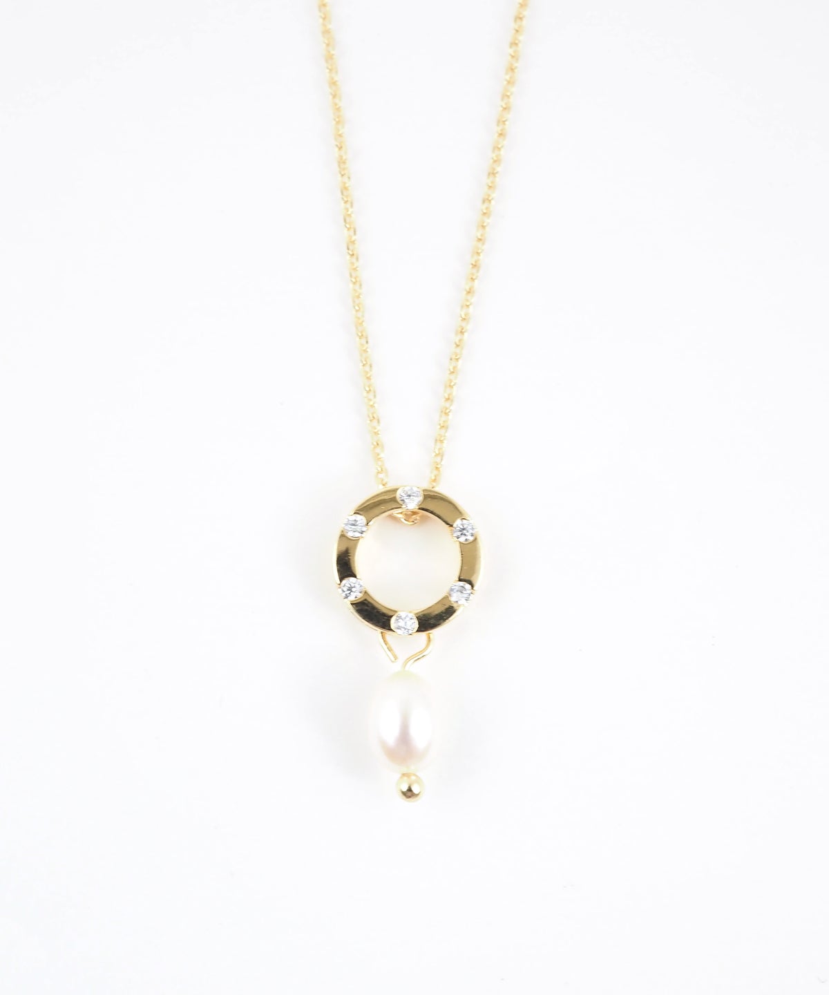 上品な輝きのビジューを散りばめたサークルモチーフに、艶やかな淡水パールのアクセントを添えた、ネックレスとピアスのセットです。柔らかな光沢を放つ淡水パールが、ビジューの華やかさに清楚で上品な印象をプラスします。