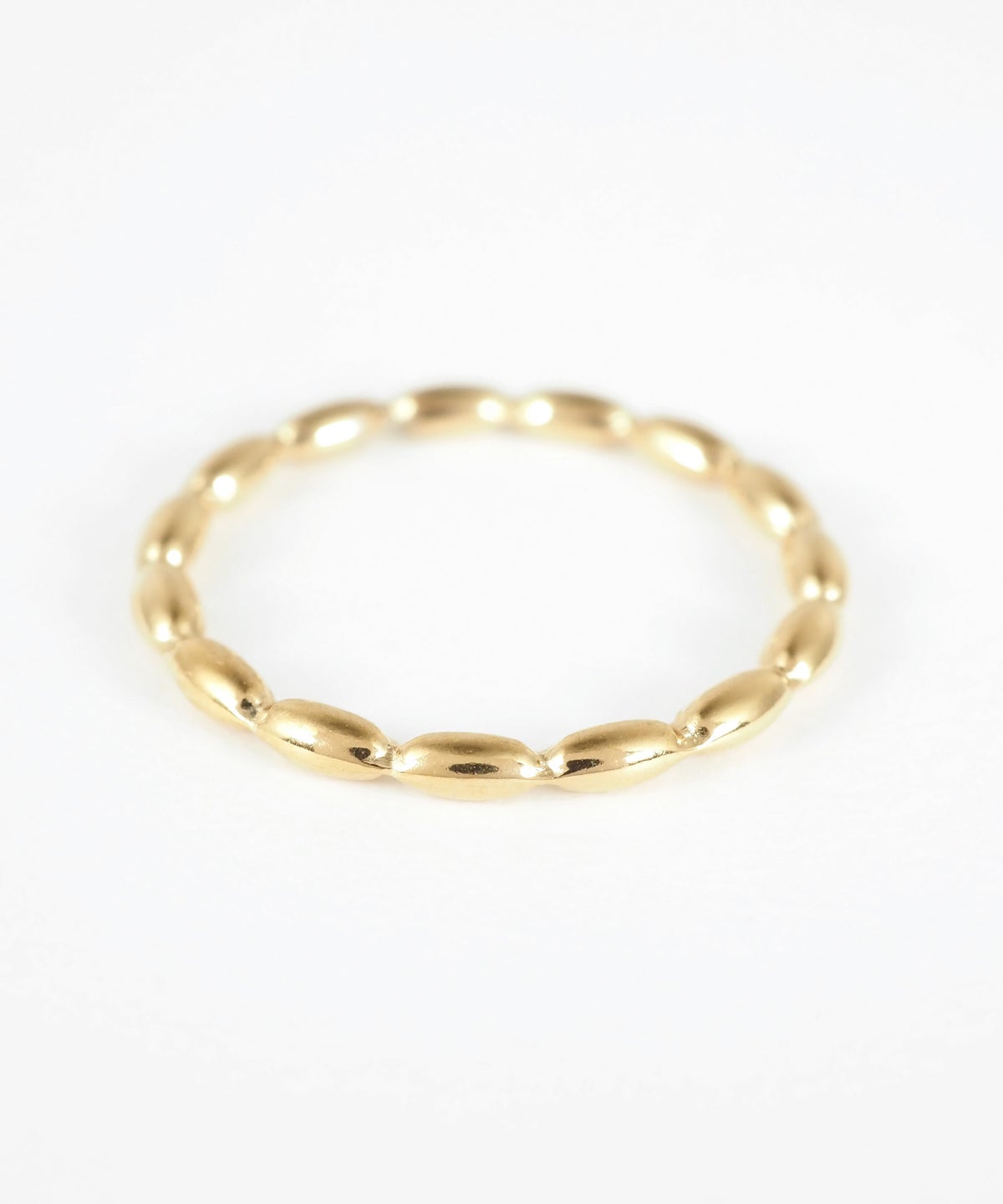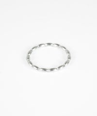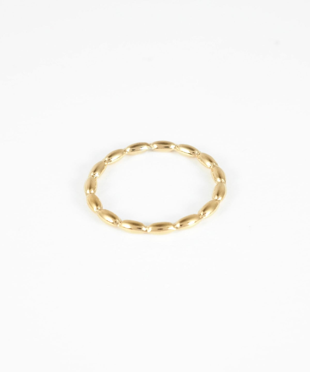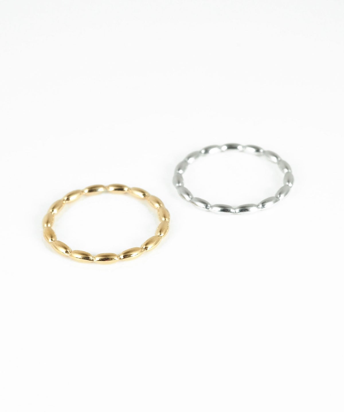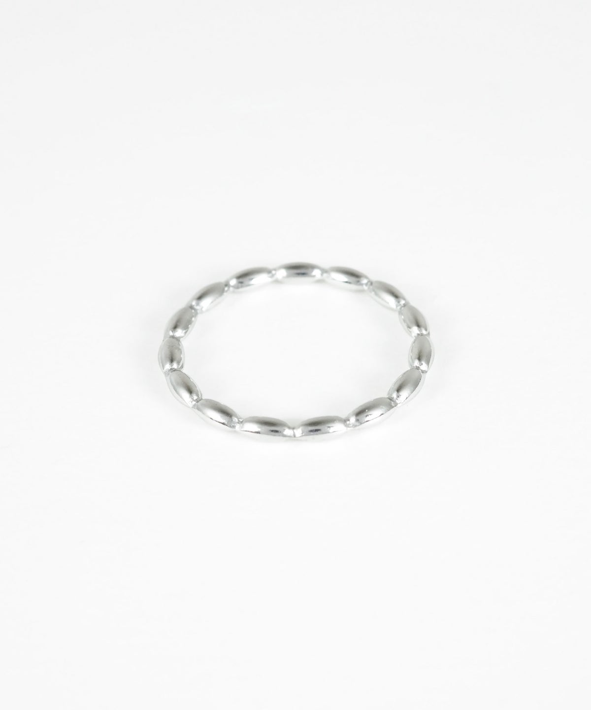金属アレルギーに対応したステンレス素材のリング。一粒一粒が光を反射する、楕円のビーズを連ねたような繊細なフォルム。お手持ちのリングとのレイヤードにも美しく馴染みます。水や汗に強く、錆びにくく変色もしにくいのでお手入れも簡単◎ 硬くて丈夫な素材なので長く愛用して頂けるアクセサリーです。