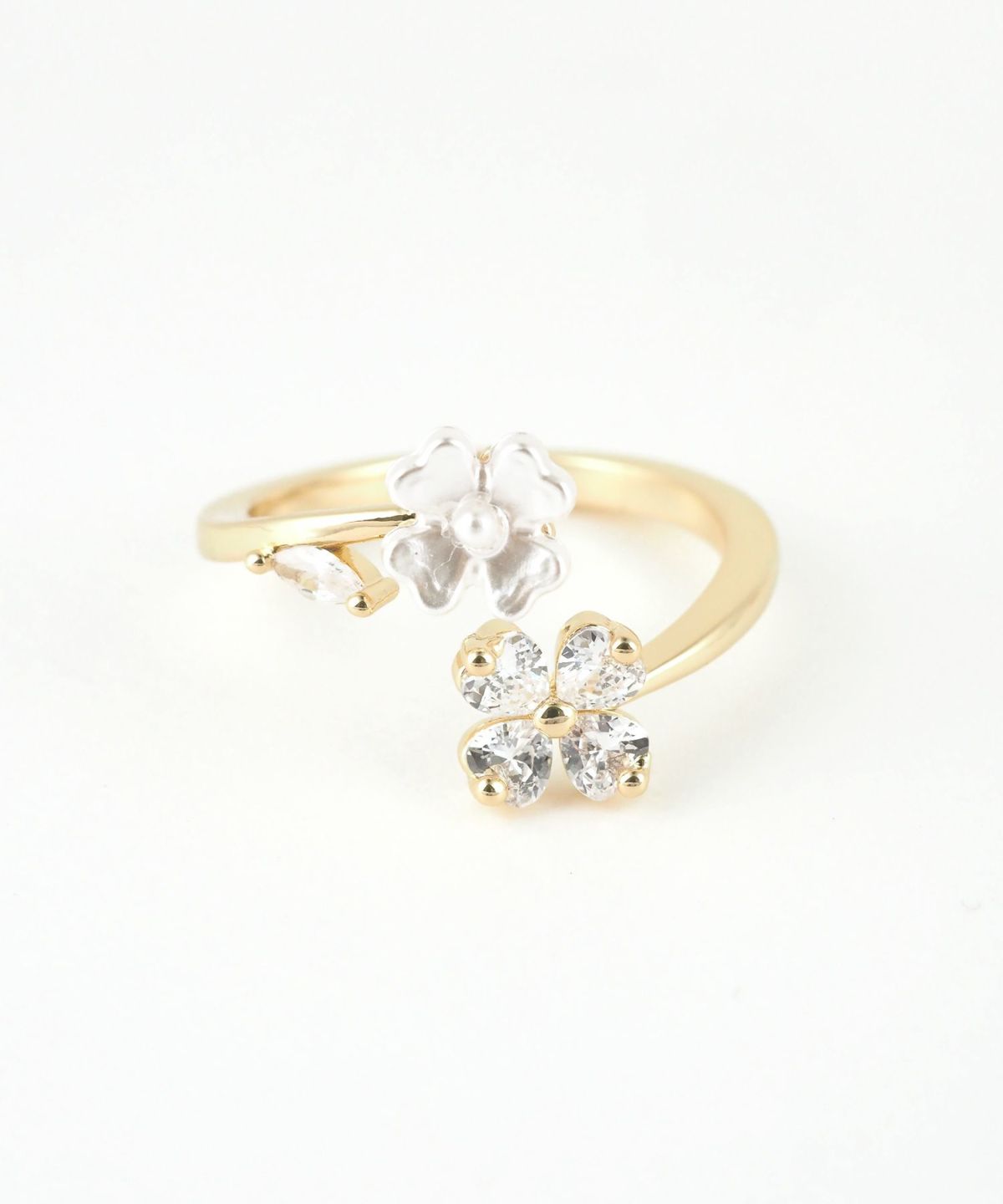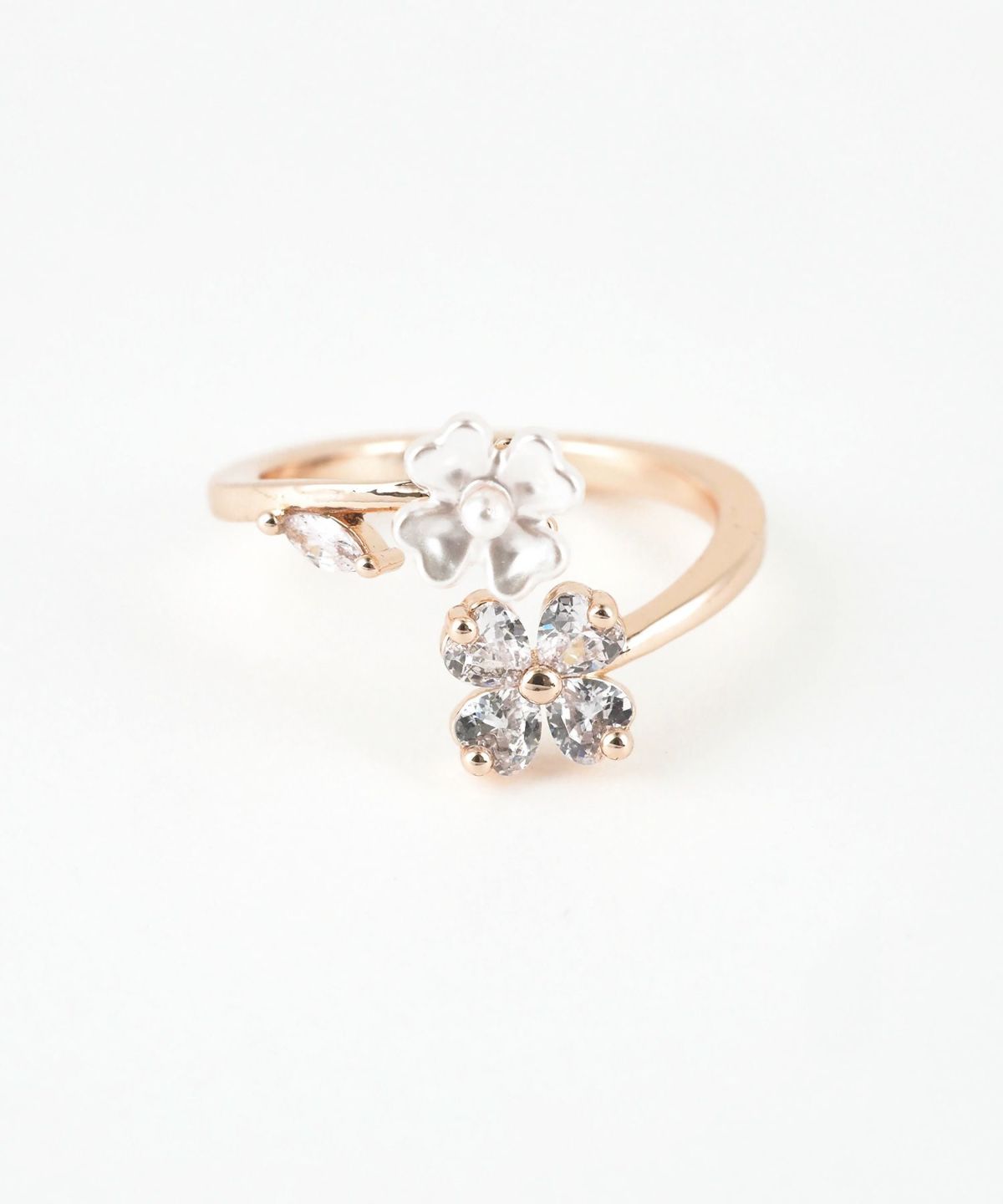 2つの異なる質感のフラワーモチーフが大人可愛いオープンリング。 アシンメトリーなデザインが、指元に抜け感と洗練された印象を与えてくれます。