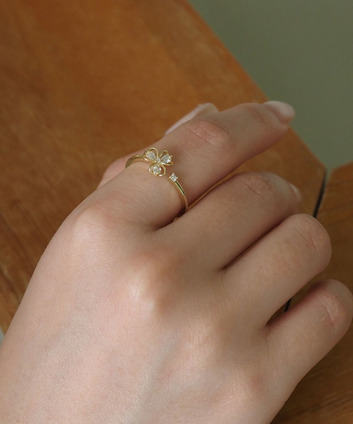 指先を美しく見せる、絶妙なバランスのオープンリング。 ミニマムな三つ葉モチーフと一粒ストーンが、指元に「抜け感」と華やかさをプラスします。 重ね付けもしやすい細身のラインなので、お手持ちのアクセサリーとのコーディネートも自由自在です。