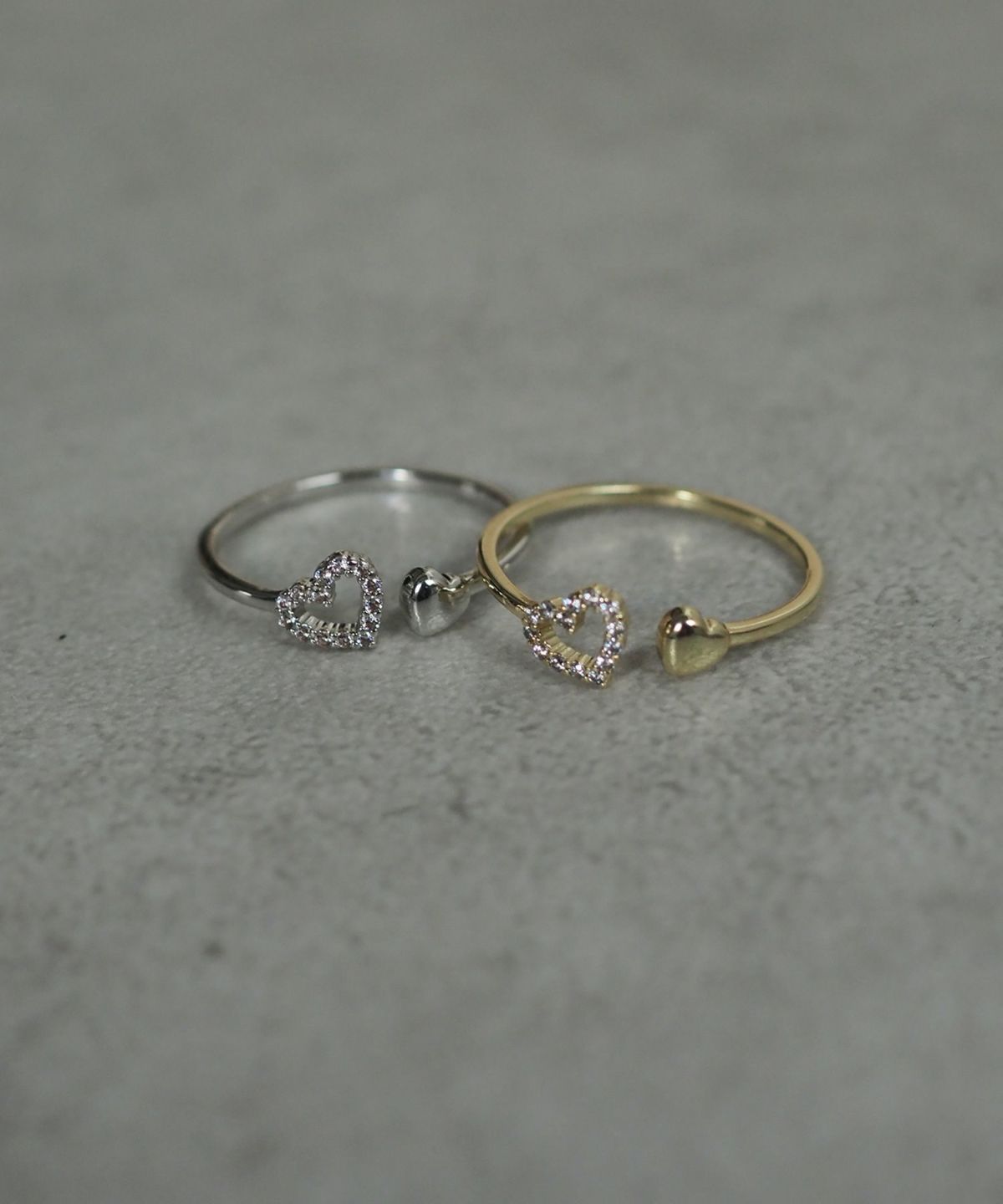 繊細に輝くオープンハートと、コロンとしたフォルムが愛らしいメタルハートをあしらったオープンリング。一石ずつ丁寧に敷き詰められたキュービックジルコニアが、光を反射して手元を華やかに演出。対照的なメタルの光沢感が、甘すぎない洗練された印象を与えます。