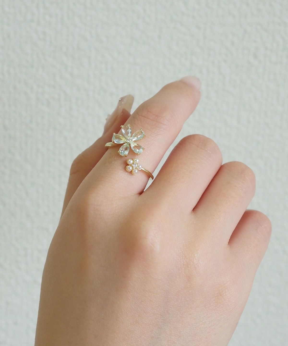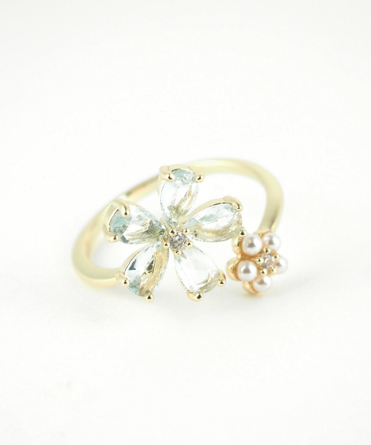 ブルーキュービックとパールの花モチーフが美しい、透明感あふれるオープンリング。 質感の異なる二つの花が、手元を優しく彩ります。程よい抜け感で、日常に爽やかな輝きを添えるアイテムです。