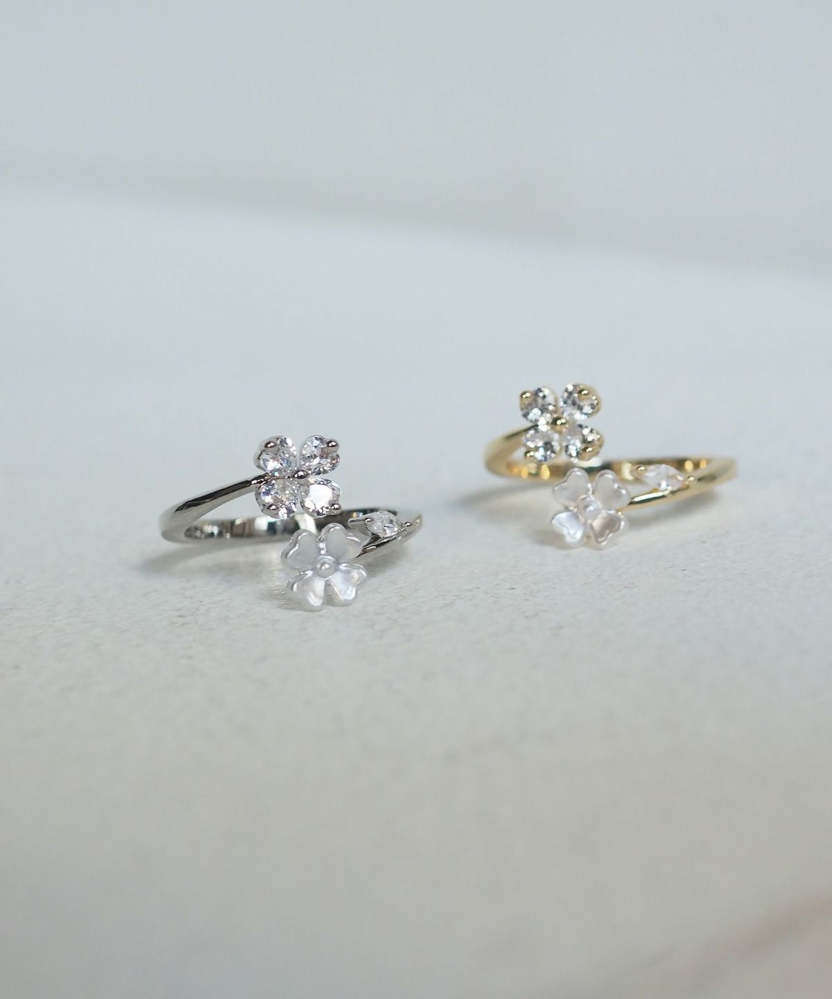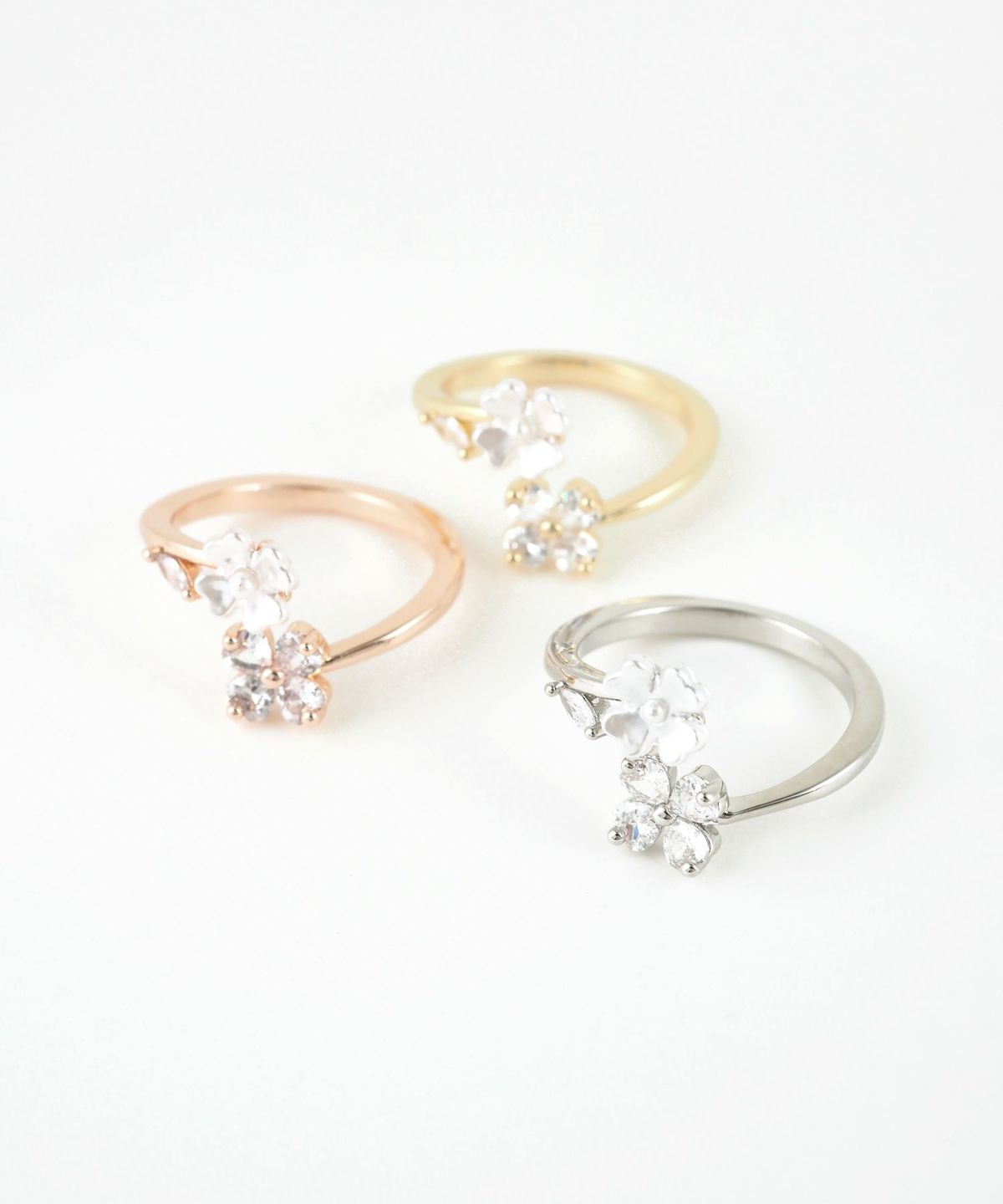 2つの異なる質感のフラワーモチーフが大人可愛いオープンリング。 アシンメトリーなデザインが、指元に抜け感と洗練された印象を与えてくれます。