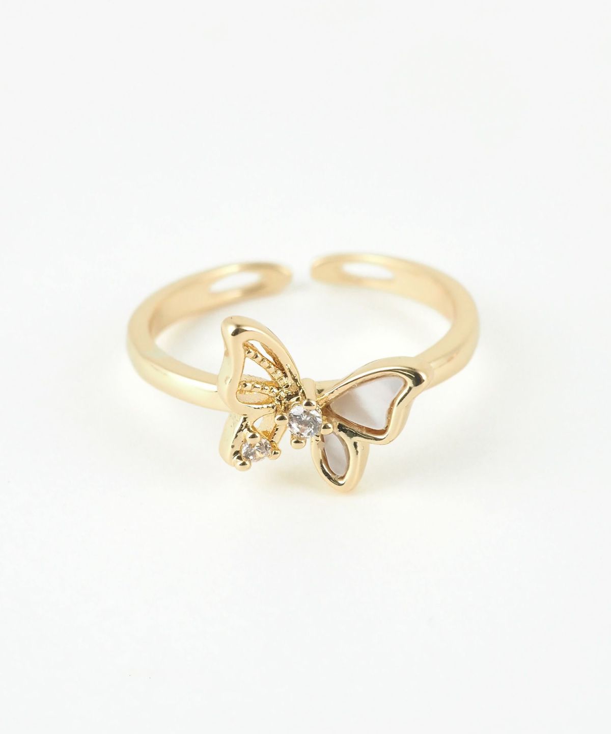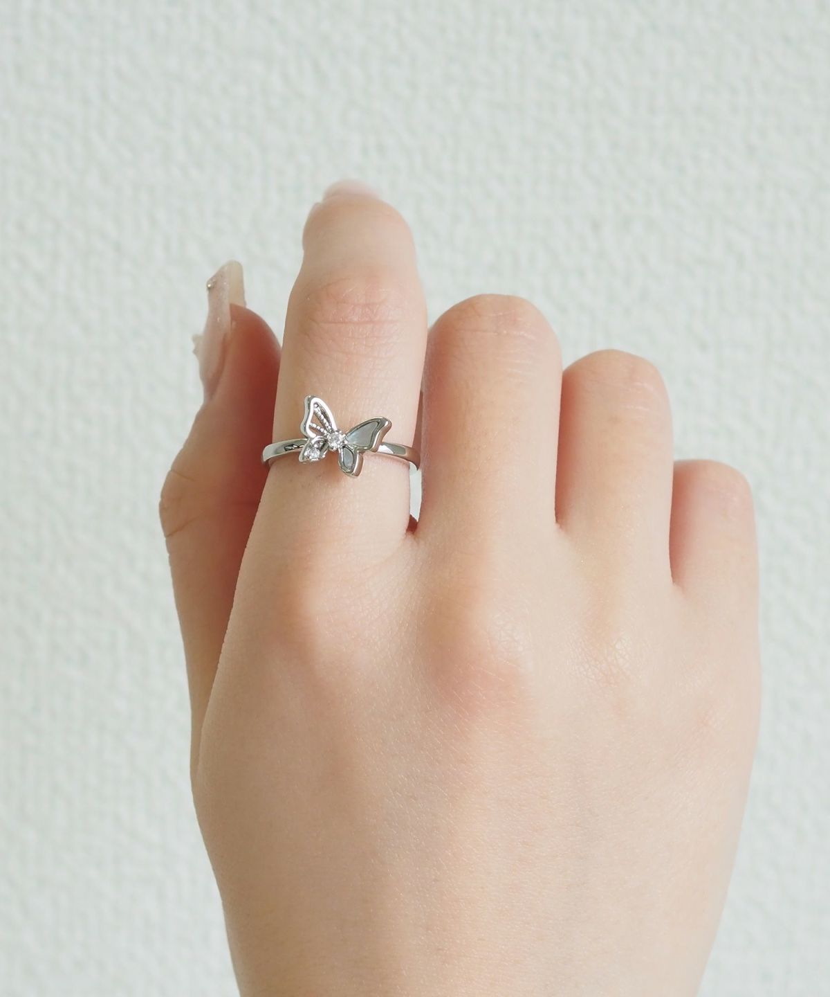 透かし模様とシェル調の輝きを纏った、大人可愛いバタフライモチーフ。サイズ調整が自由なオープンリングなので、どの指にもフィットし、贈り物としても喜ばれます。