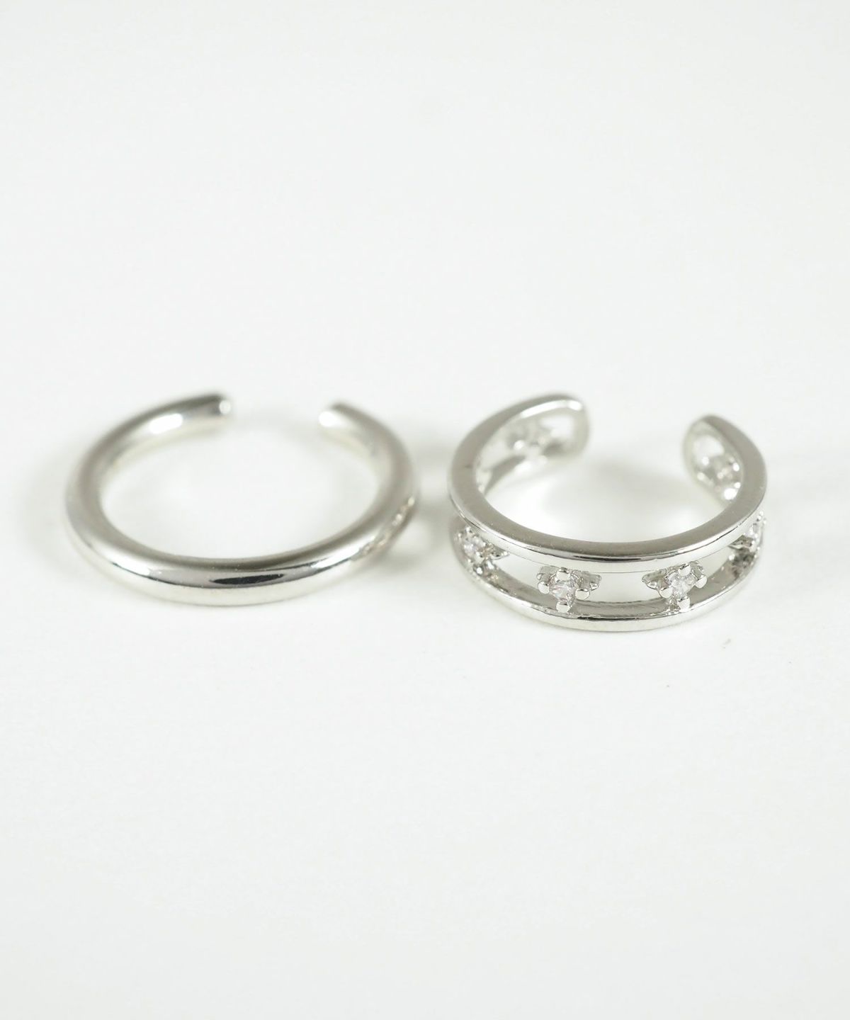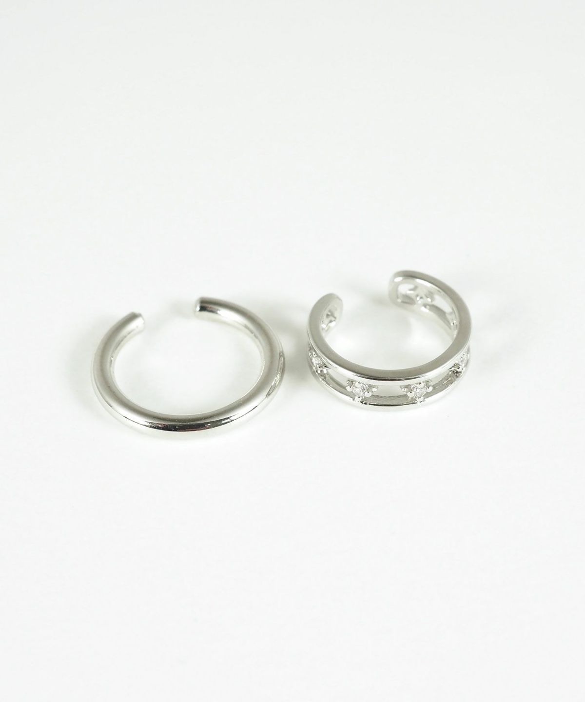 シンプルなメタルと気品あふれるクラシカルなビジューカフを組み合わせたセットイヤーカフ。シンプルなメタルカフに繊細な装飾を施したビジューカフがアンティークのような落ち着いた煌めきを放ちます。ピアスの穴の有無に関わらず楽しめ、コーデ不要でおしゃれが叶います。片耳用ですが、左右の耳にバラしてつけるのも◎。