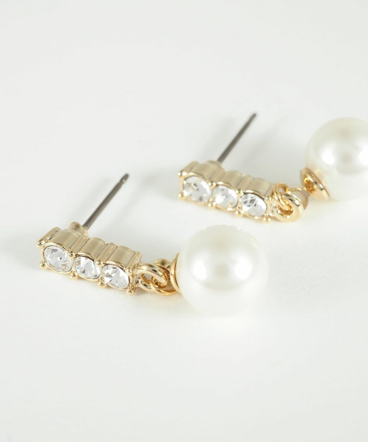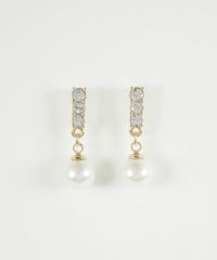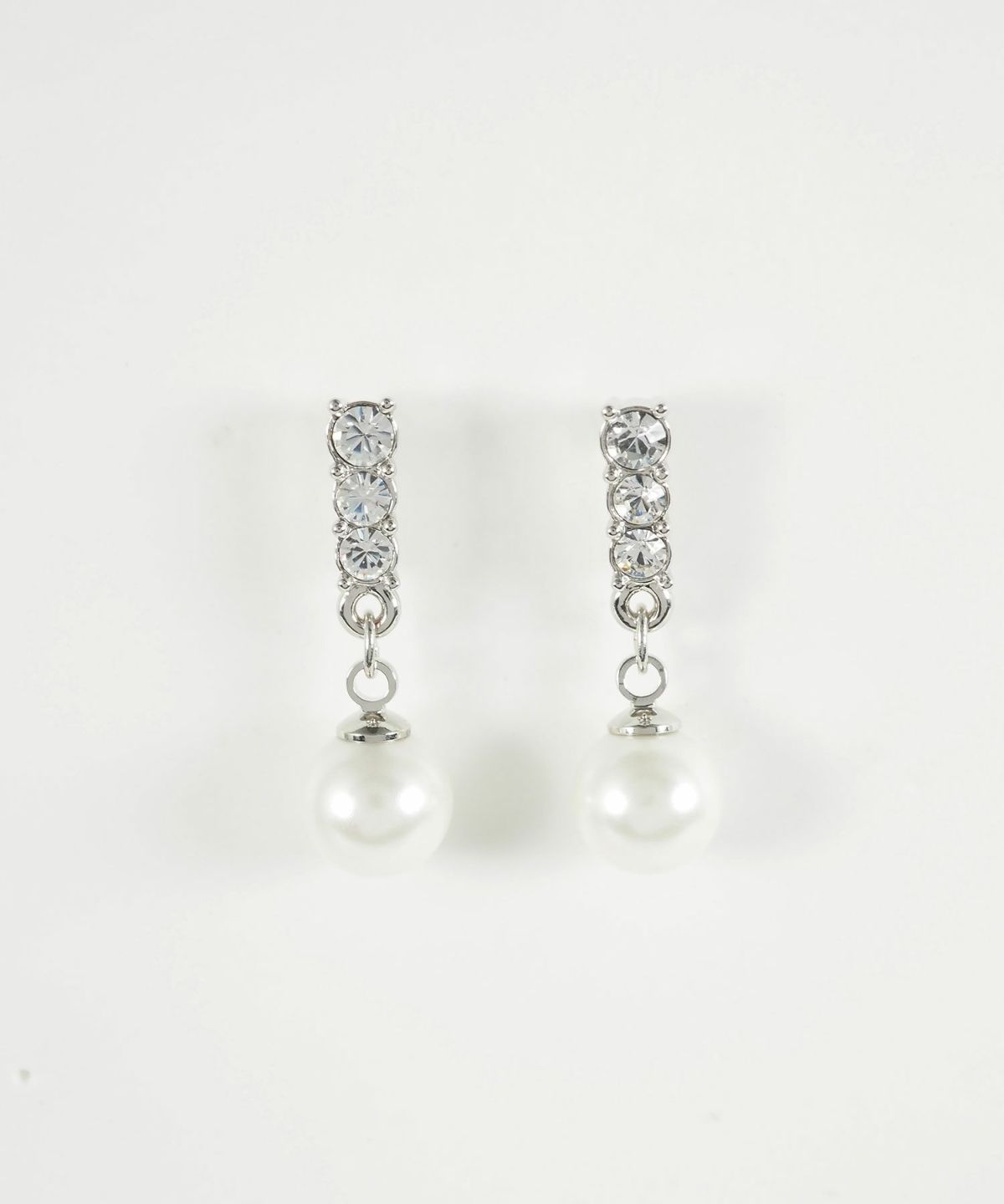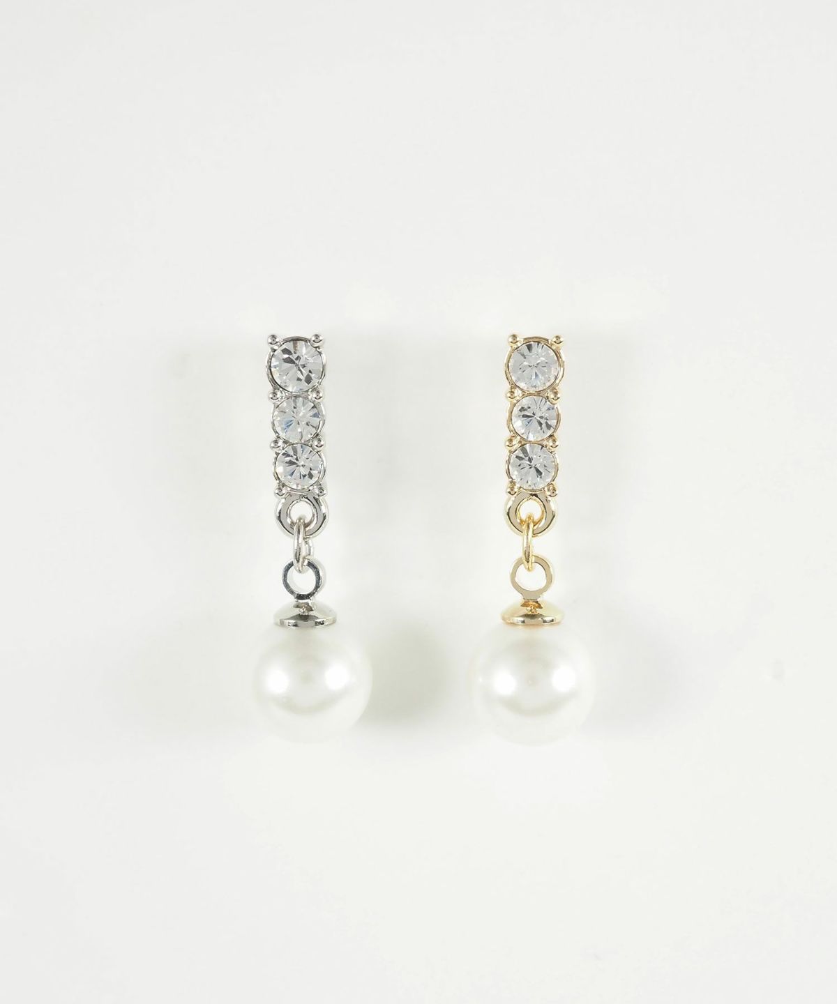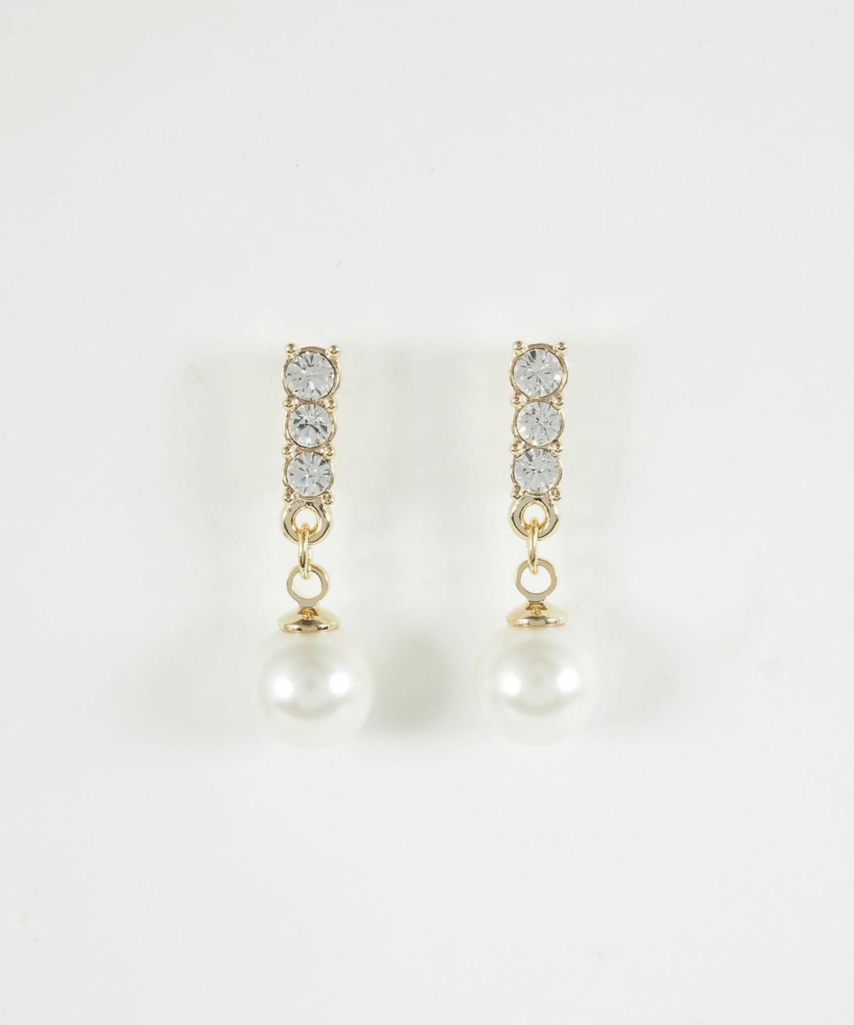 3石のビジューが耳元で繊細に煌めく、エレガントなパールピアス。縦に並んだビジューの輝きと、その先で優雅に揺れる一粒パールのコントラストが顔周りを華やかに彩ります。程よいサイズ感ながらも品格漂う佇まいで、きれいめスタイルから卒入学式、結婚式などのオケージョンシーンまで幅広く活躍。