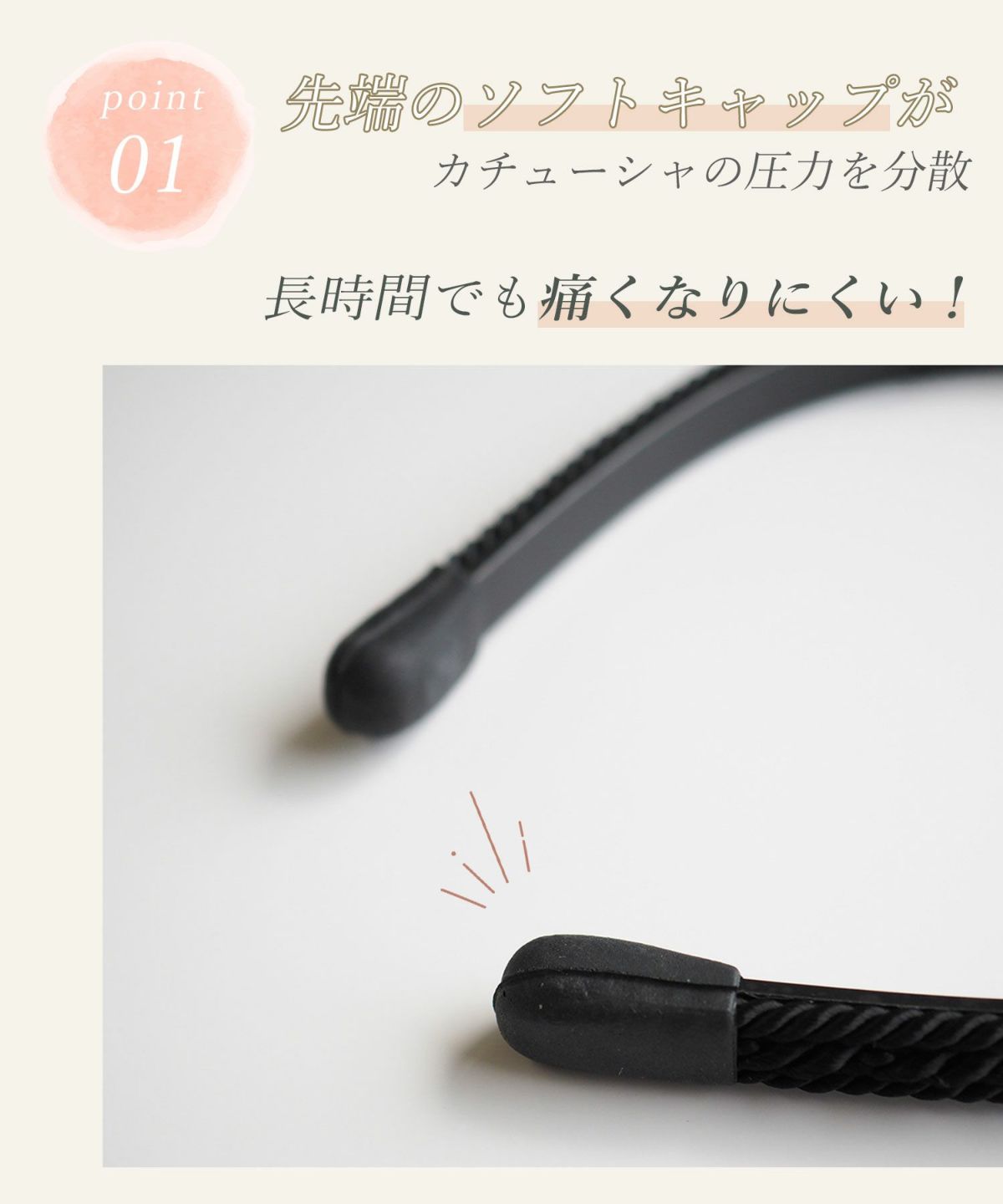 カチューシャ先端に付いたシリコン製”ソフトキャップ”がカチューシャからの圧力を分散してくれる、一日中つけていてもほとんど痛くならないカチューシャシリーズ。※着け心地には多少の個人差があります。予めご了承ください。