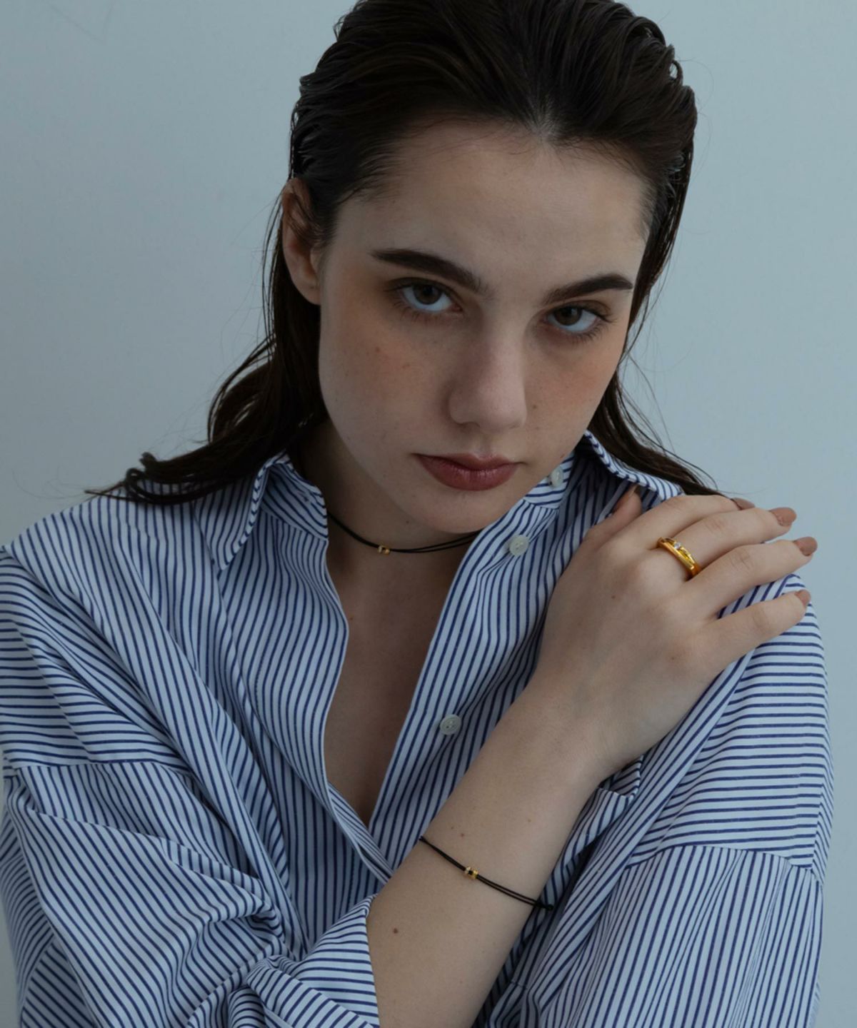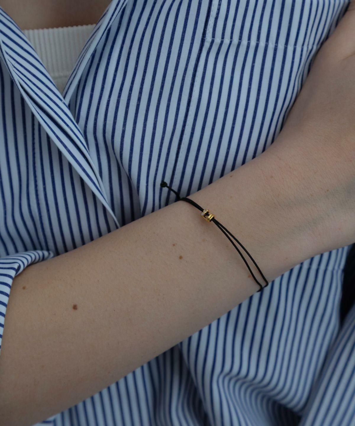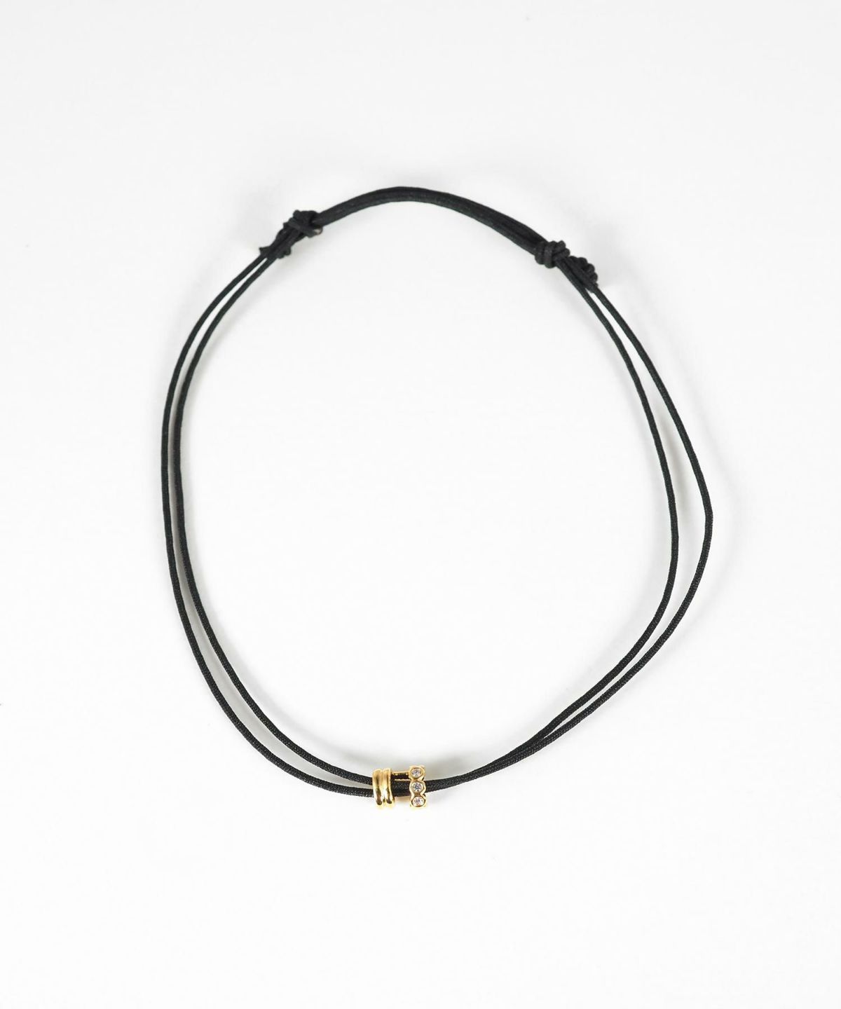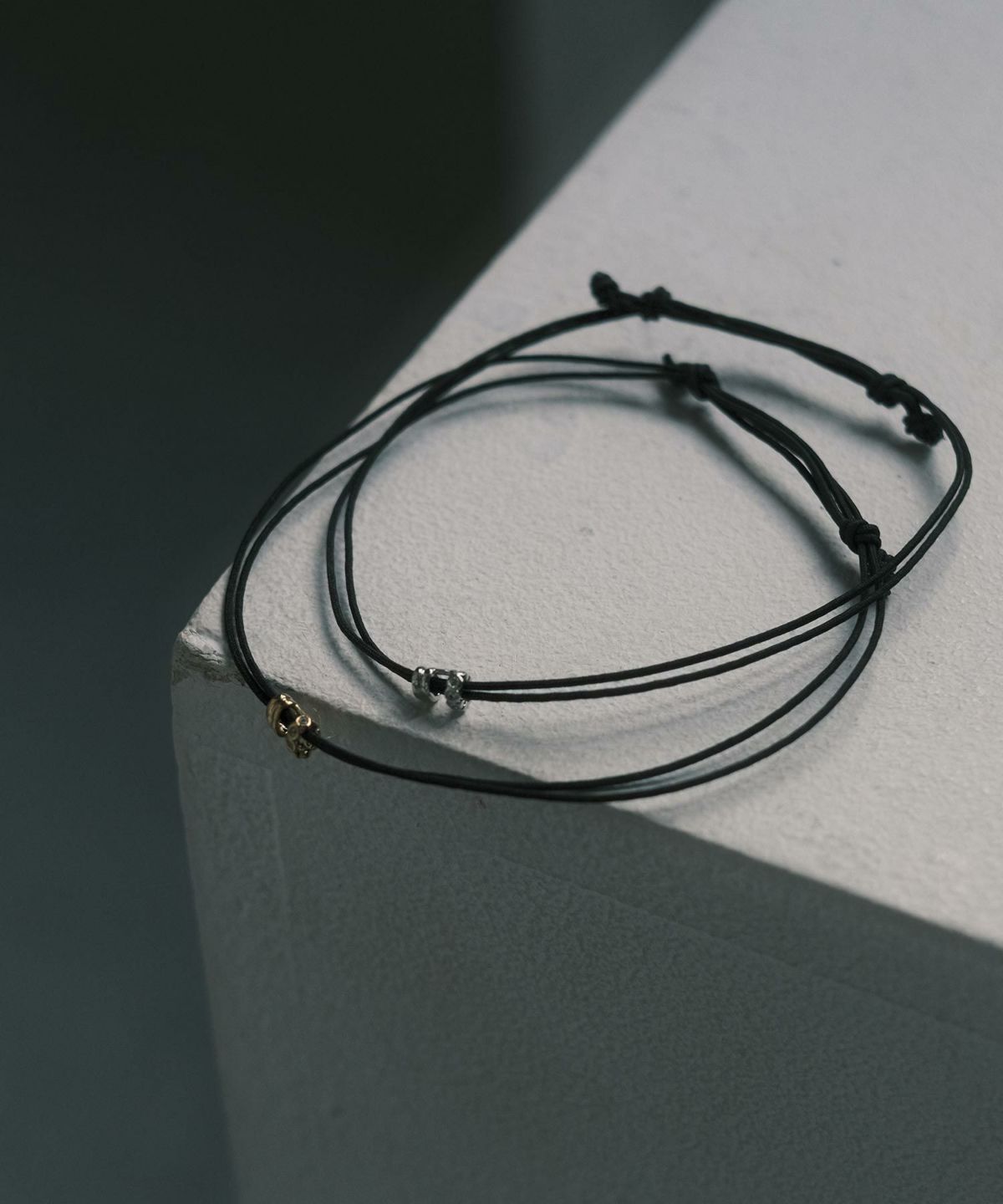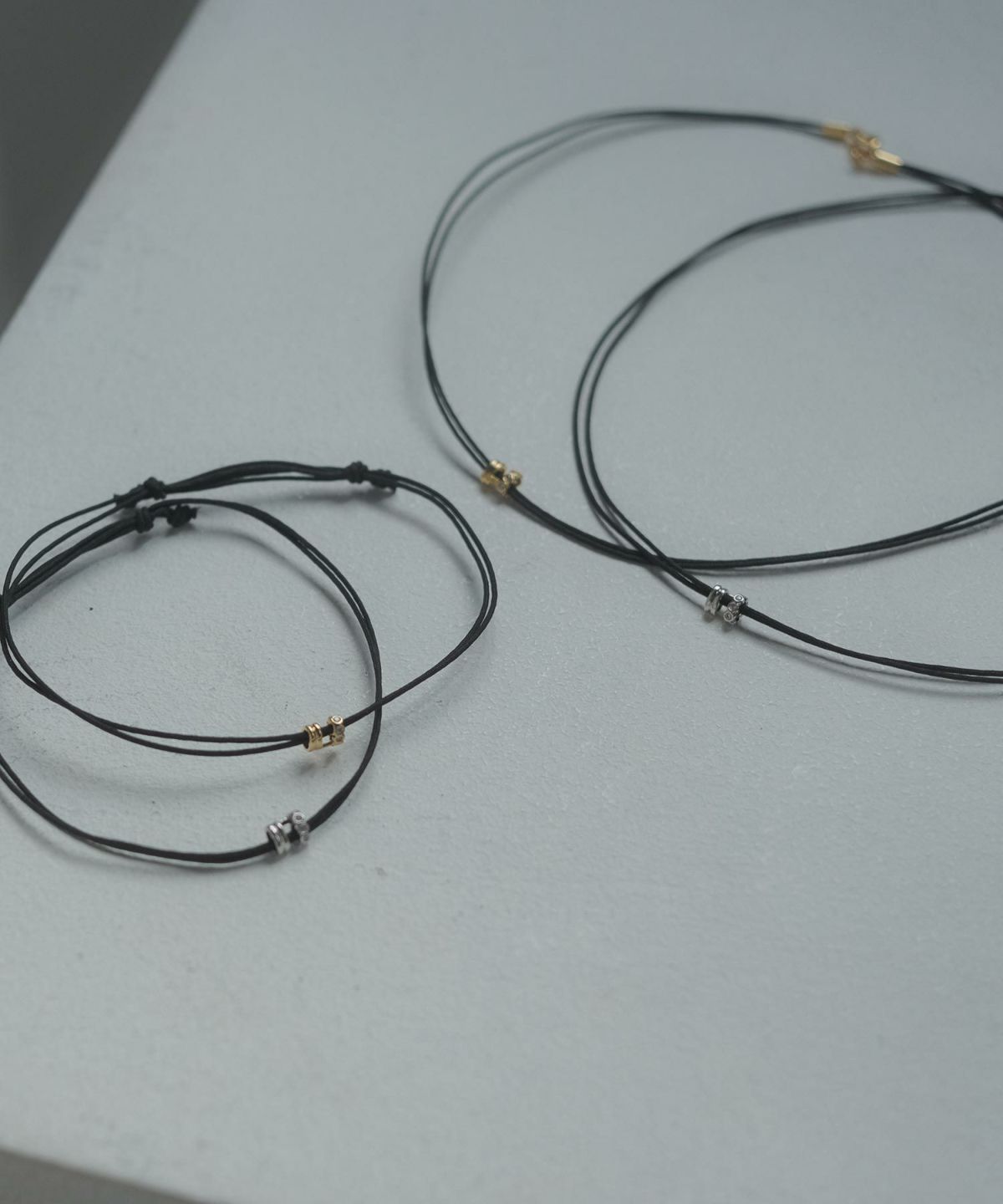 極小のモチーフと繊細なコードを組み合わせたコードブレスレット。 Tシャツなどのラフなスタイルから、クリーンなシャツスタイルまで、どんな装いにも「さりげない品」を添えてくれます。 軽やかな着け心地は、日常に寄り添うスキンアクセサリーに最適。お手持ちの時計やブレスレットとの重ね付けも、自由自在に楽しめます。