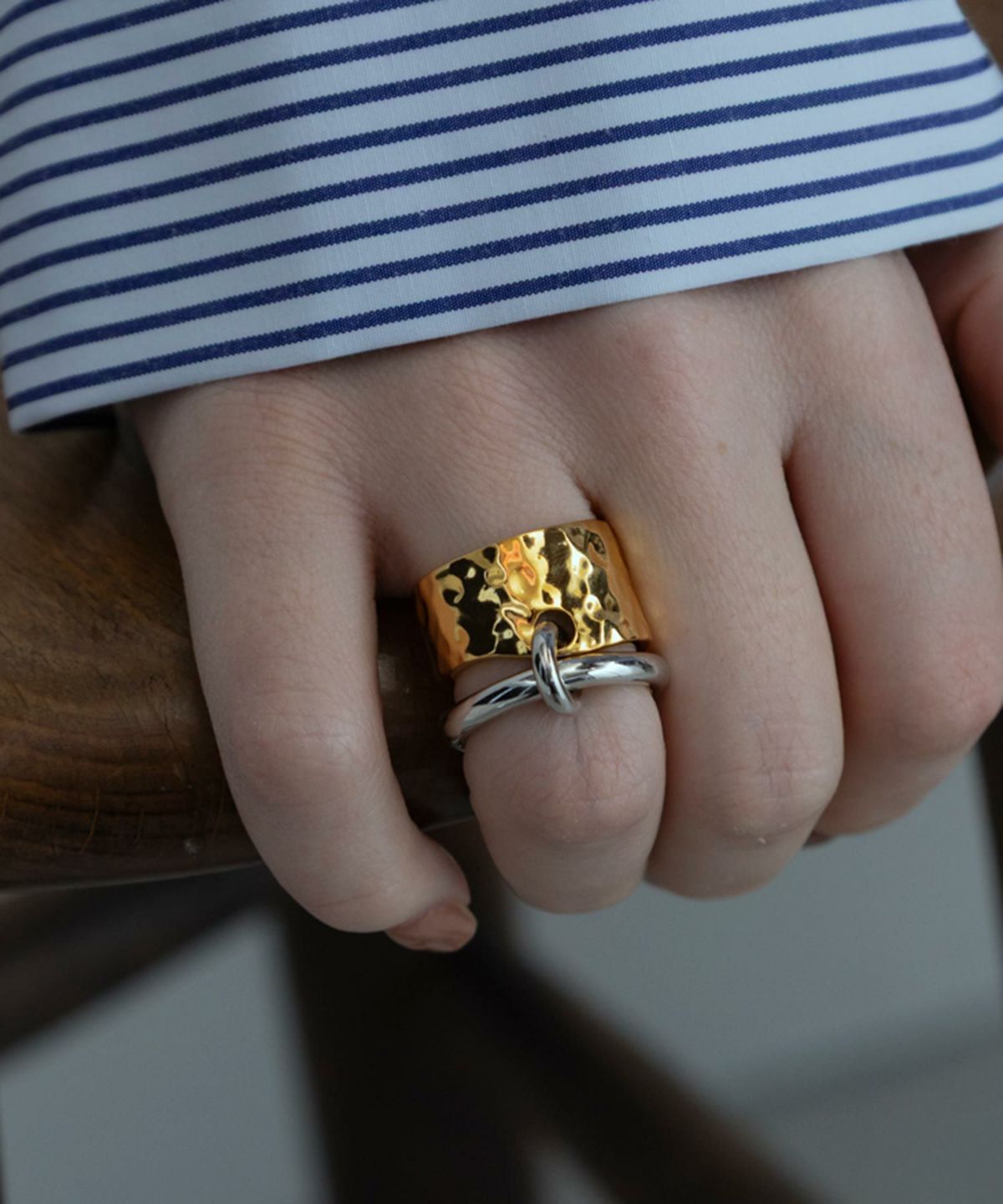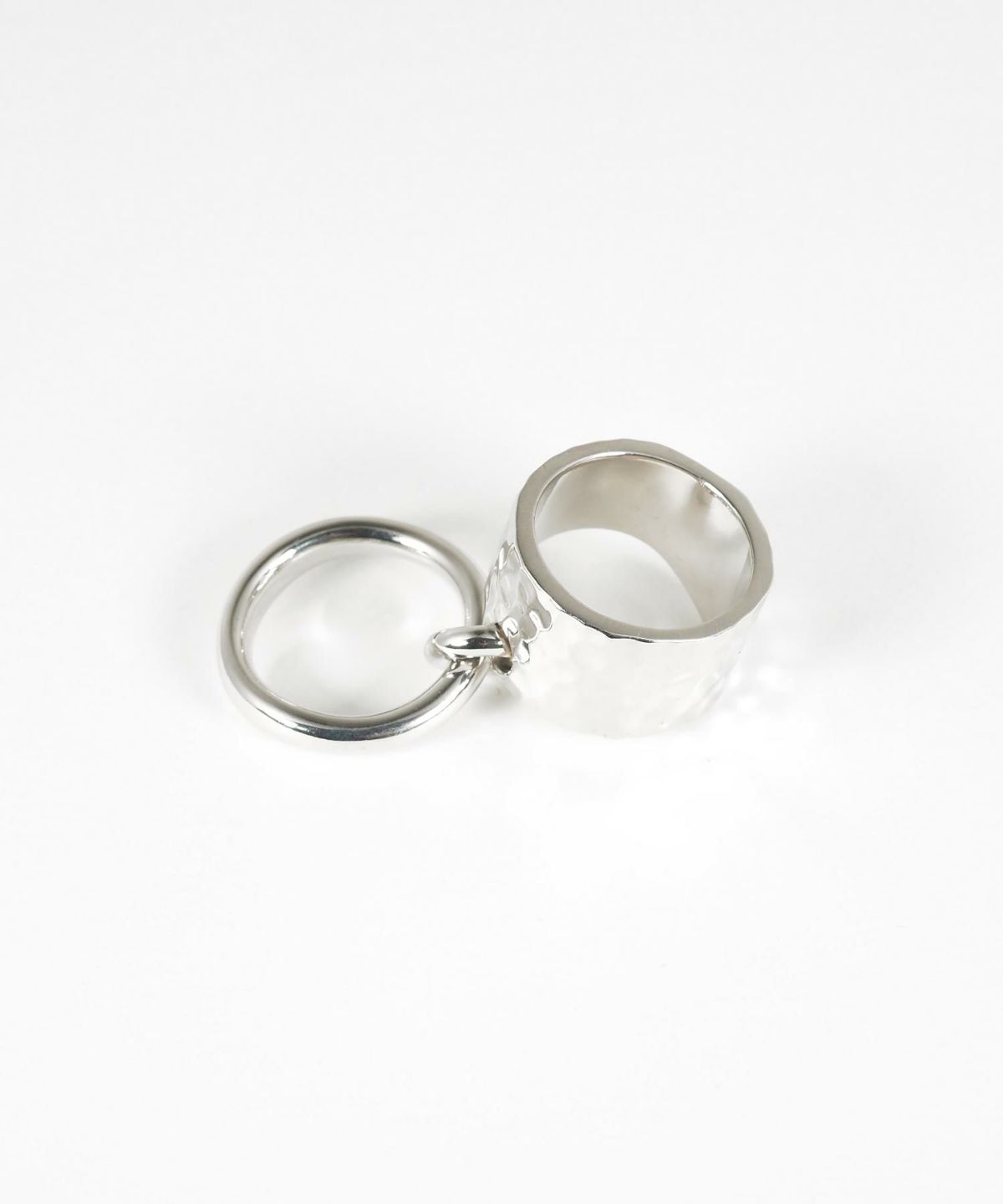 叩き出されたようなラフな質感のワイドバンドに、艶やかなリングがリンクする、独創的な連結デザイン。重厚感のあるフォルムながら、動くたびに艶めくリングが手元に軽やかなリズムを刻みます。