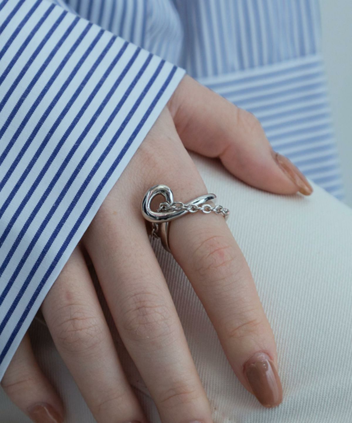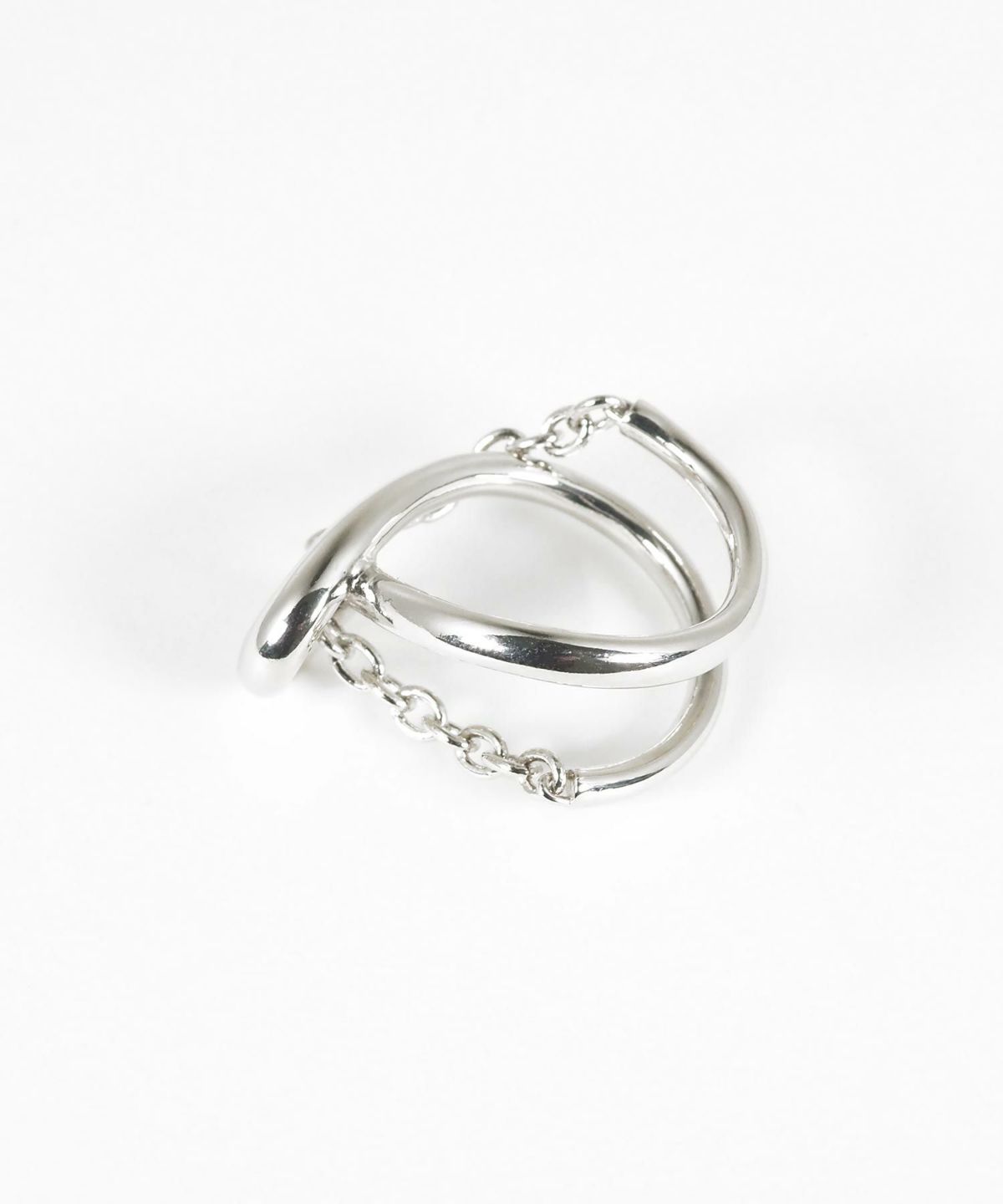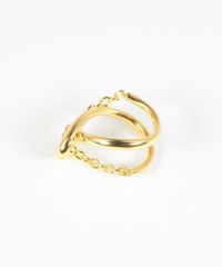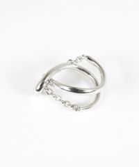 なめらかな曲線と、細やかなチェーンを組み合わせた独創的なリング。 シンプルな服に合わせるだけで、パッと目を引くおしゃれな手元が完成します。