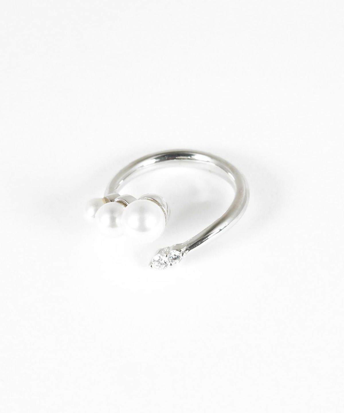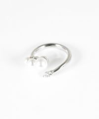 大きさが違う3つのパールと、キラリと光る小さな石を組み合わせたハグリング。普段のシャツやニットに合わせるだけで、手元がパッと明るく、上品な印象に変わります。