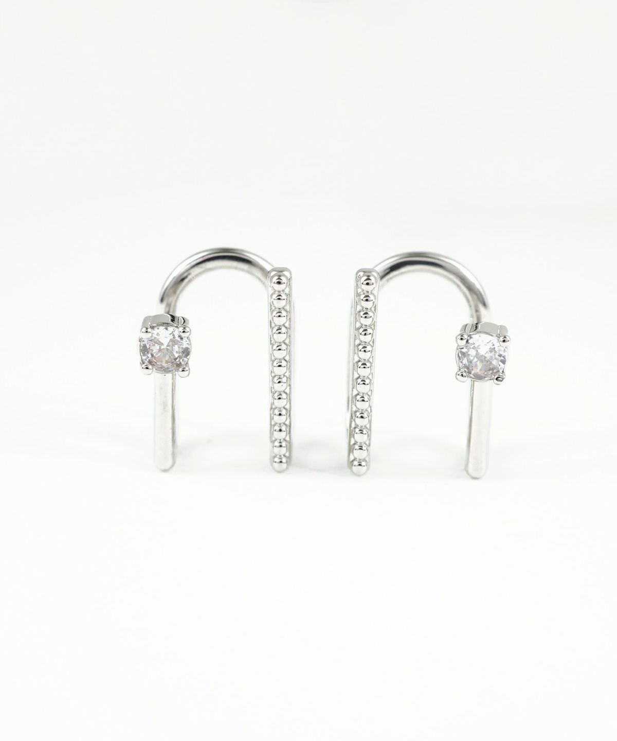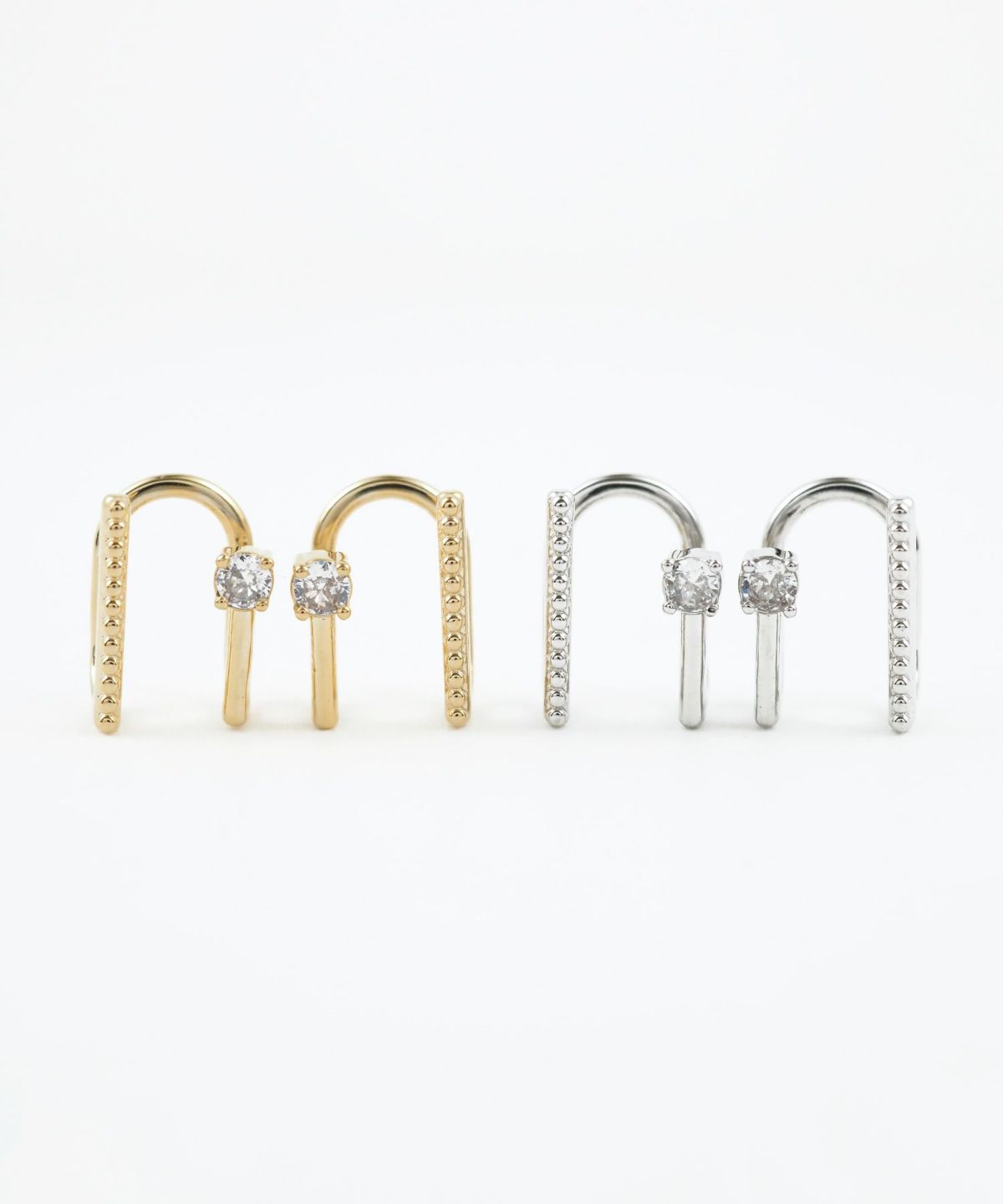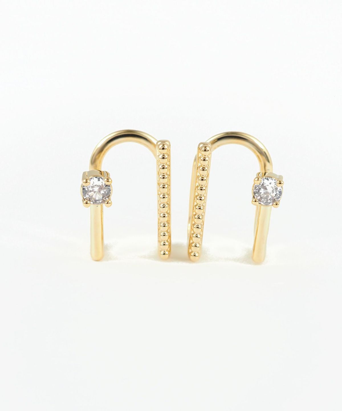重ね付け風のデザインが魅力のラウンドメタルイヤリング。一石のクリアビジューが輝くシンプルなラインと、繊細な粒状の装飾を施したクラシカルなライン。2本のラインの立体的なデザインが、いつものカジュアルコーデに「こなれ感」をプラスしてくれます。