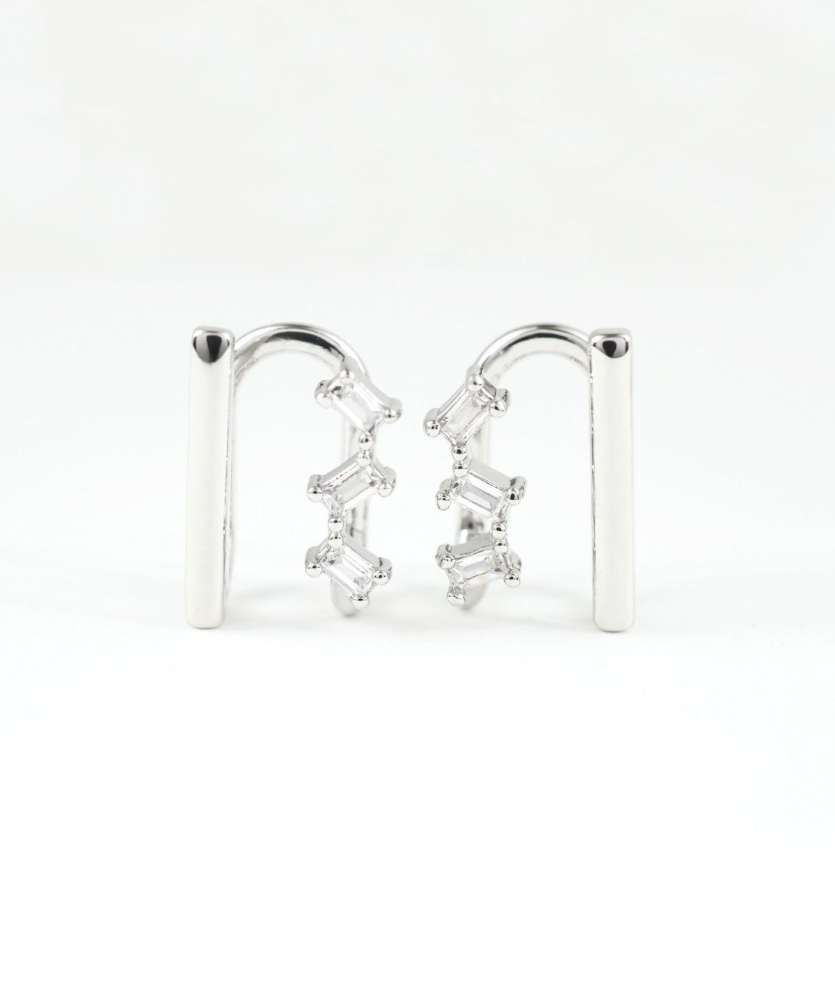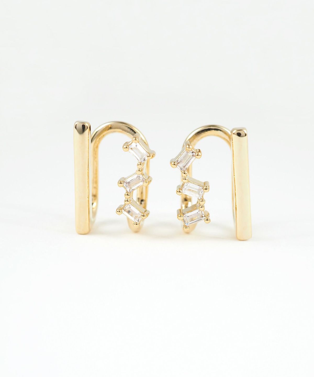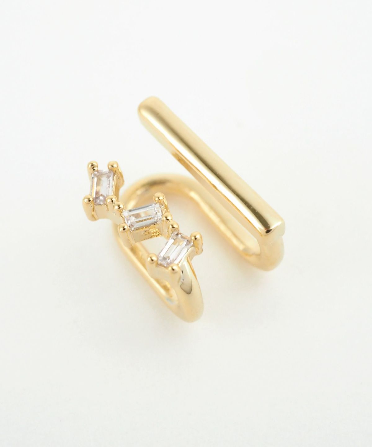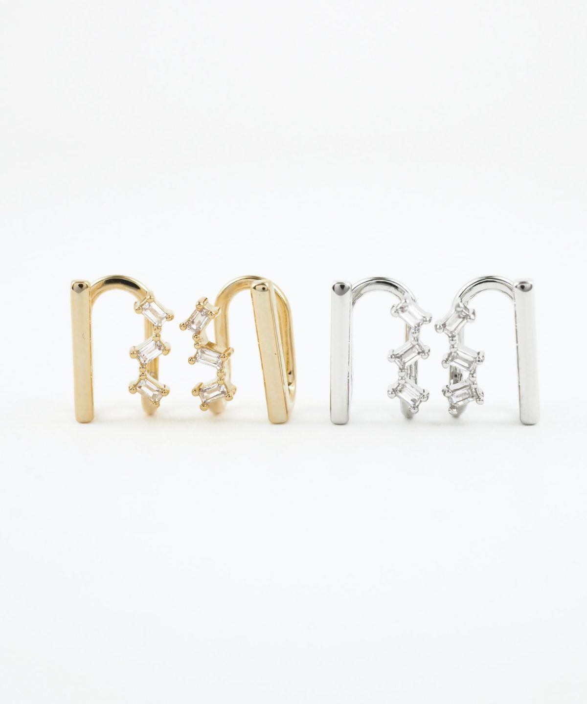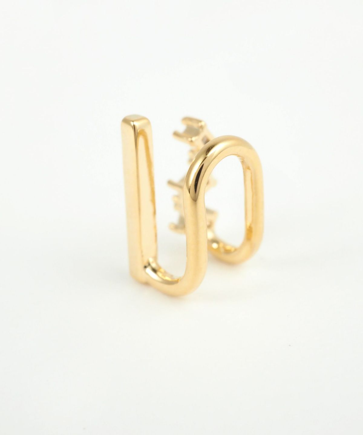 重ね付け風のデザインが魅力のラウンドメタルイヤリング。無機質なメタルの質感と、階段状に配置されたビジューが、耳元に立体感と奥行きを与えます。いつものカジュアルコーデに「こなれ感」をプラスしてくれるアイテムです。