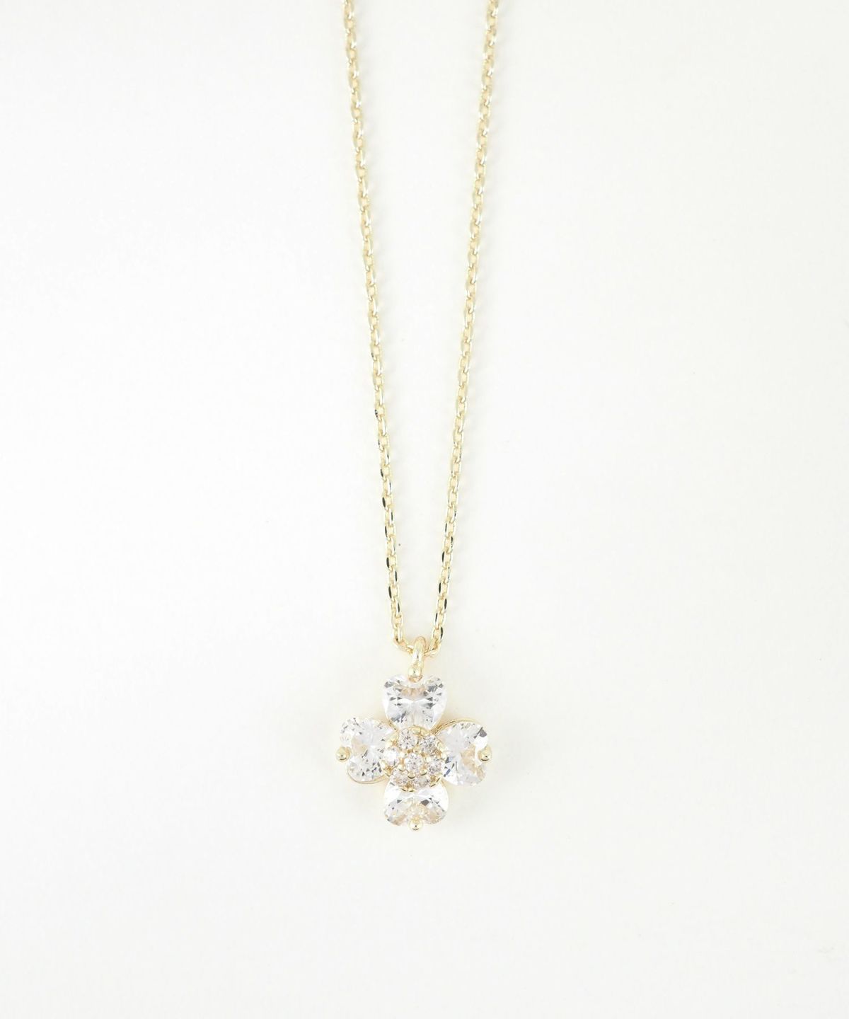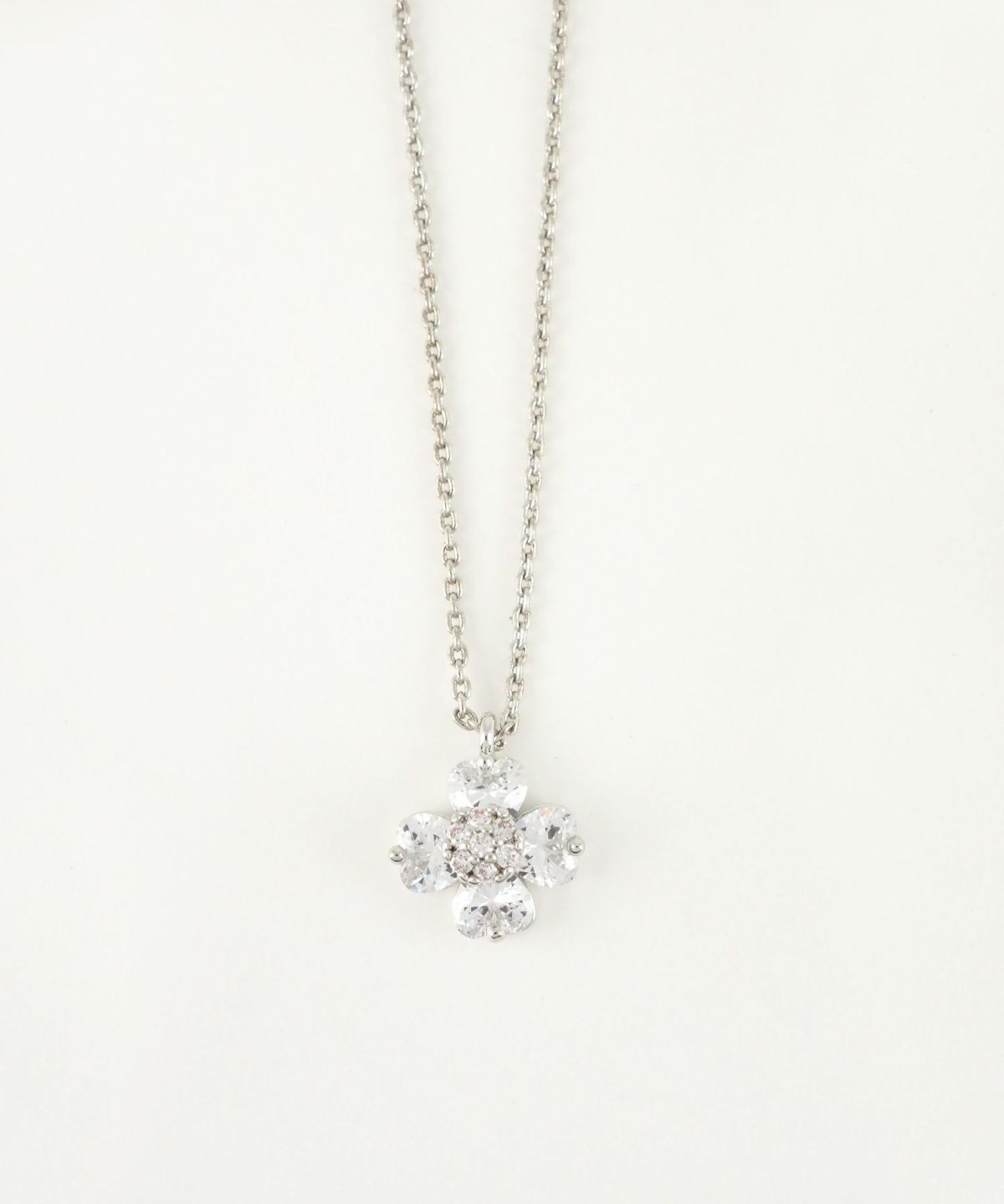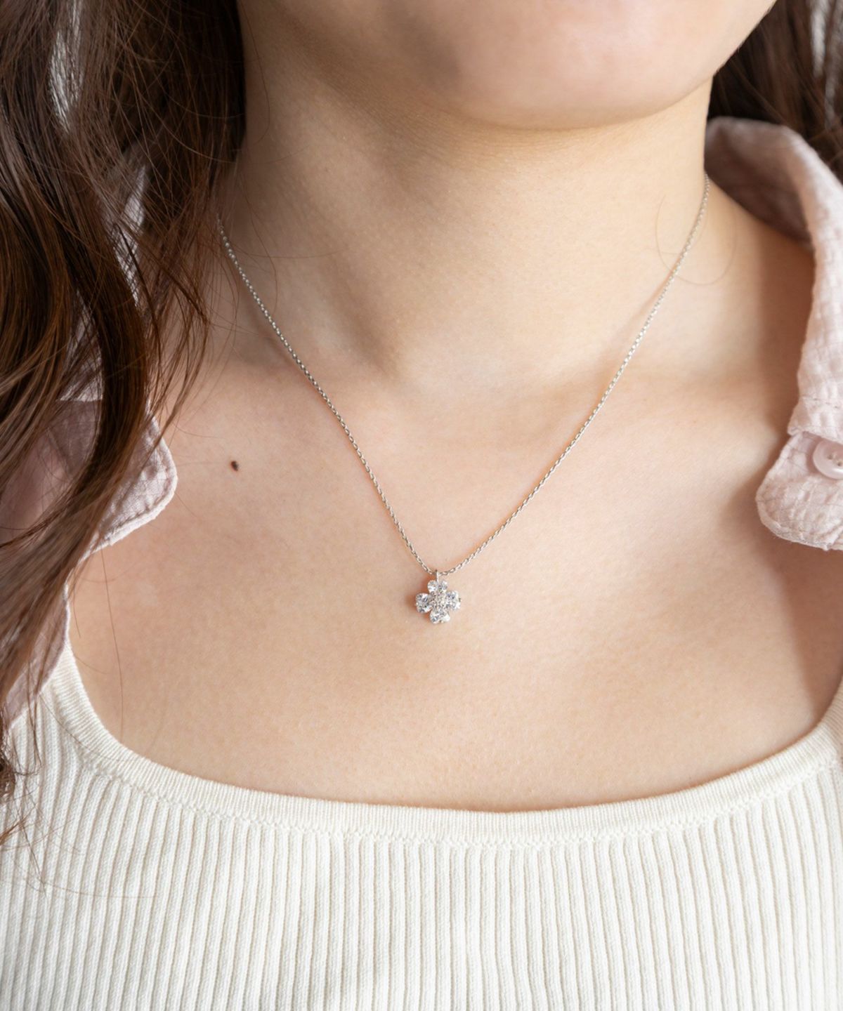 四つ葉のクローバーを、煌めくストーンで華やかに表現したネックレス。キュービックジルコニアでかたどった立体的なフォルムが、胸元に気品ある輝きを添えます。「幸運」を象徴するモチーフは、お守りジュエリーとしてはもちろん、大切な方へのギフトにも最適。デイリーからオフィスシーンまで、装いを選ばず日常を彩ります。