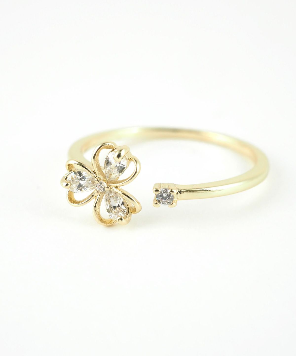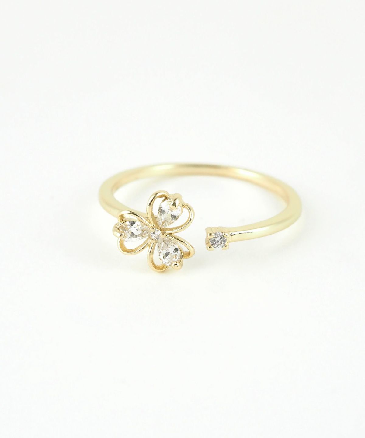 指先を美しく見せる、絶妙なバランスのオープンリング。 ミニマムな三つ葉モチーフと一粒ストーンが、指元に「抜け感」と華やかさをプラスします。 重ね付けもしやすい細身のラインなので、お手持ちのアクセサリーとのコーディネートも自由自在です。
