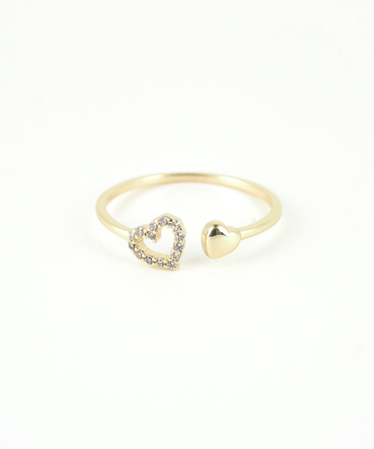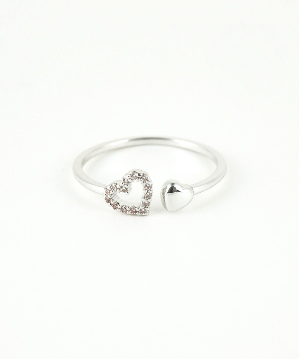 繊細に輝くオープンハートと、コロンとしたフォルムが愛らしいメタルハートをあしらったオープンリング。一石ずつ丁寧に敷き詰められたキュービックジルコニアが、光を反射して手元を華やかに演出。対照的なメタルの光沢感が、甘すぎない洗練された印象を与えます。